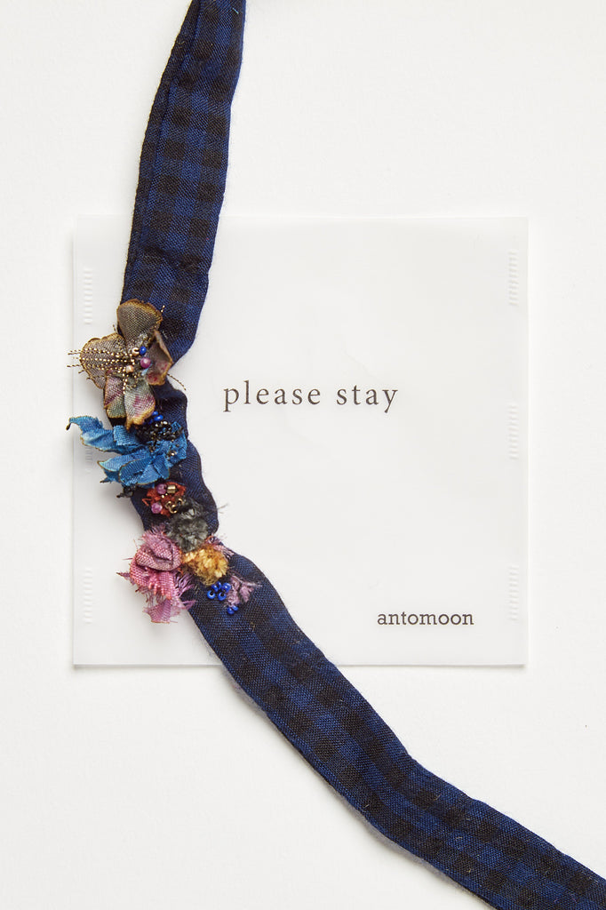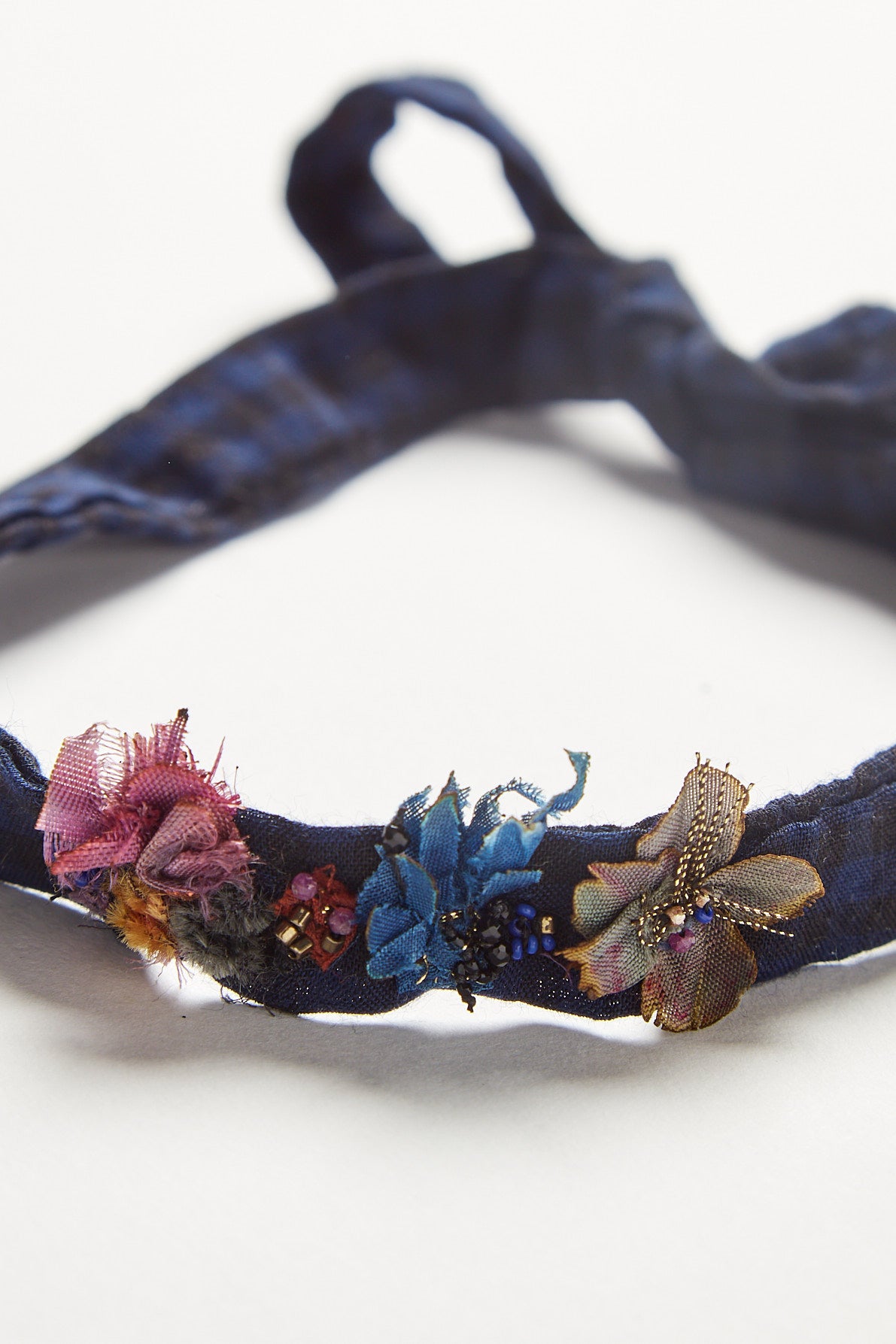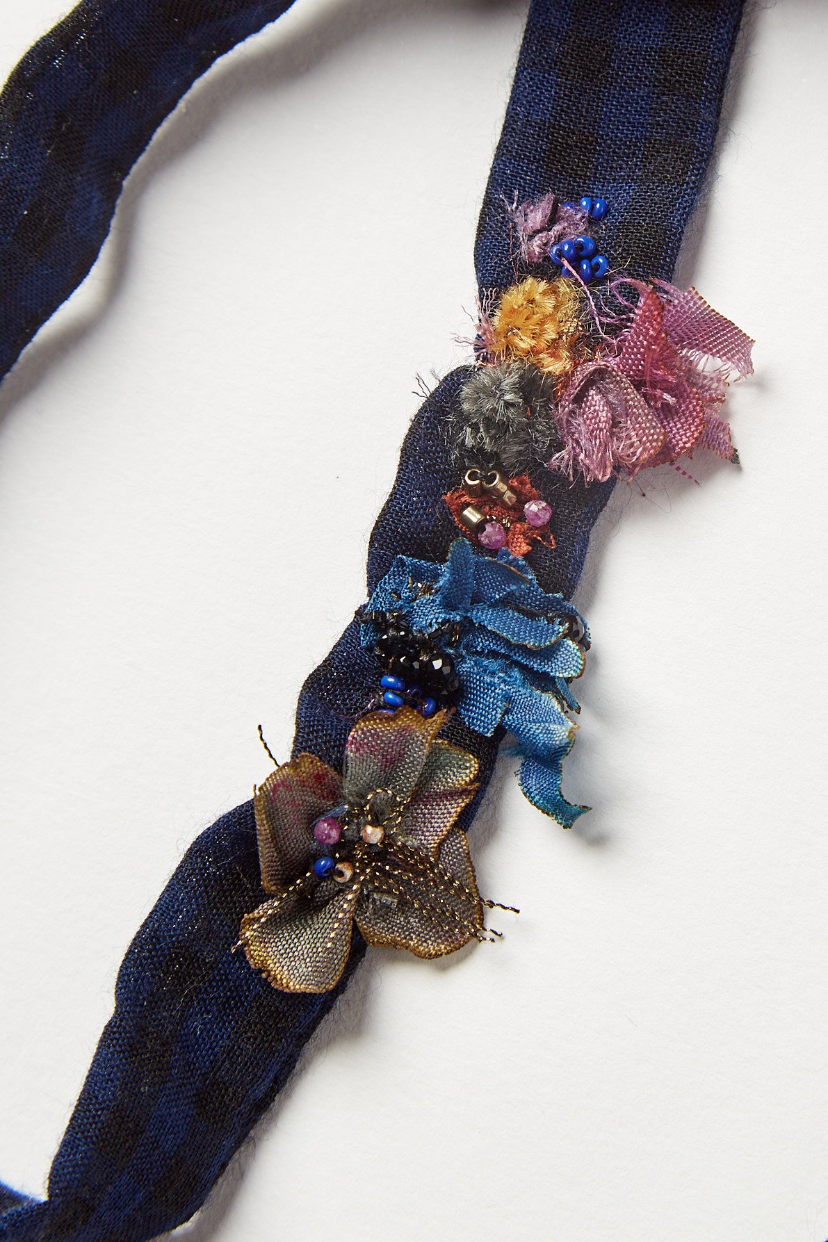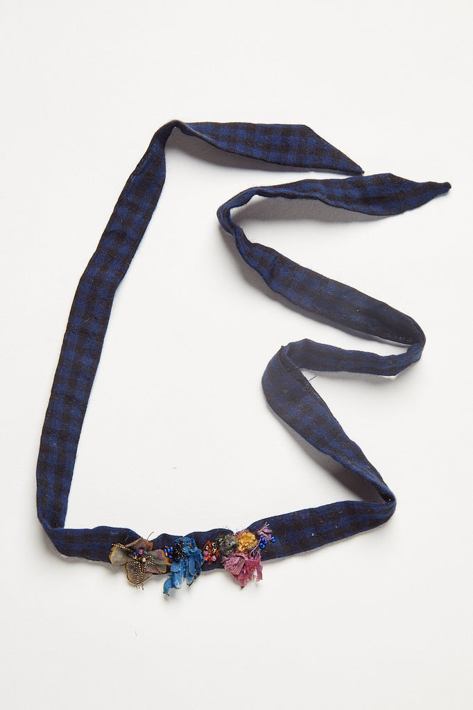 Chocker in tessuto di cotone giapponese a quadretti blu e neri, con ricami perline e fiori multicolore in tessuto, interamente fatto a mano.