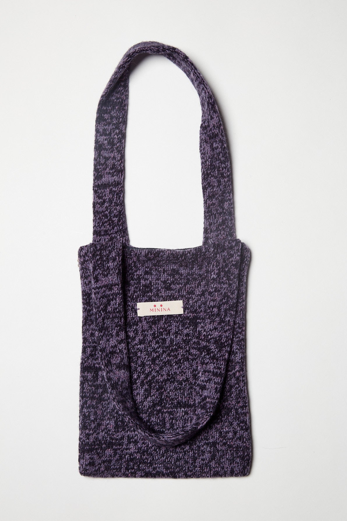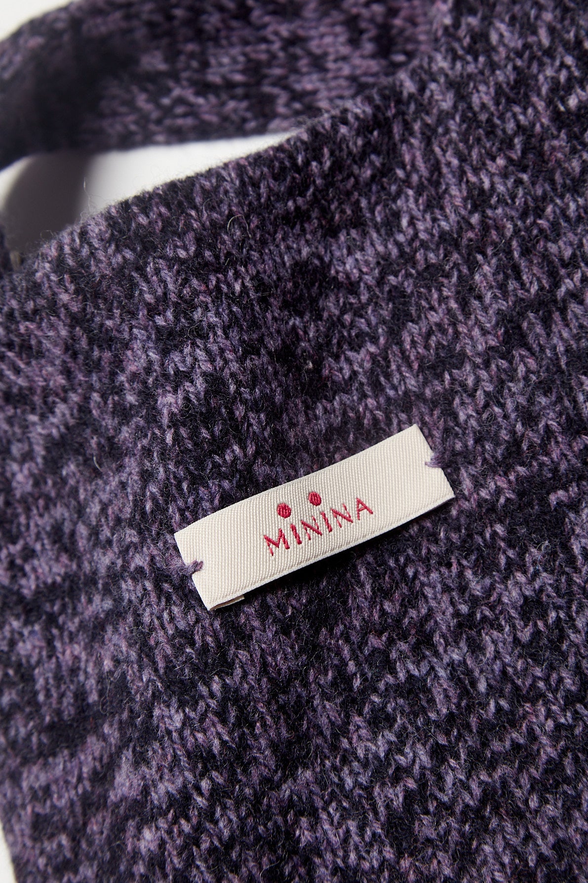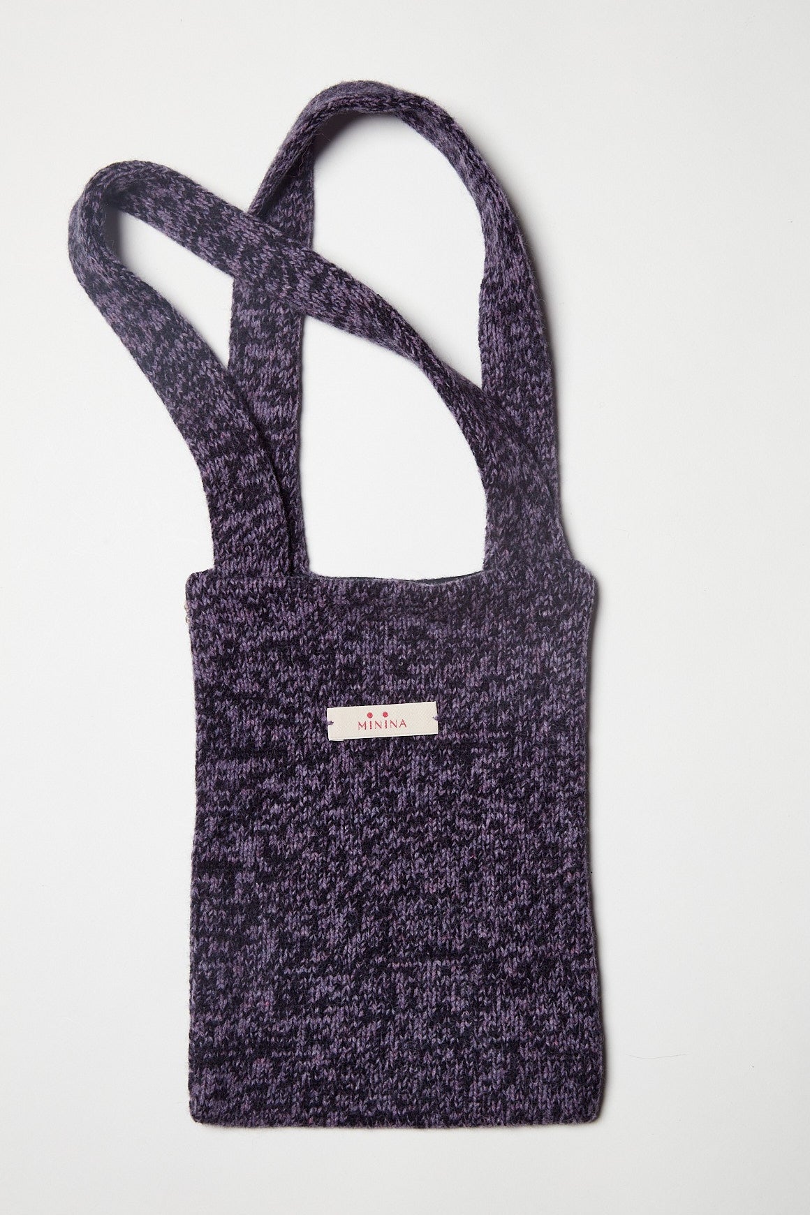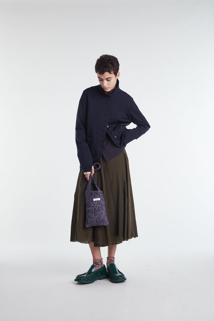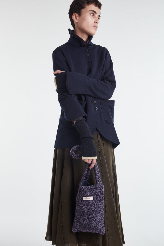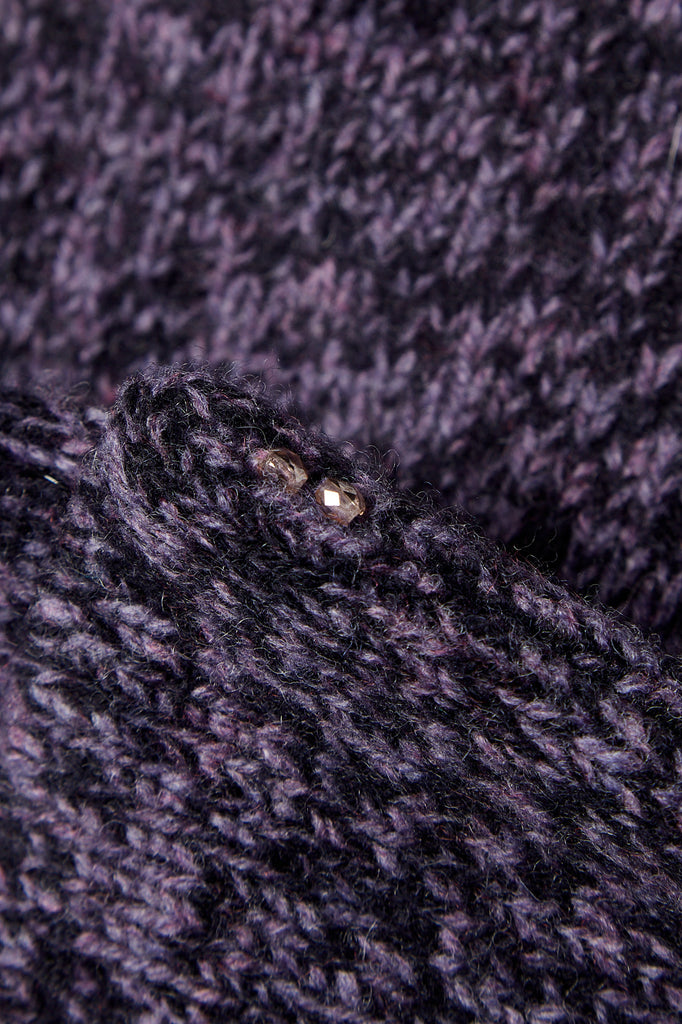 Borsina in lana kent, lavorazione rasata effetto mouliné color lavanda mélange e blu notte, foderata in puro cotone in tinta. Presenta due piccoli cristalli ricamati a mano sul lato come tratto distintivo.