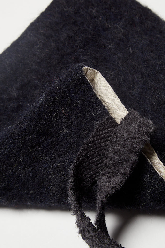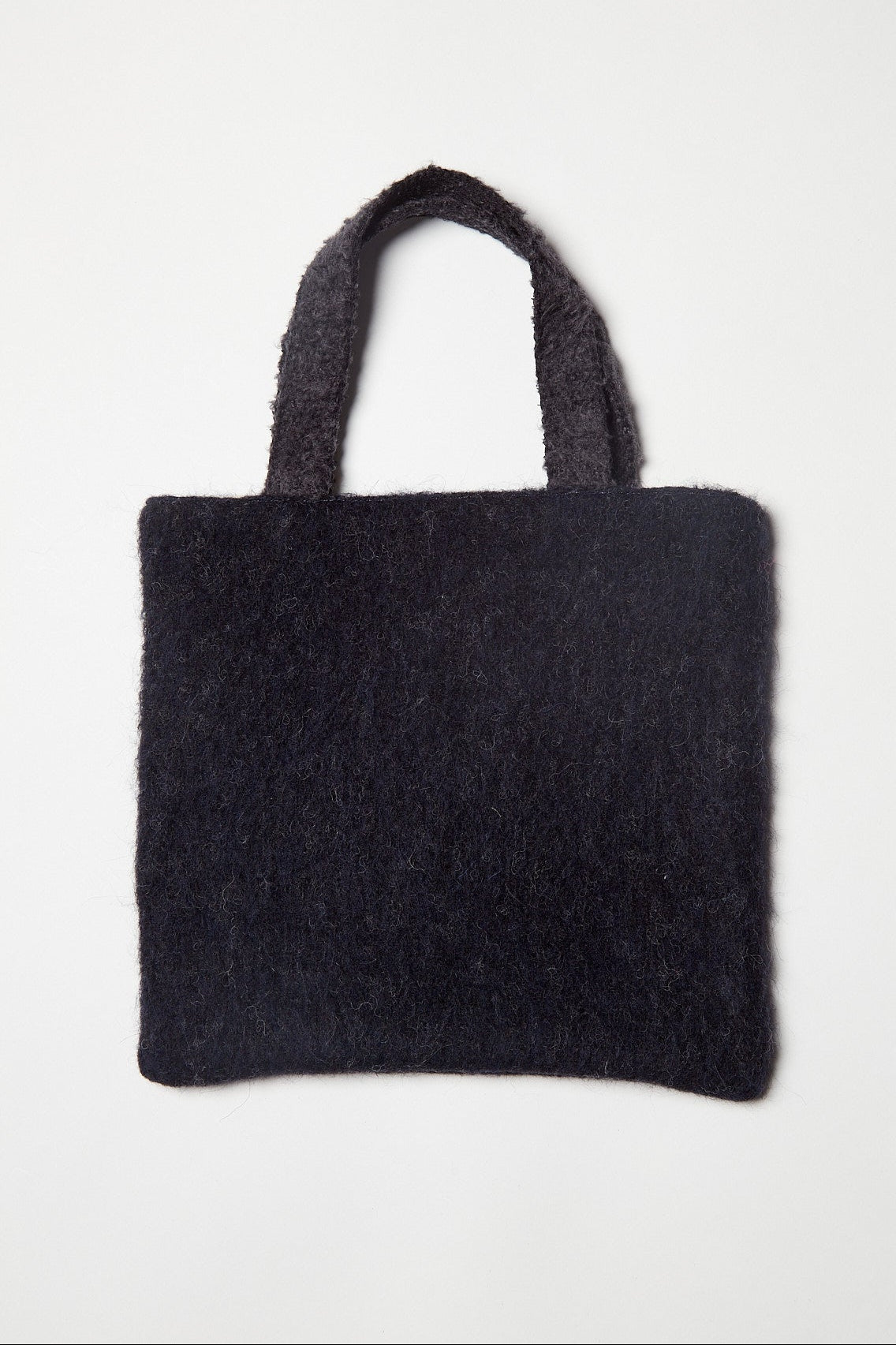 Mini borsina in morbida lana dal pelo lungo color blu notte con manico corto in caldo cotone grigio antracite, foderata in tela. Questo prodotto è stato realizzato con selezionati tessuti riciclati dalla nostra collezione.