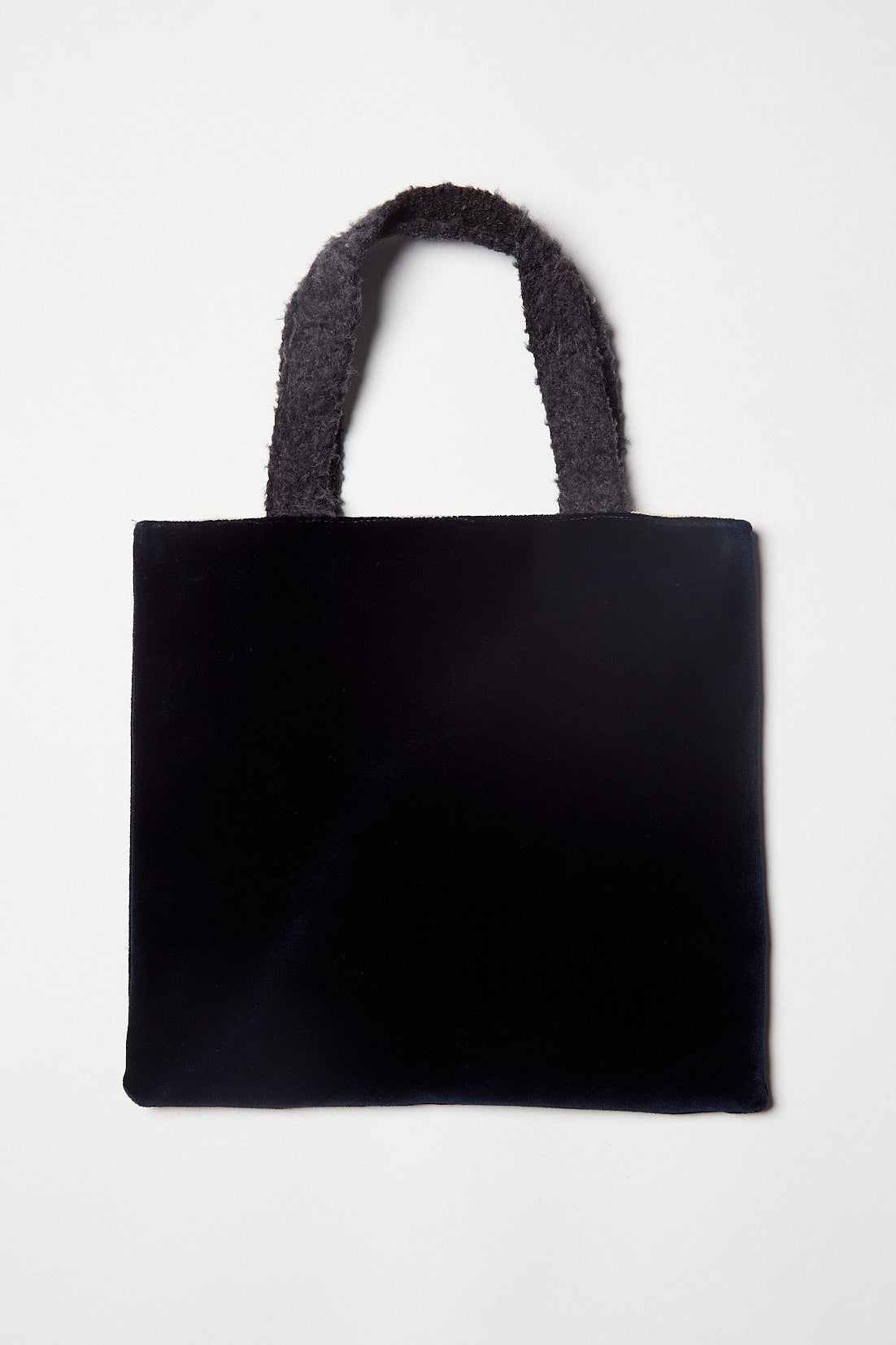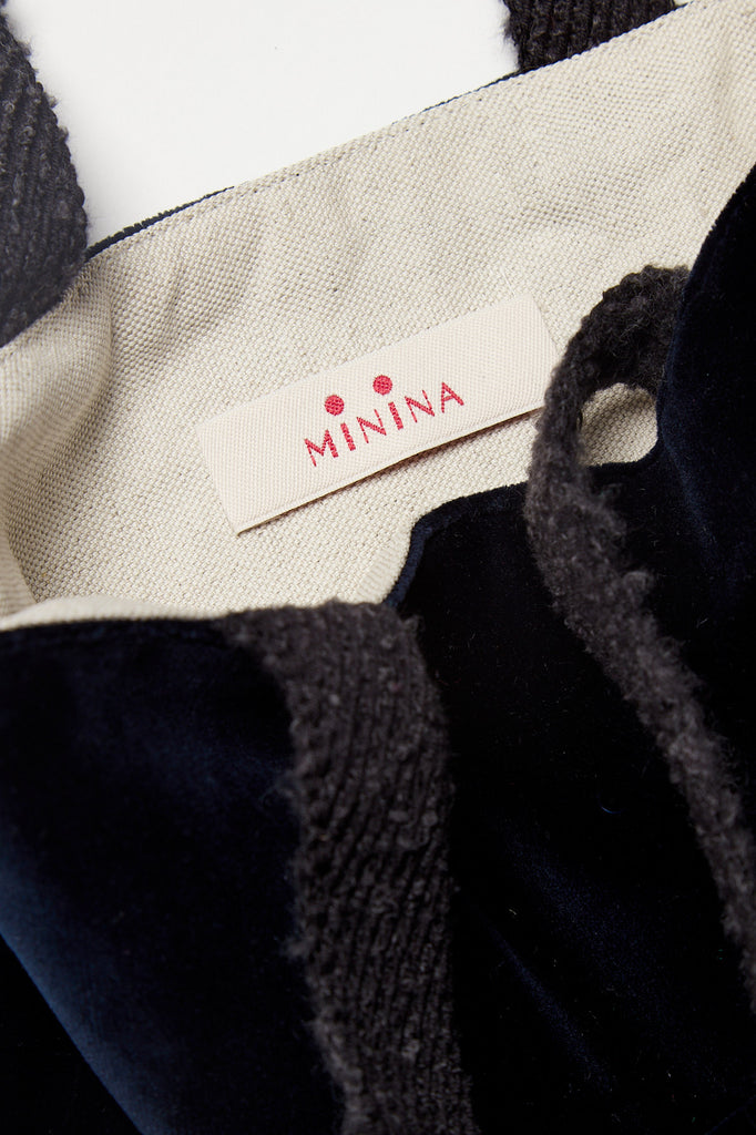 Mini borsina in pregiato velluto di cotone liscio color blu notte con manico corto in caldo cotone grigio antracite, foderata in tela. Questo prodotto è stato realizzato con selezionati tessuti riciclati dalla nostra collezione.