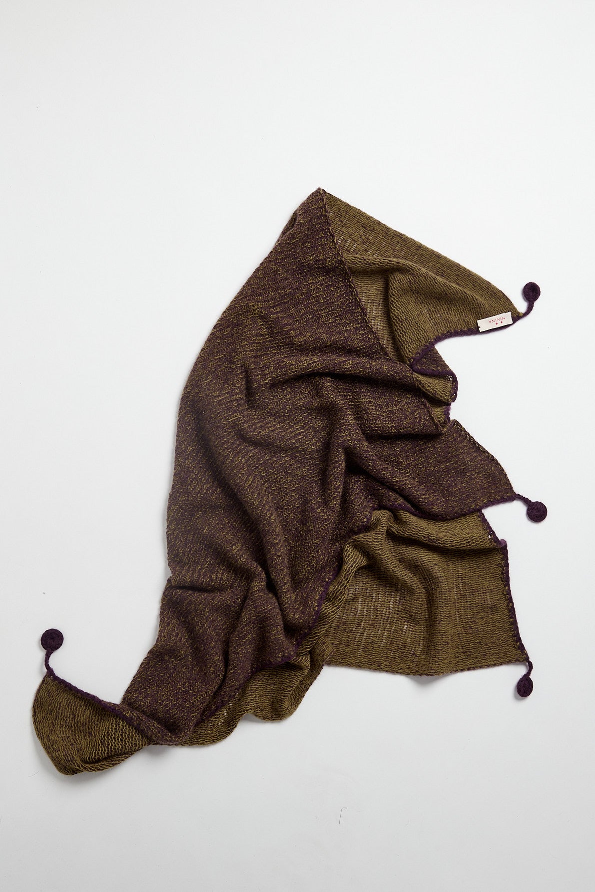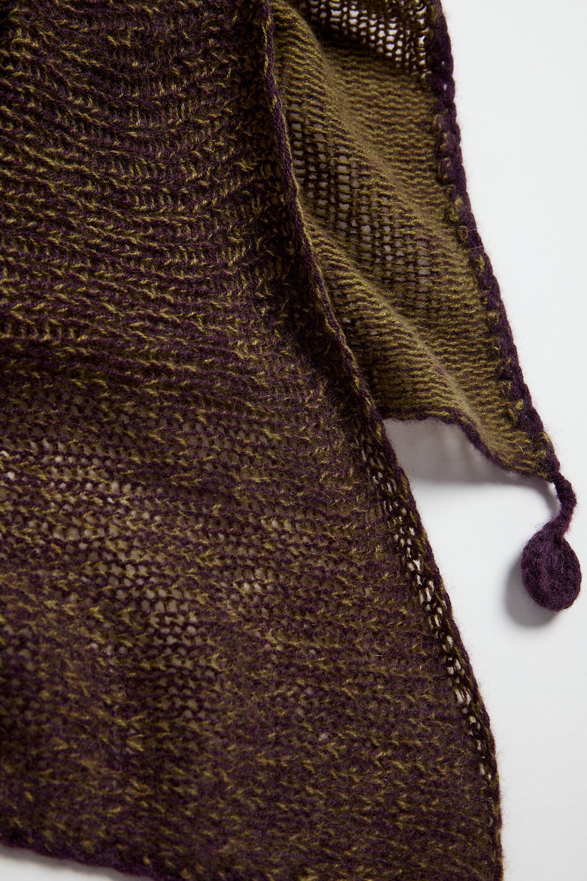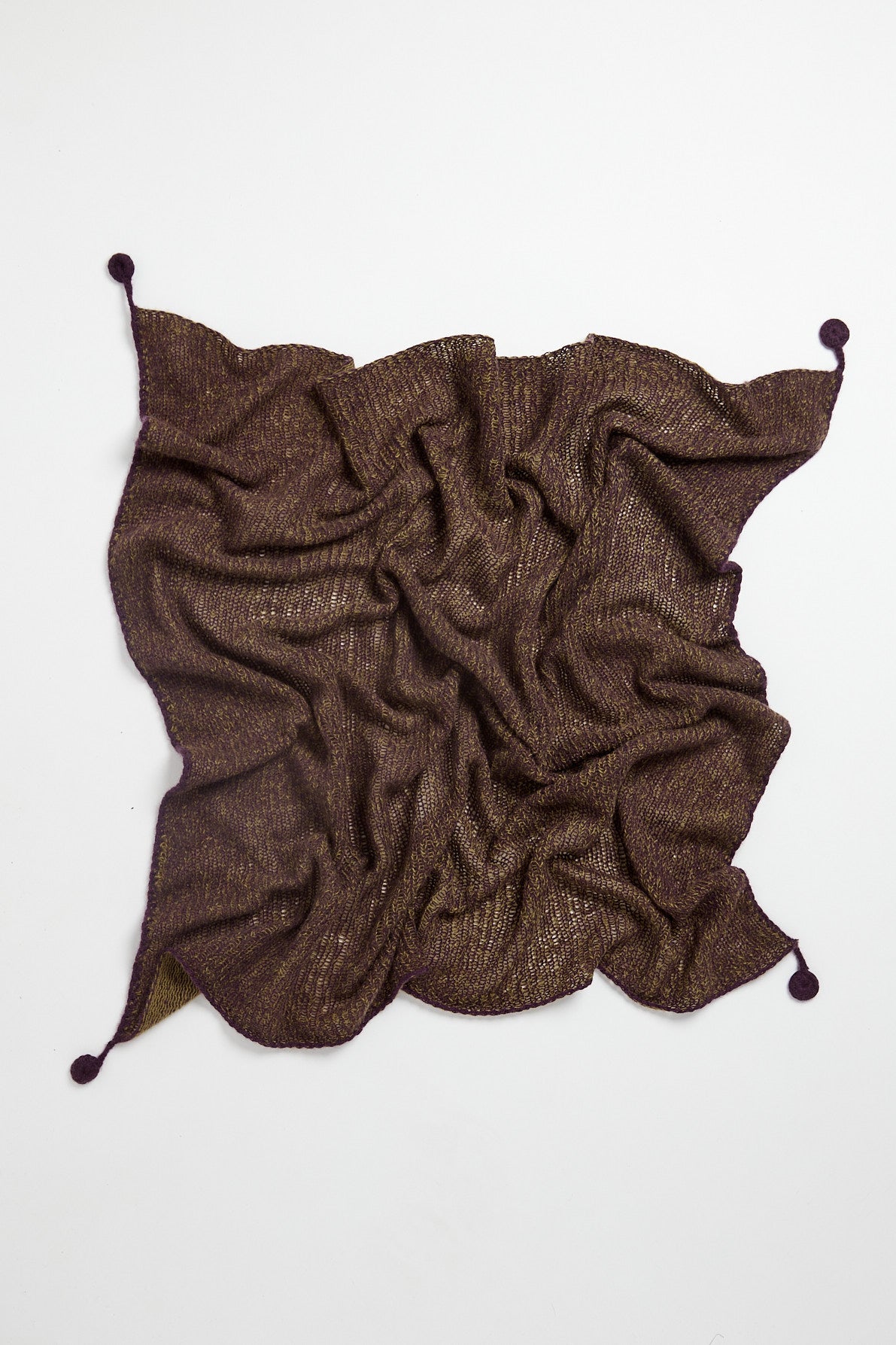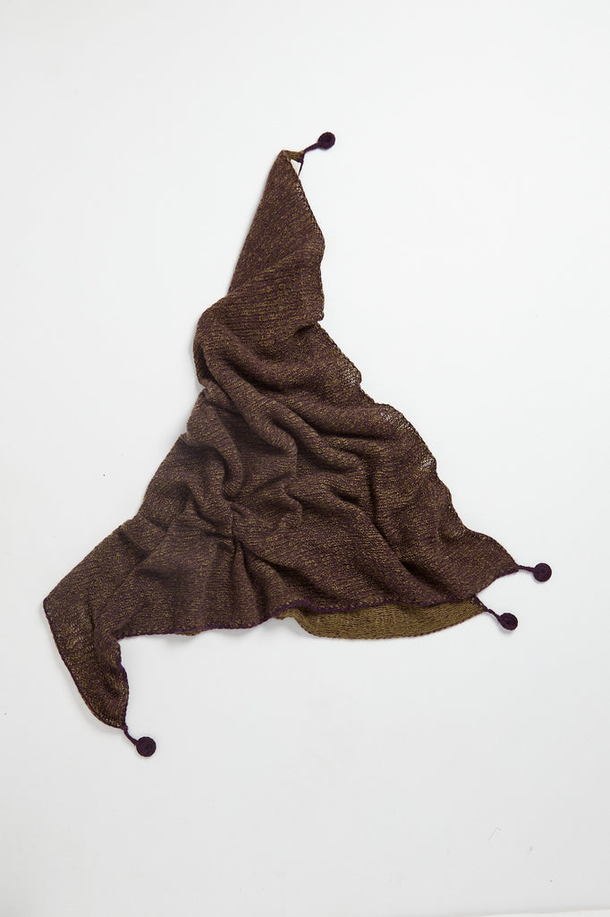 Sciarpa a forma di quadrato bicolore in cashmere a due fili color melanzana e verde oliva, lavorazione manuale vaniseé e rifinita a crochet. Interamente fatto a mano.