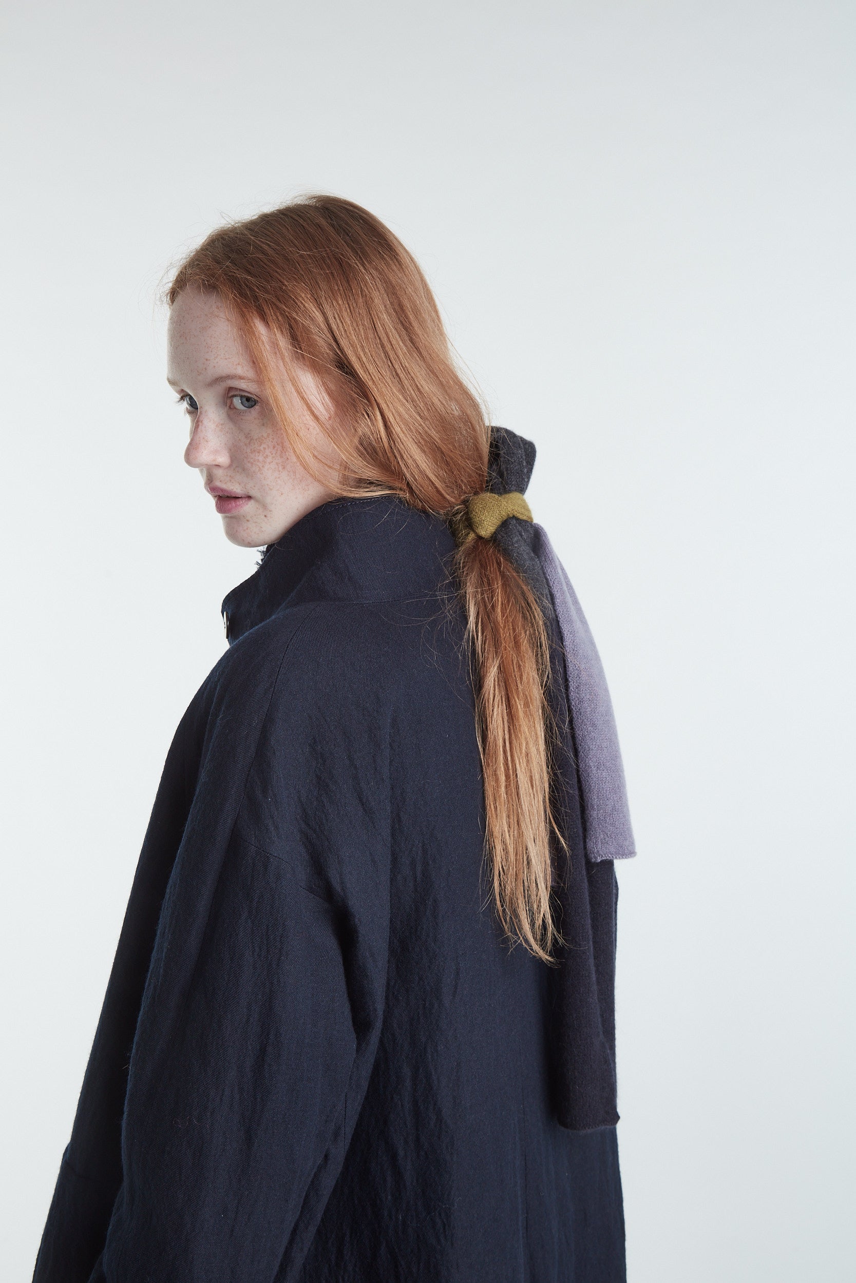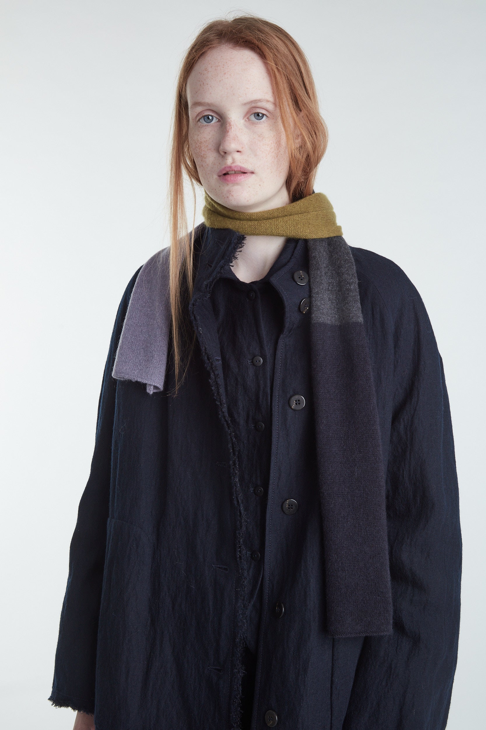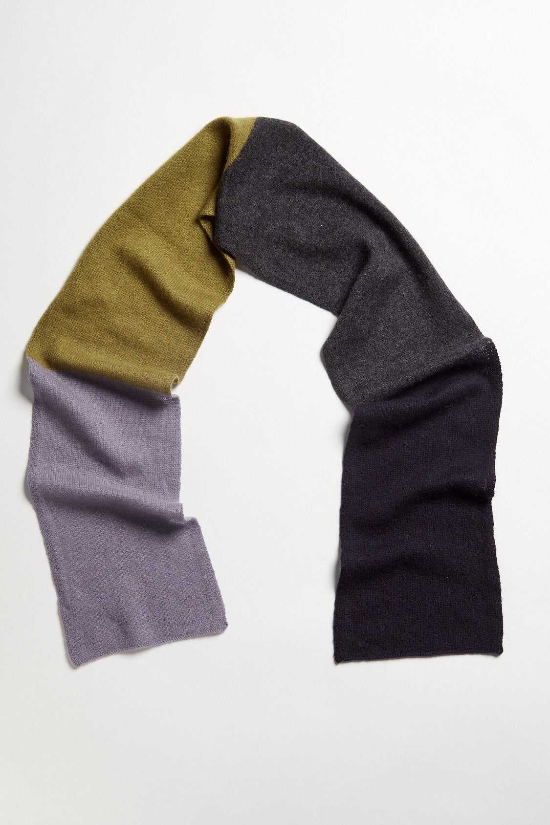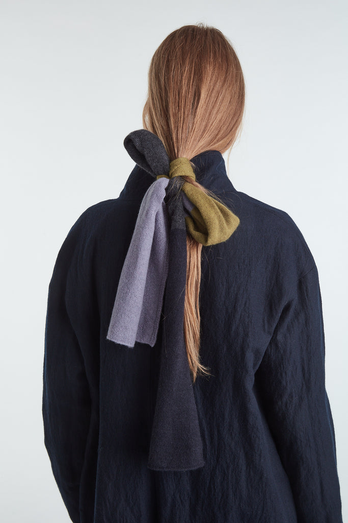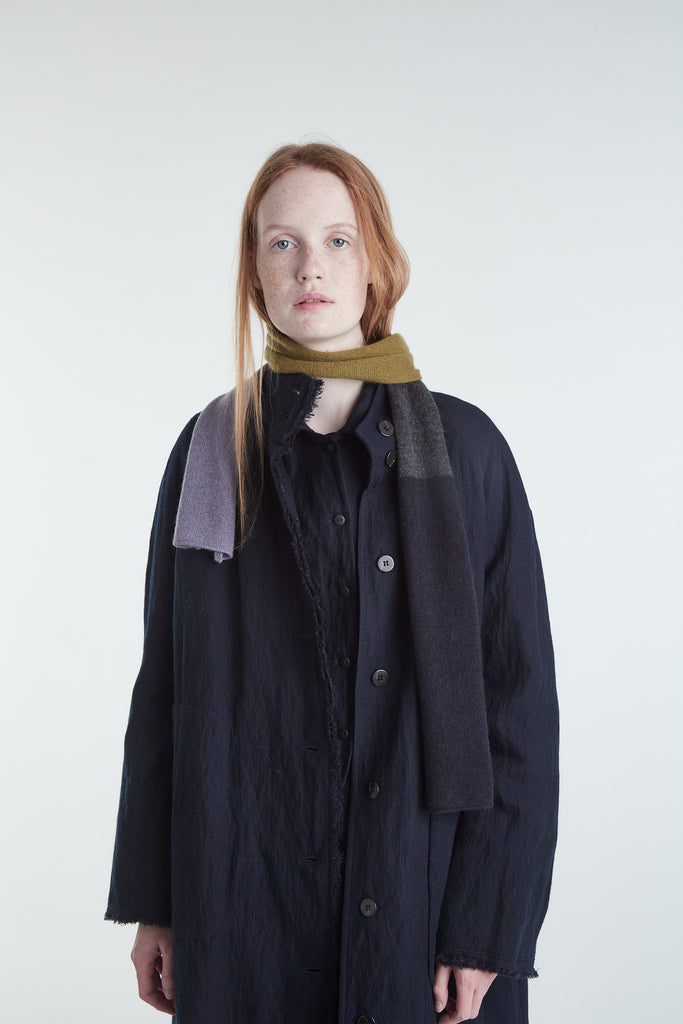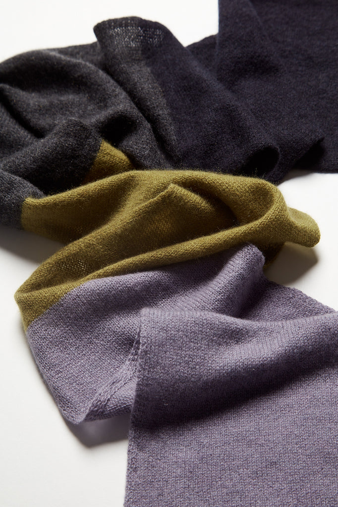 Sciarpina in cashmere a un filo a blocchi multicolore grigio pietra, verde oliva, grigio scuro e blu notte. Lavorazione rasata.