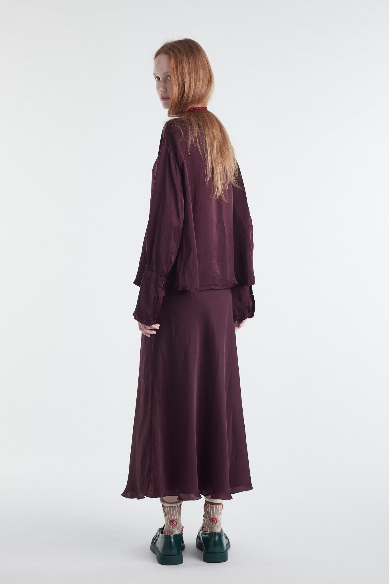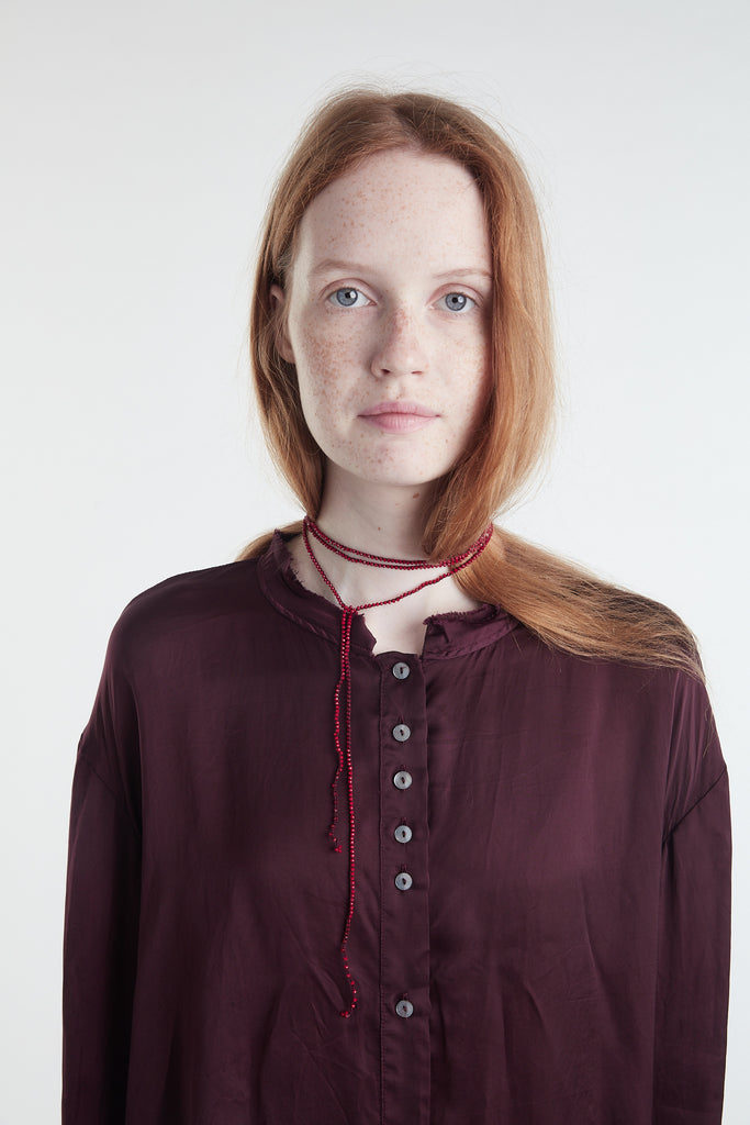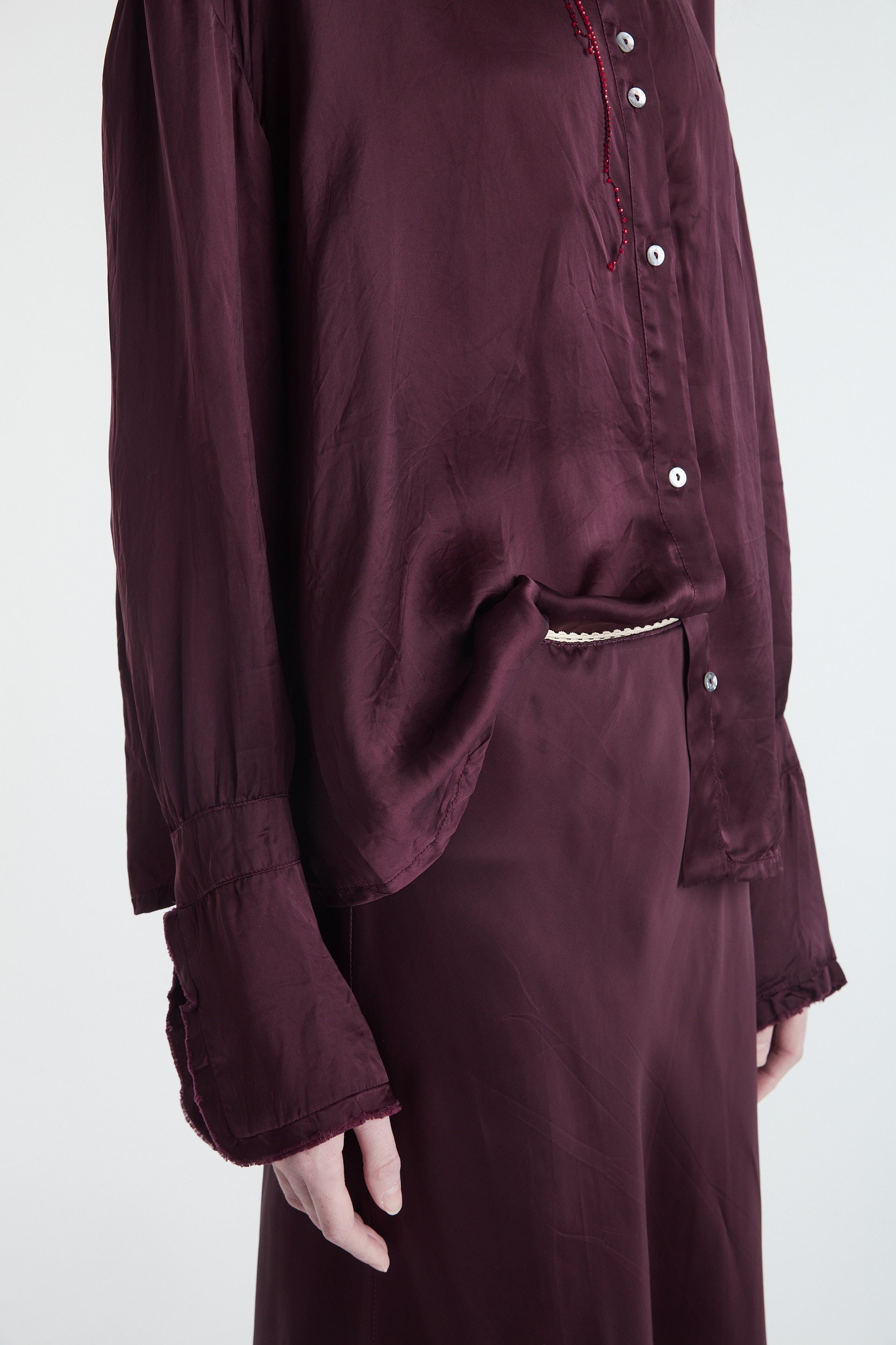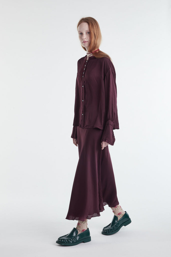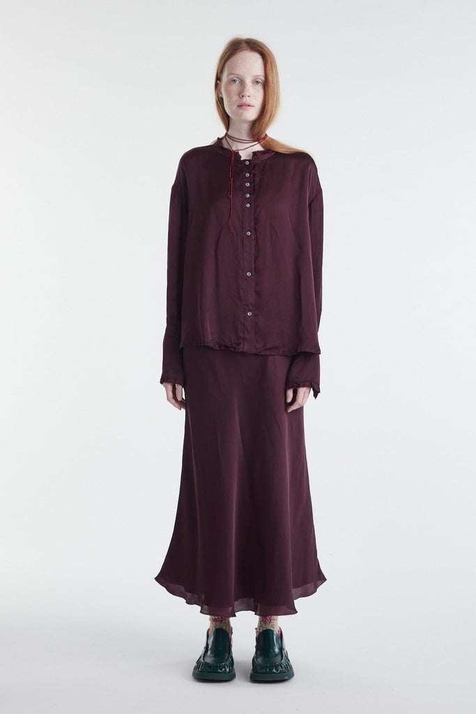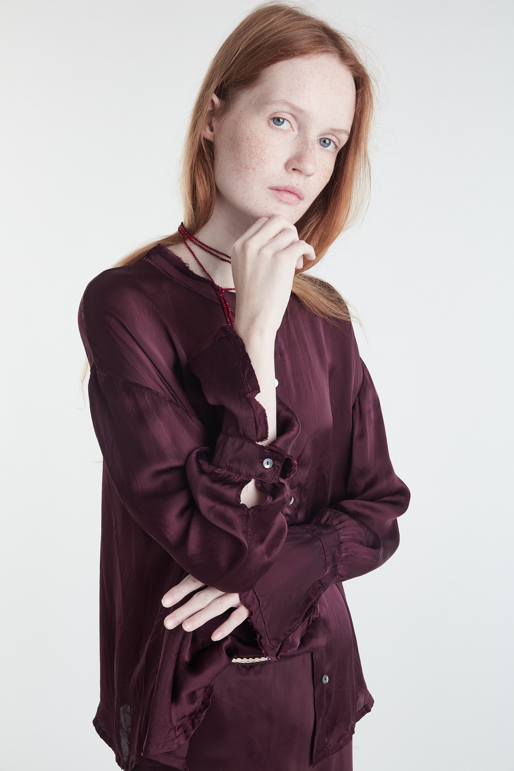Camicia svasata in seta opaca color marrone cioccolato. Collo coreano rifinito a taglio vivo, spalla scesa, chiusura centrale con sette bottoncini in madreperla in posizione degradé asimmetrica, polsino alto con bordino arricciato e a taglio vivo, chiuso con fessino e bottone in madreperla.