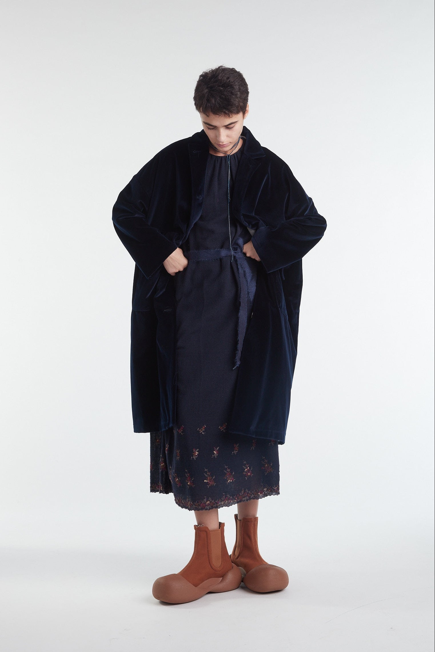 Cappotto lungo taglio over a uovo, in pregiato velluto di cotone liscio color blu notte. Spalla scesa, ampio collo rever, chiusura centrale con cinque bottoni, due tasche applicate con patta e una patta alta sul lato destro, piccolo spacco, orlo manica alto. Foderato e imbottito con Thermore originale.