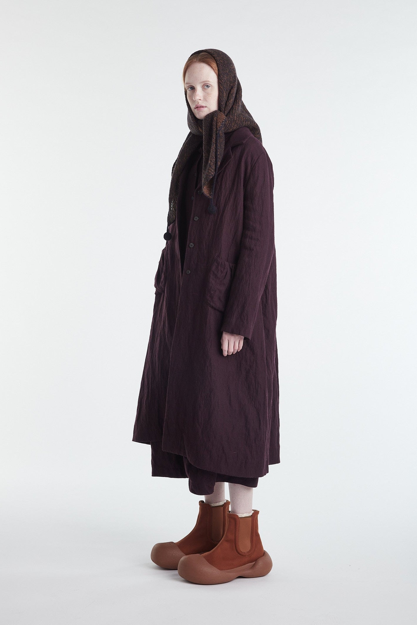 Cappotto svasato color prugna in garza di lana e cotone con fibra metallica che conferisce un aspetto goffrato al tessuto. Spalla leggermente scesa, collo con rever piccolo, tasche applicate con bordo arricciato, chiusura centrale con quattro bottoni, piccola martingala con arriccio centrale sul dietro. Foderato e imbottito con Thermore originale.