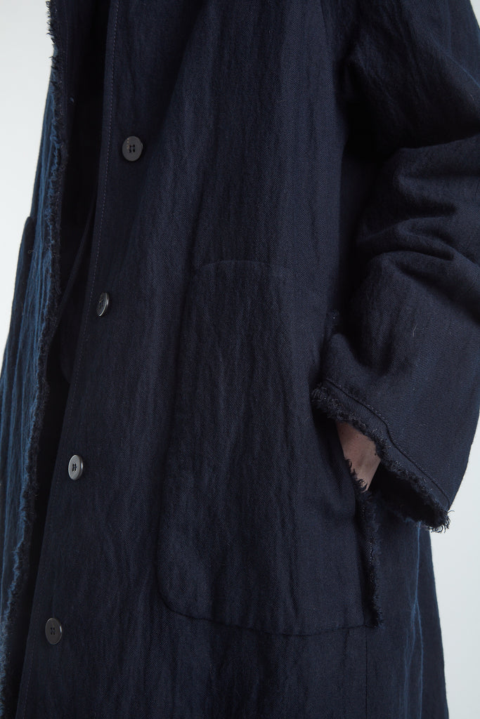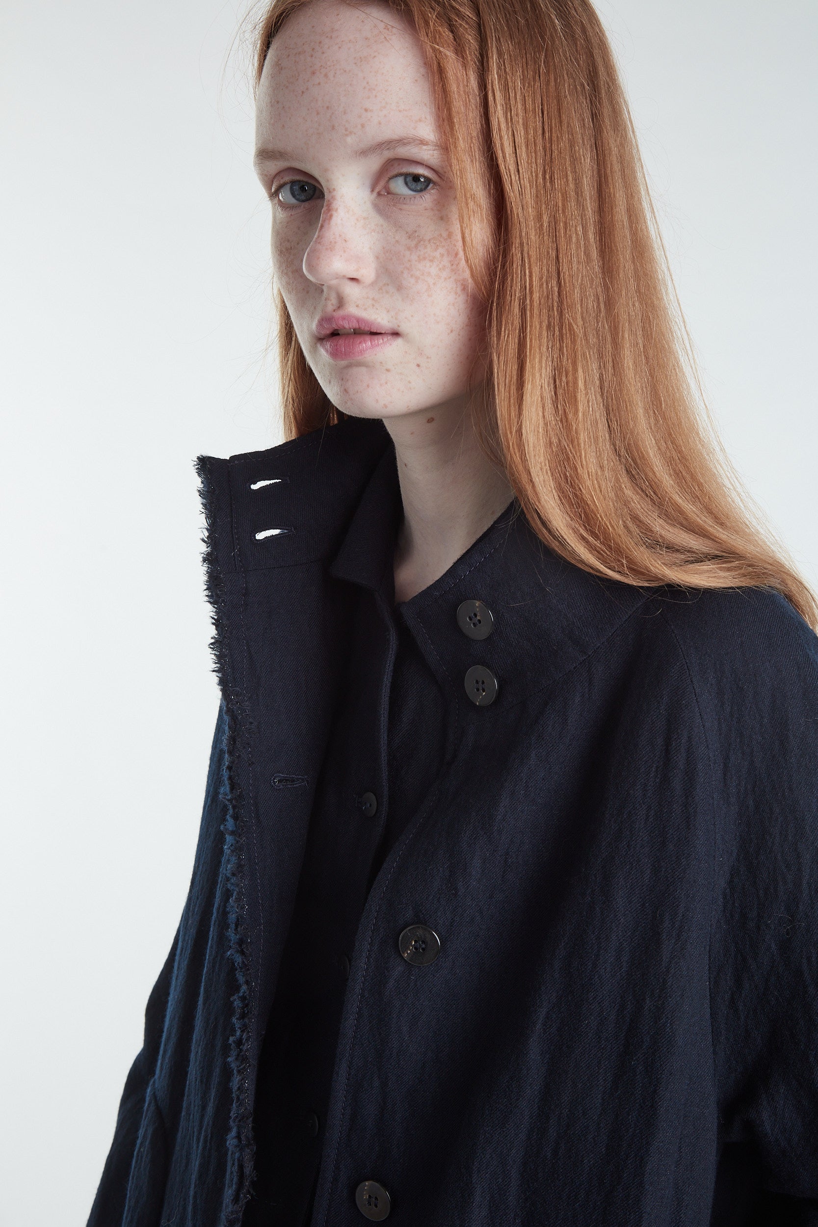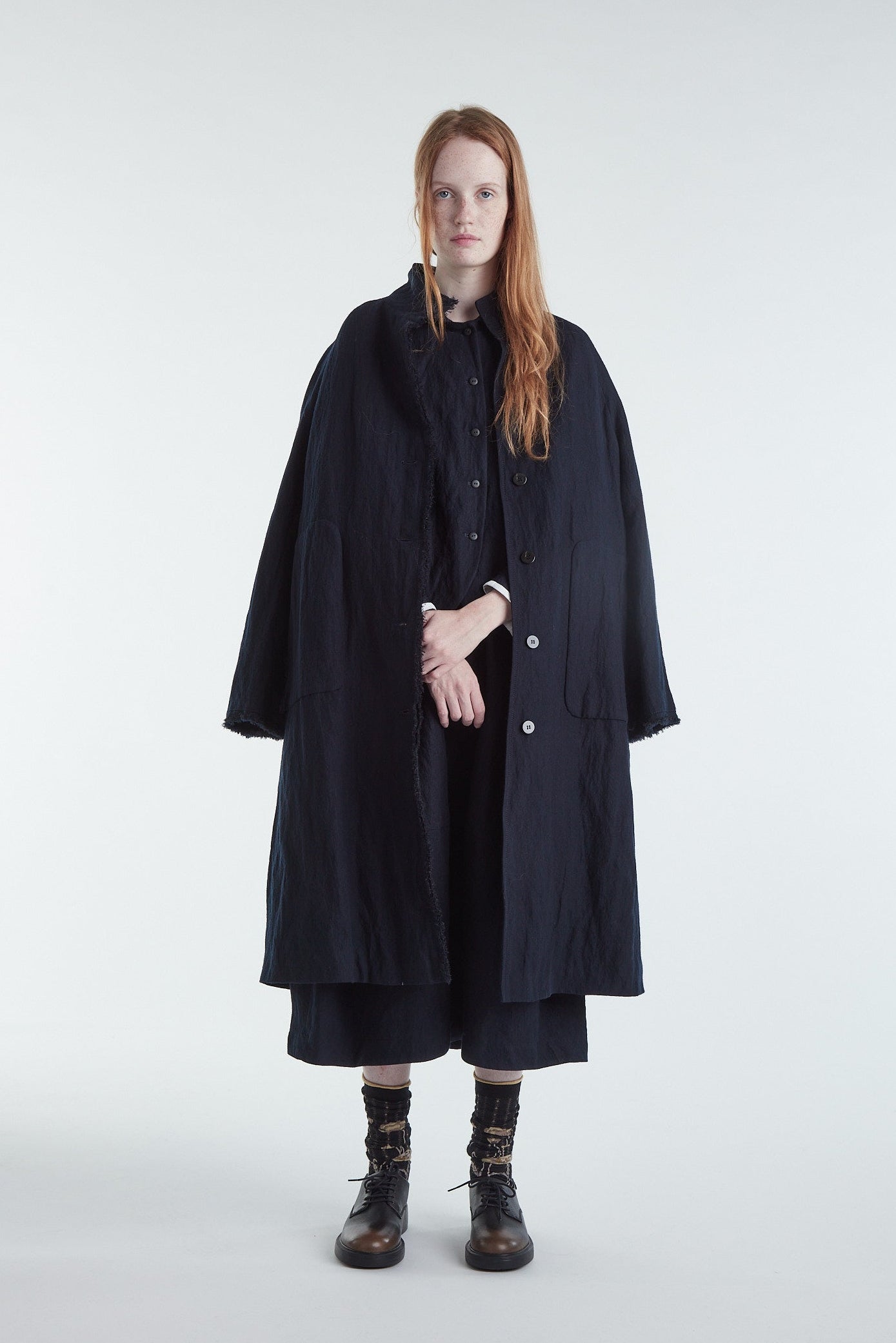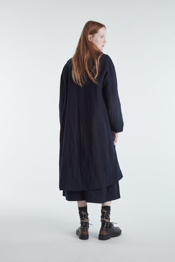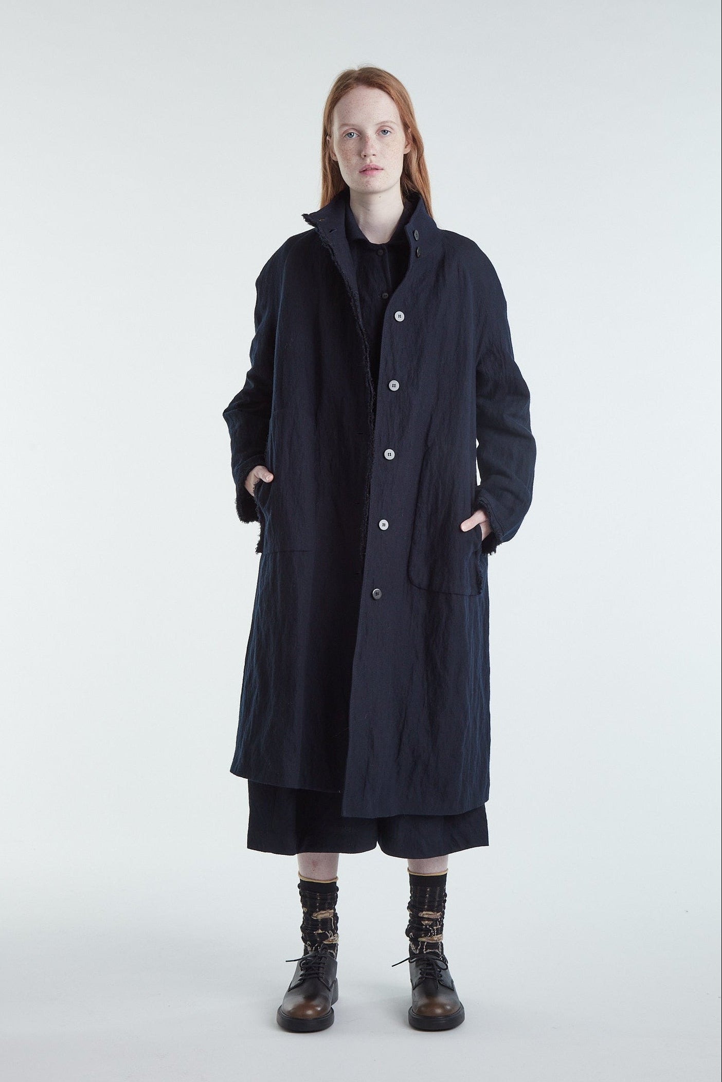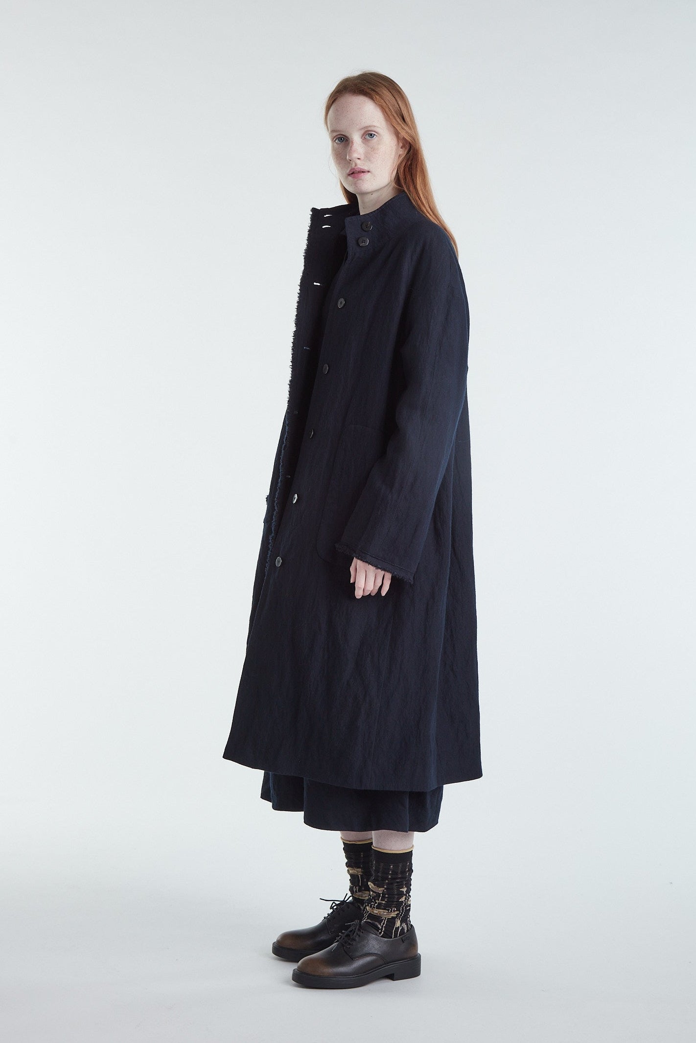 Cappotto lungo oversize, in garza di lana e cotone con fibra metallica che conferisce un aspetto goffrato al tessuto. Manica raglan sul davanti e spalla scesa sul retro, collo coreano alto, chiusura centrale con sette bottoni, due tasche grandi rettangolari con cucitura invisibile e ingresso laterale, spacco centrale sul dietro, cimosa a vista su bordo paramontura, orli tasche e polsi. Foderato e imbottito con Thermore originale.
