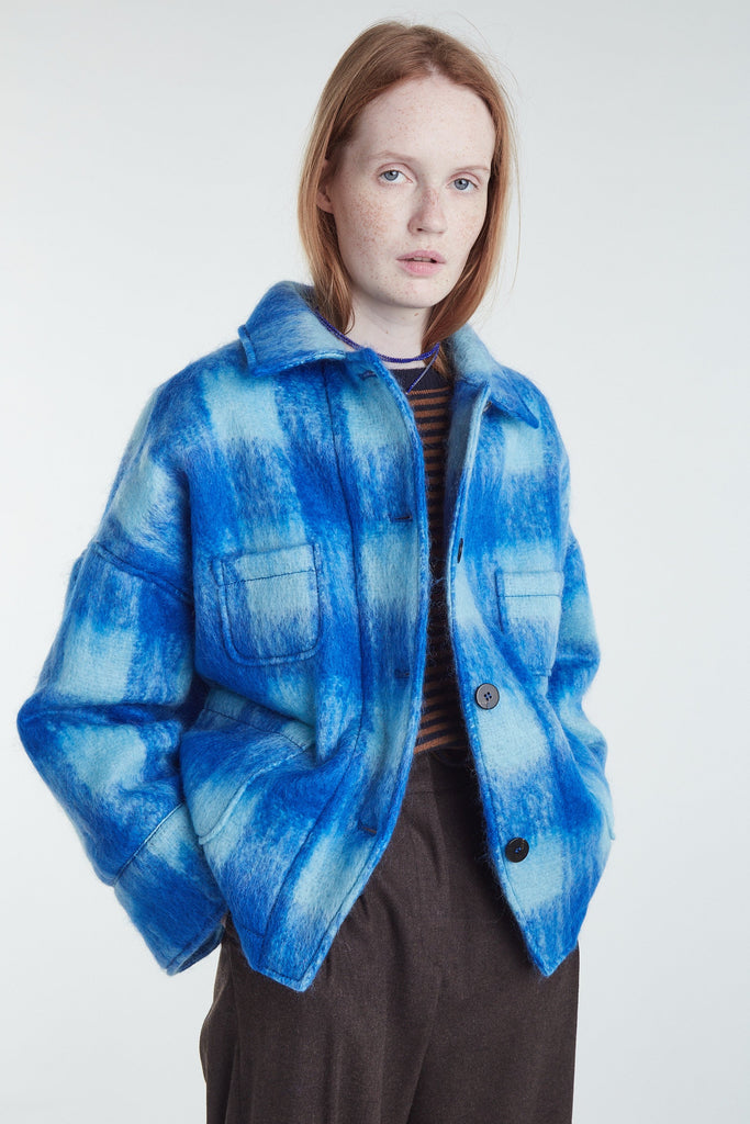 GIACCA KYOTO in lana mohair a quadri / blu cileo