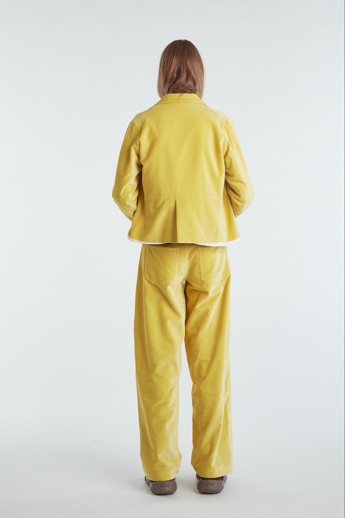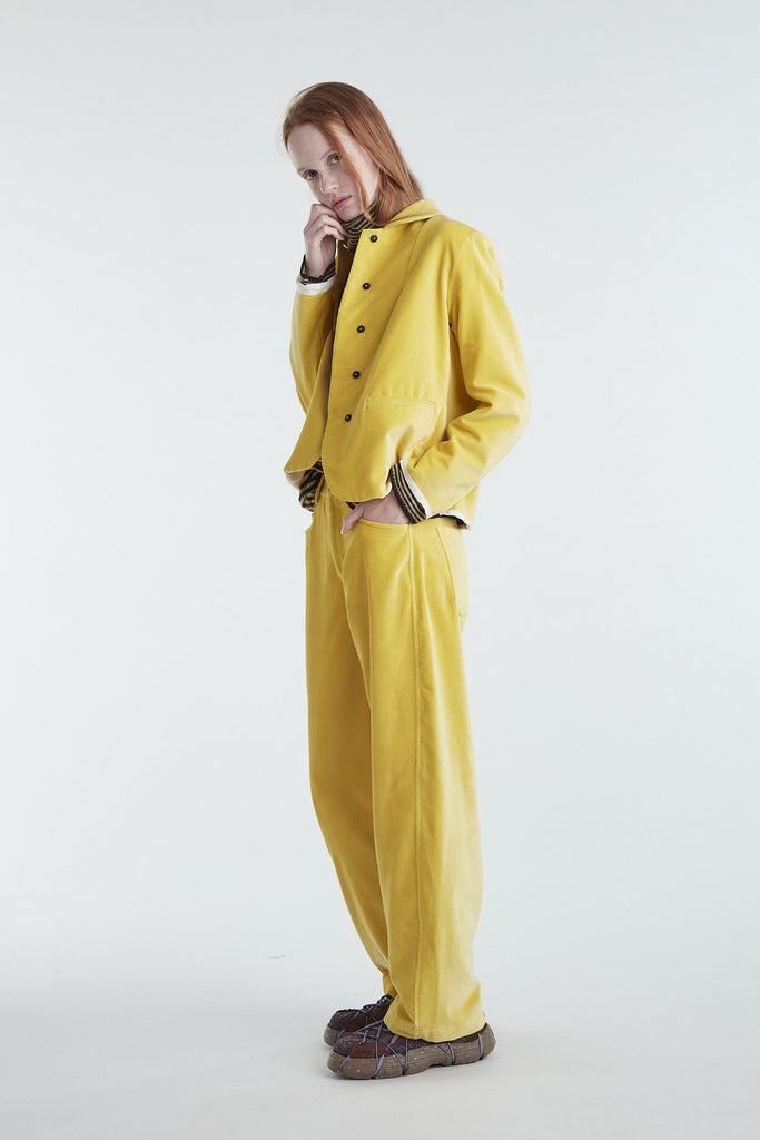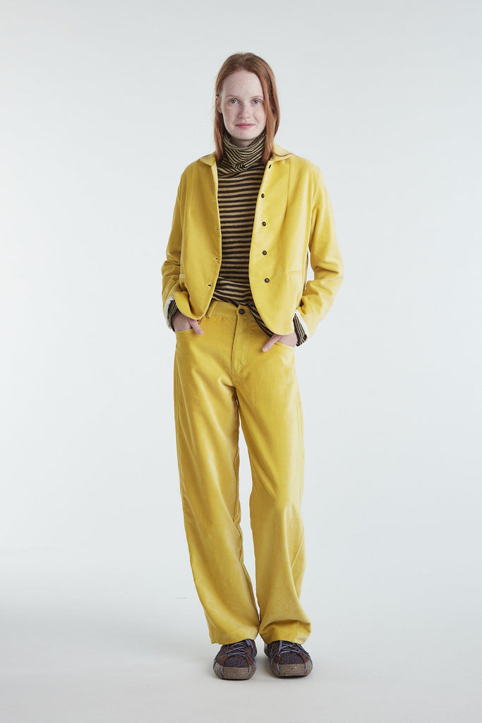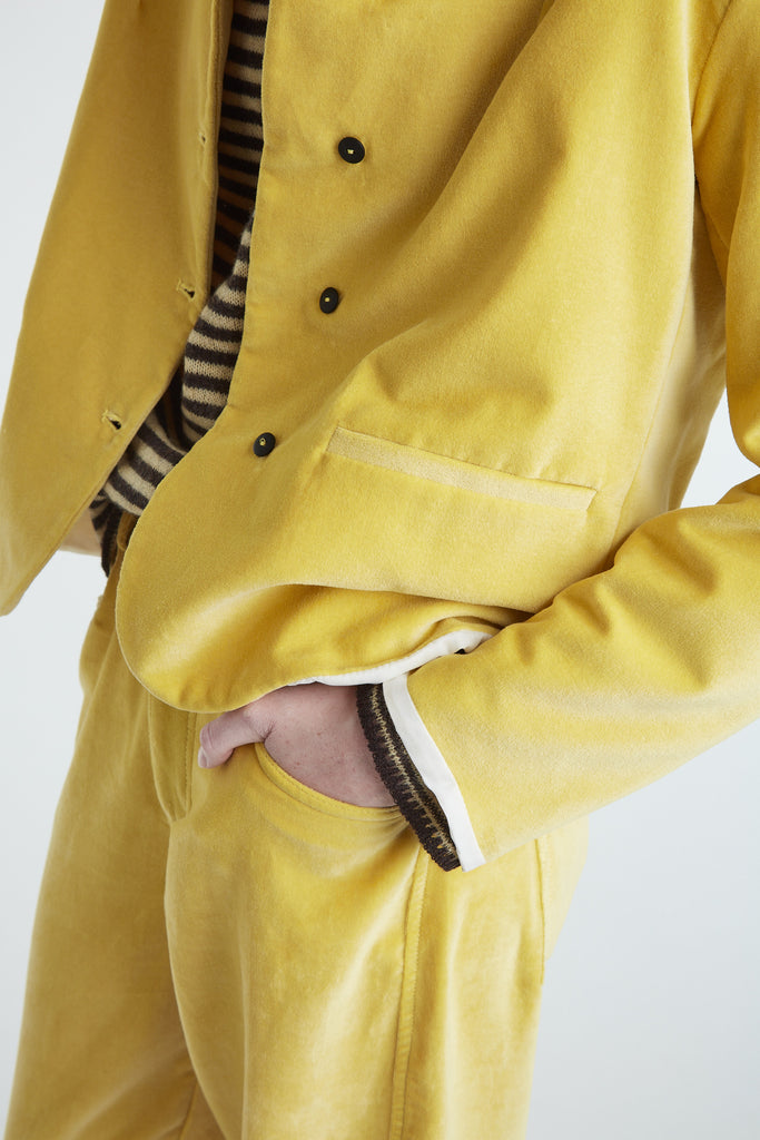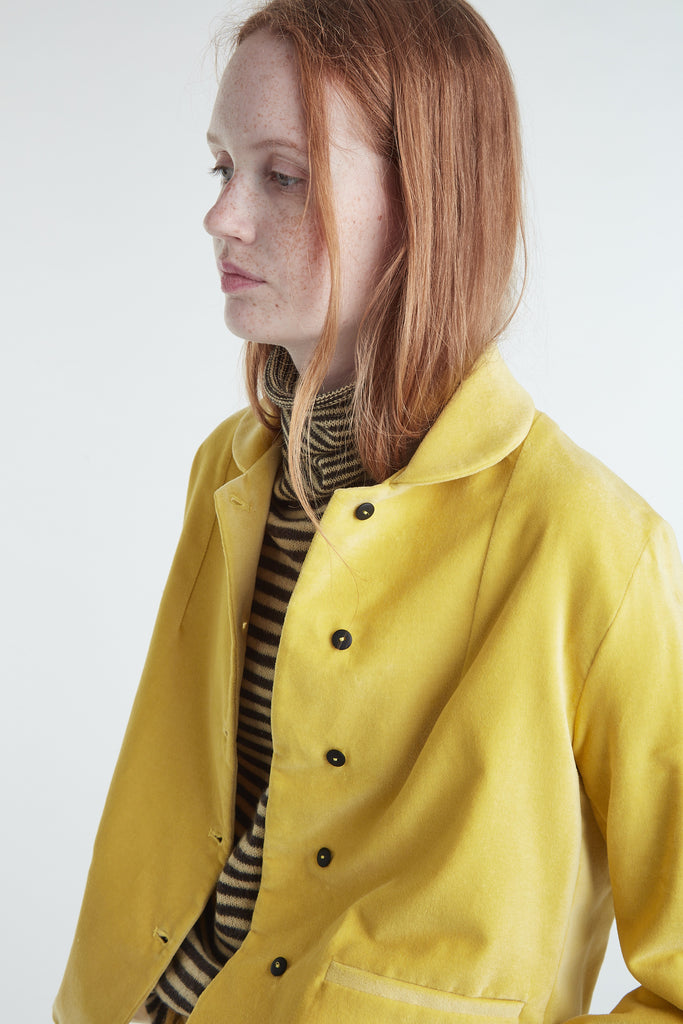 Giacca corta in morbido velluto di cotone leggermente elasticizzato, color giallo mais. Spalla morbida, colletto piccolo tondo, taschine a filetto, chiusura centrale con cinque bottoni, fondo davanti stondato e piccolo spacco nel centro dietro. Fodera in cotone a vista sui bordi come tratto distintivo.