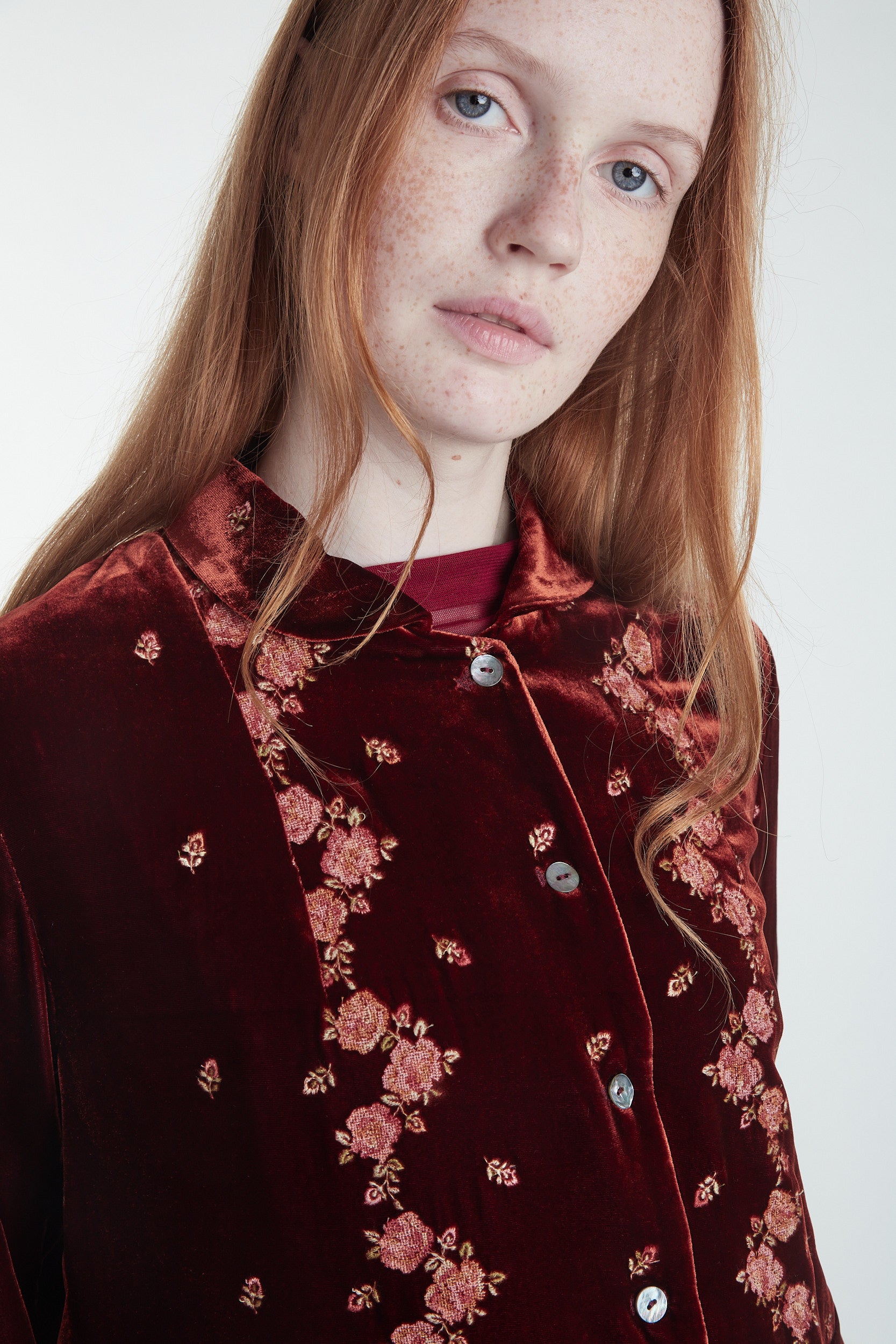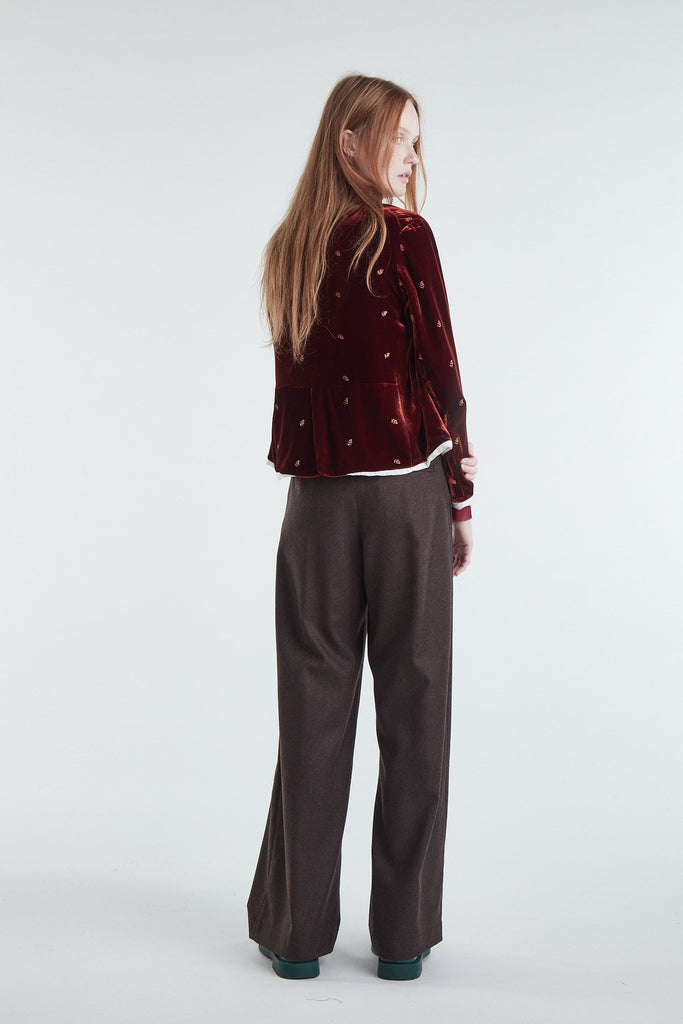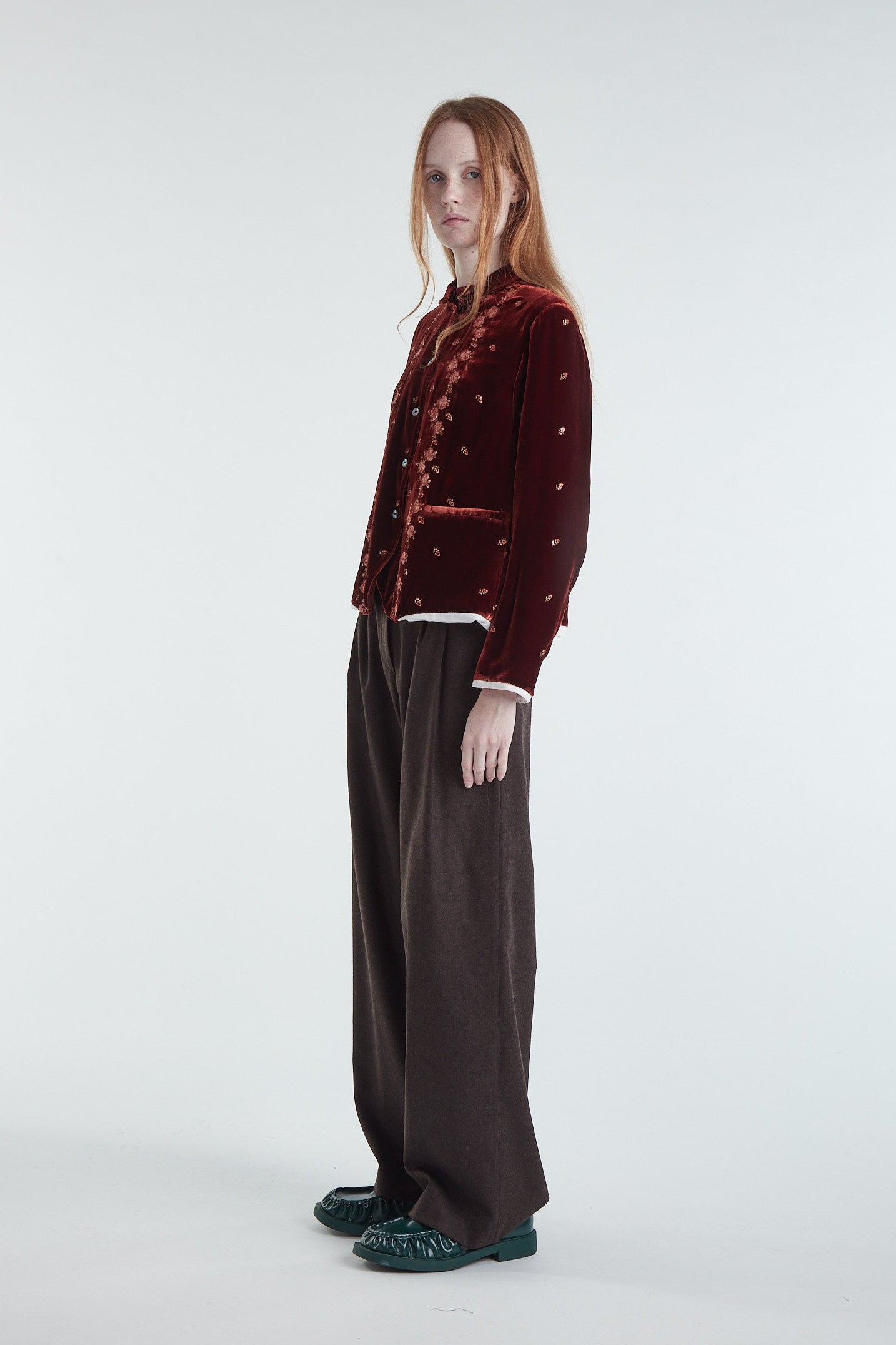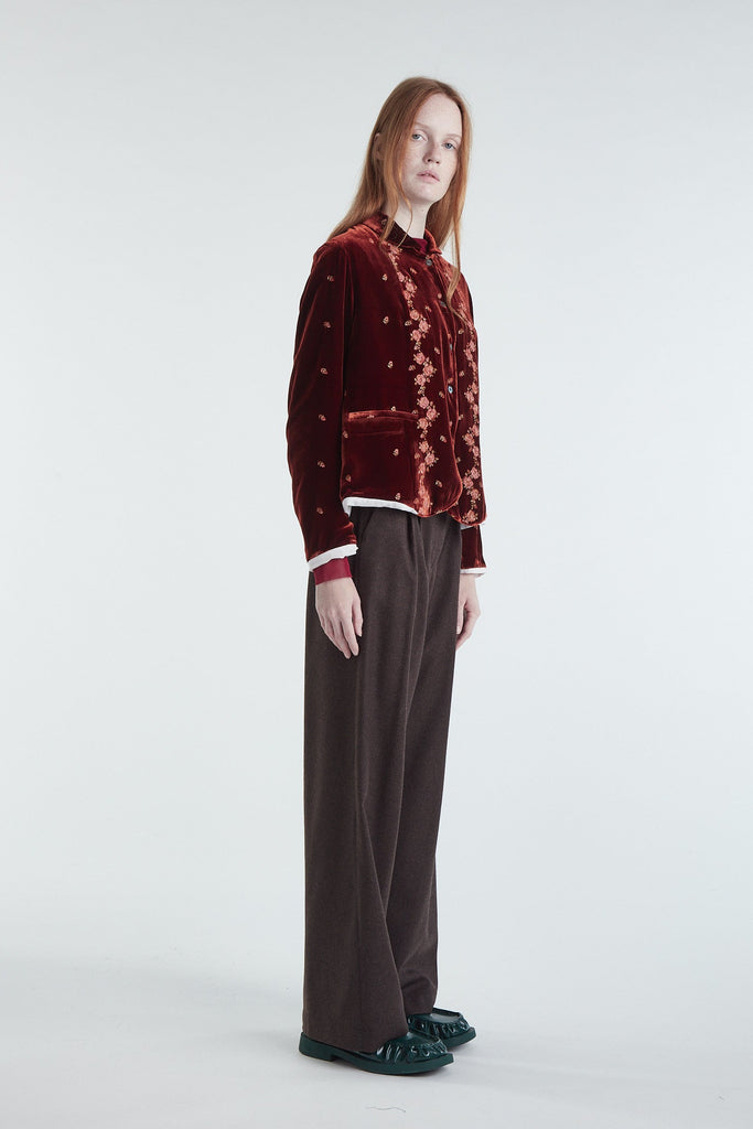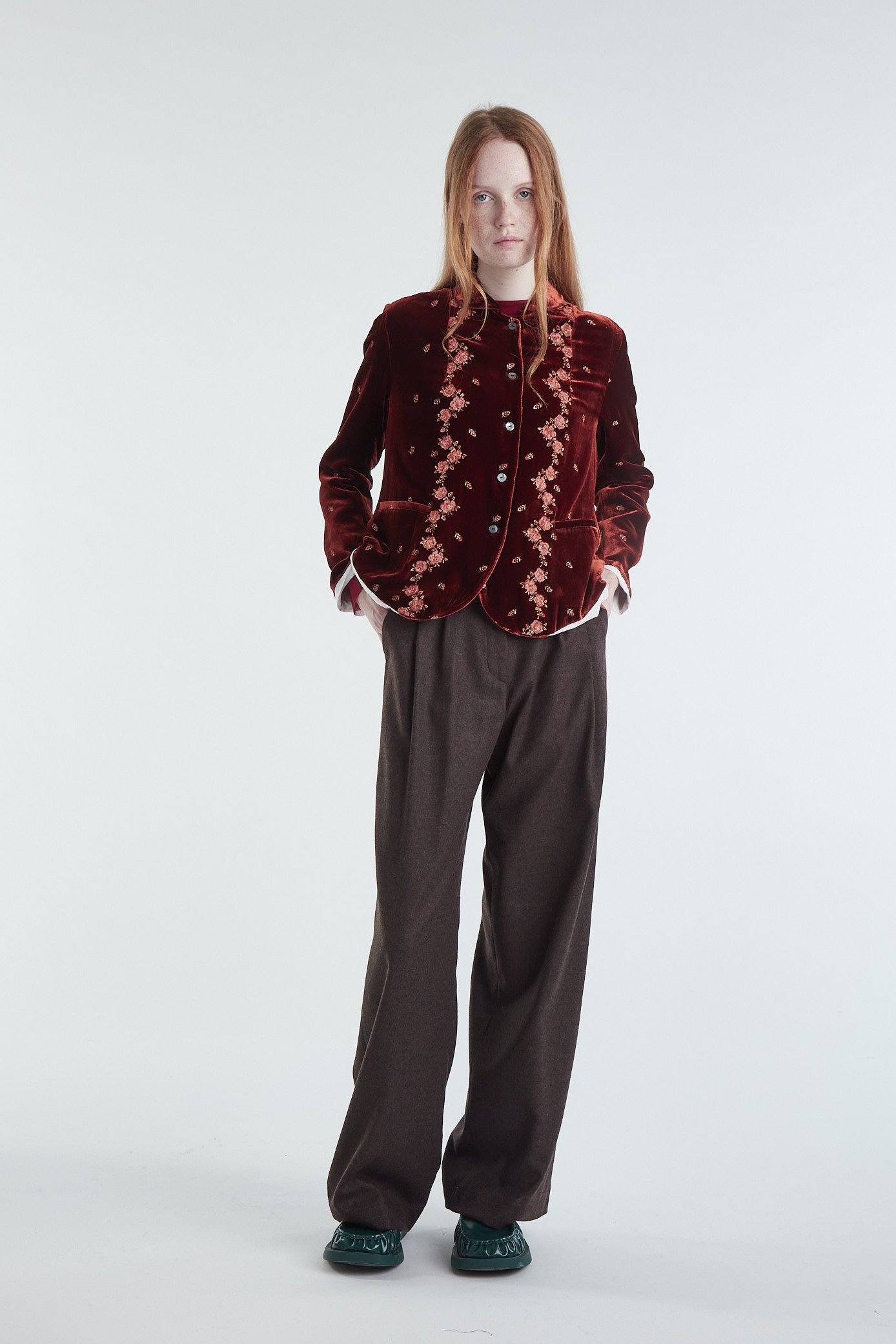 Giacca corta in velluto francese ricamato, color marrone bruciato. Spalla morbida, colletto piccolo tondo, taschine a filetto, chiusura centrale con cinque bottoni, fondo davanti stondato e piccolo spacco nel centro dietro. Fodera in cotone a vista sui bordi come tratto distintivo. Il ricamo presenta piccoli boccioli su tutta la superficie e due file di rose ricamate a punto croce posizionate al centro su tutta la lunghezza.