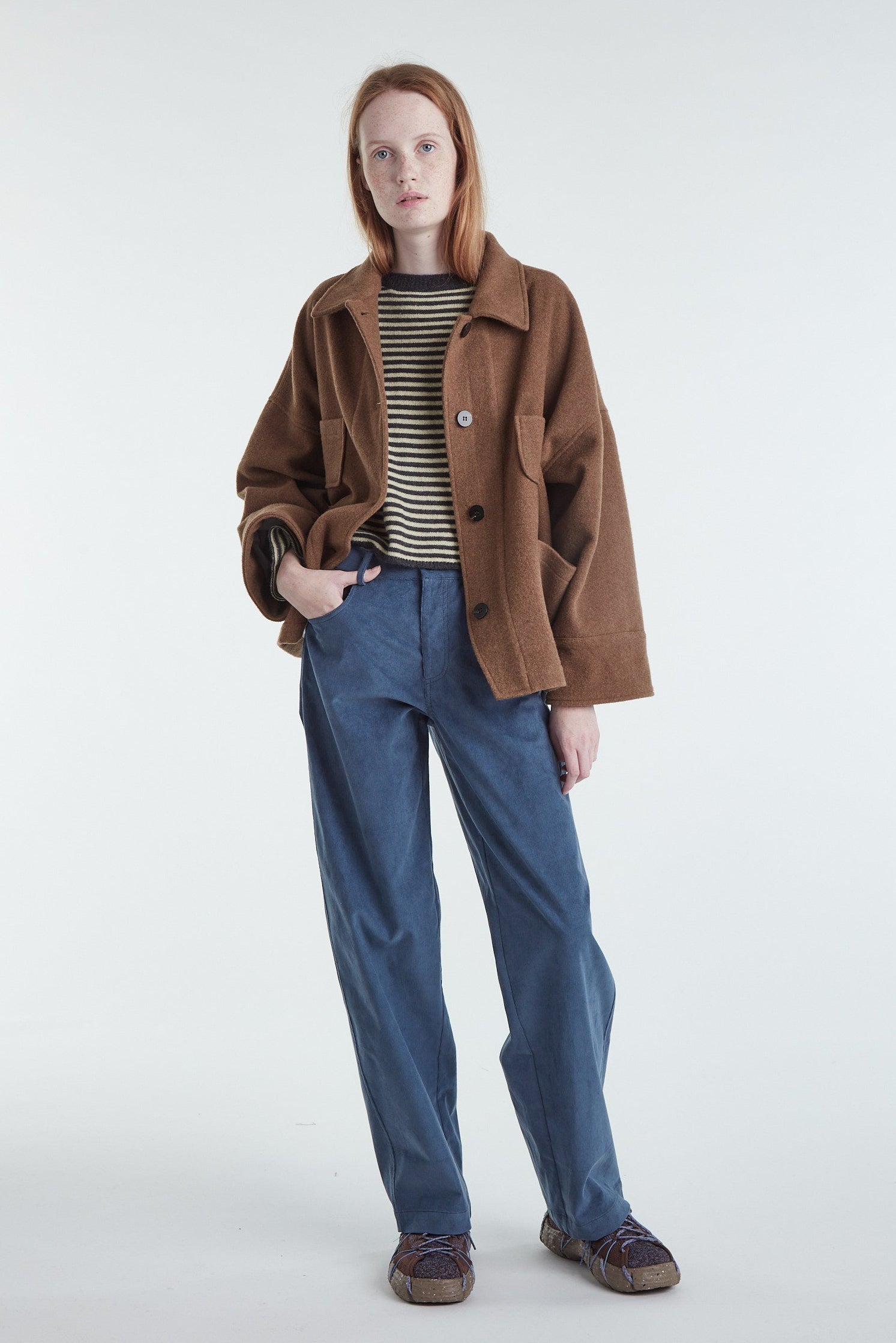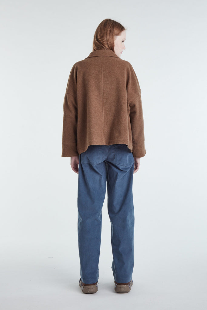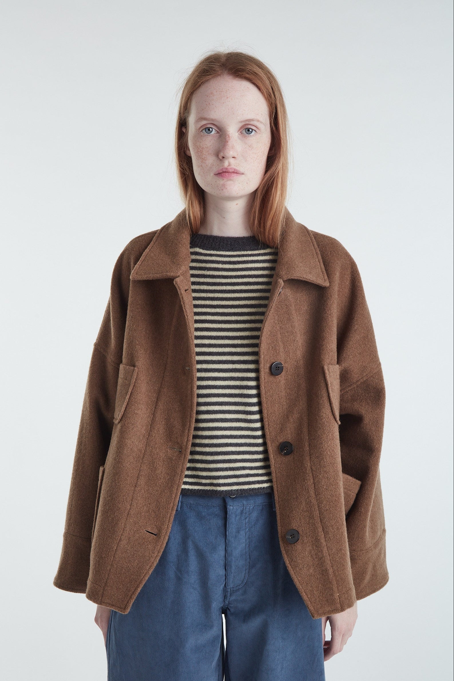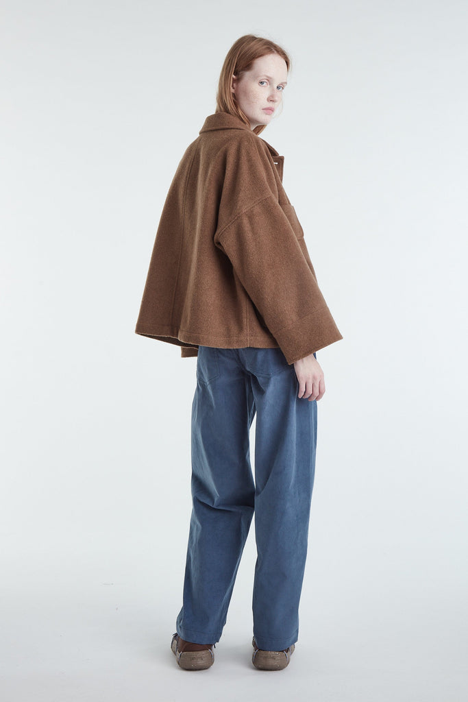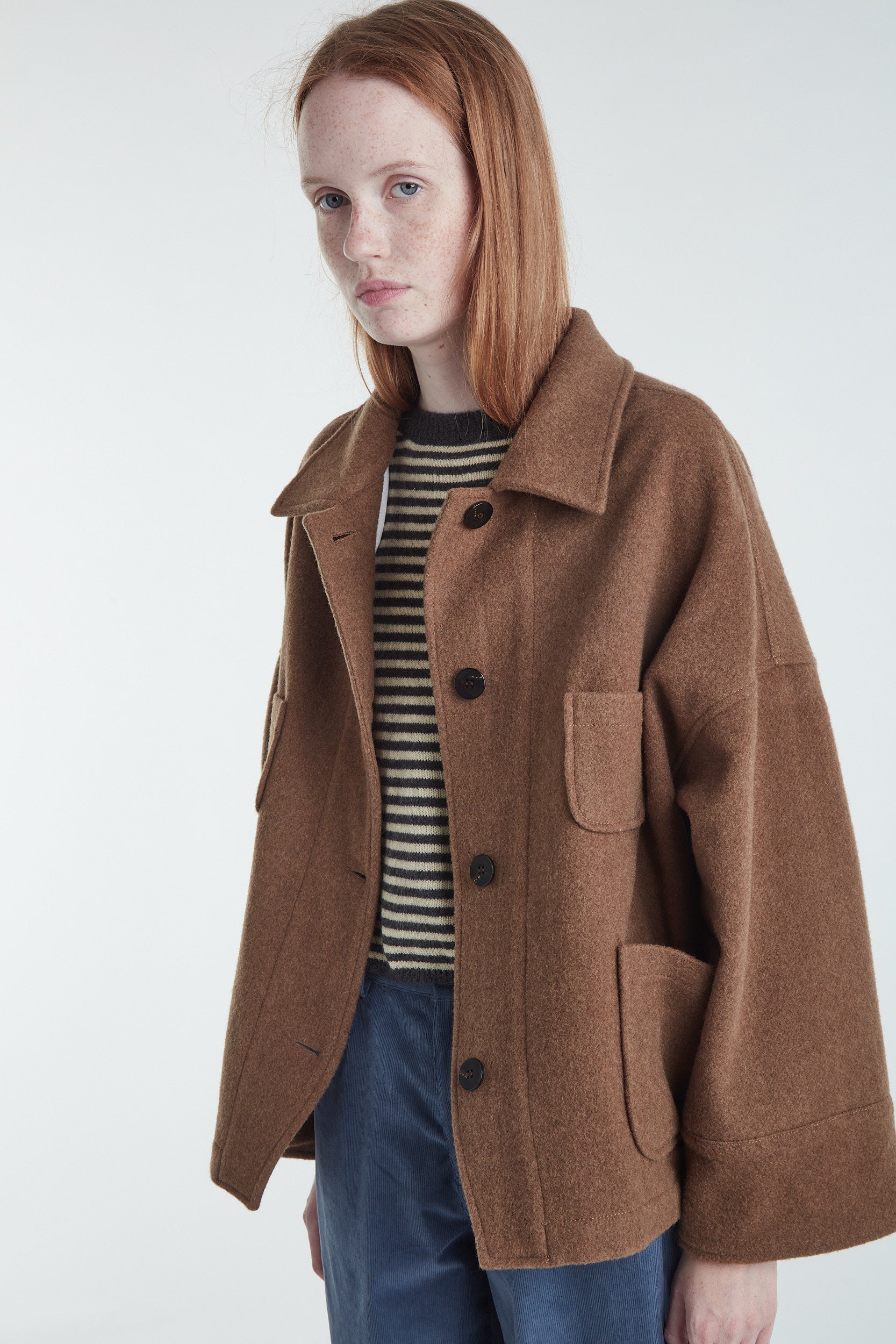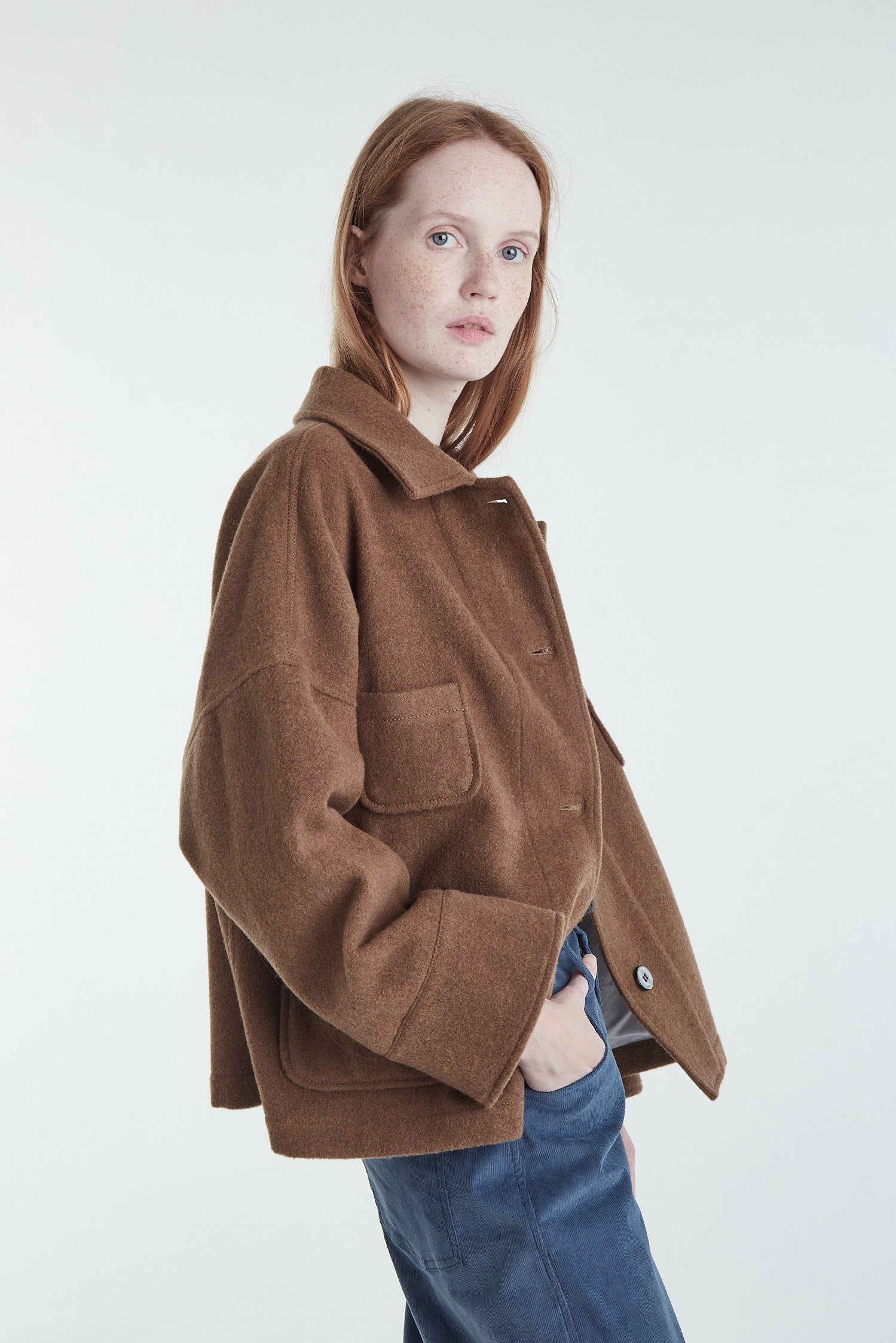 Giacca dal taglio boxy oversize in morbido panno di lana giapponese color nocciola. Spalla scesa, maniche ampie con orlo alto sul fondo, colletto piccolo, quattro tasche applicate, chiusura centrale con quattro bottoni. Foderata e senza imbottitura.