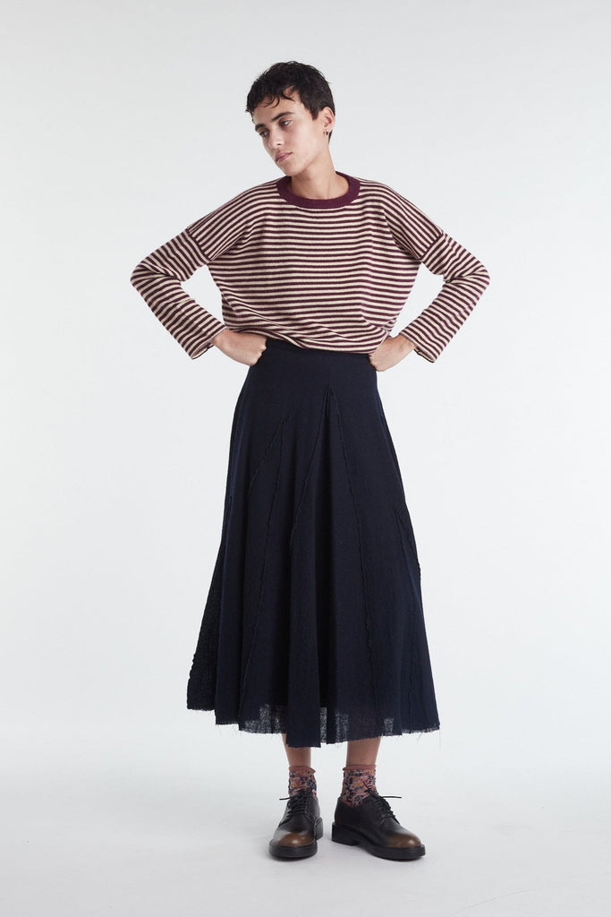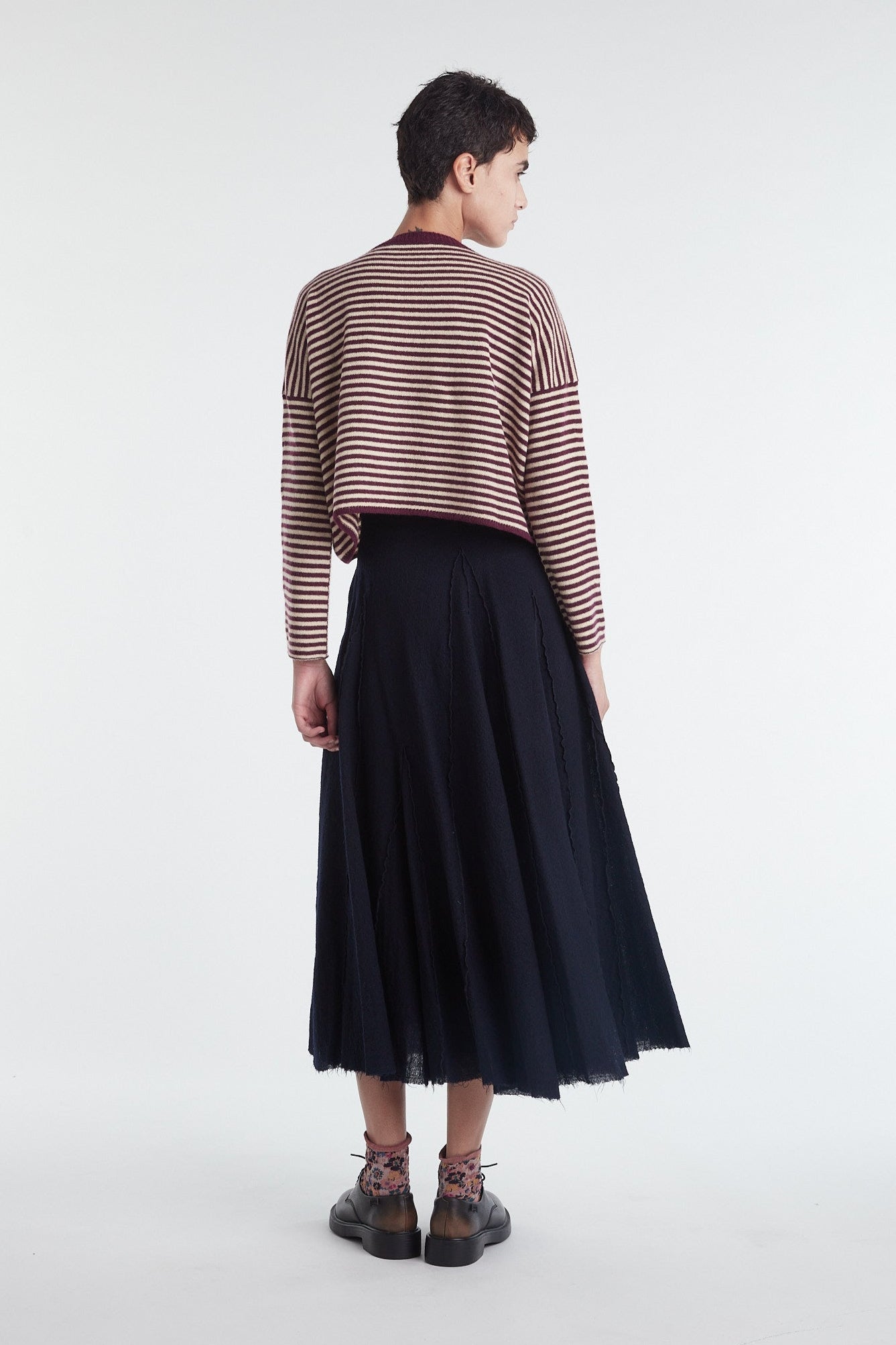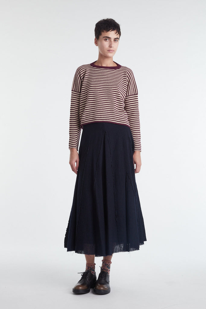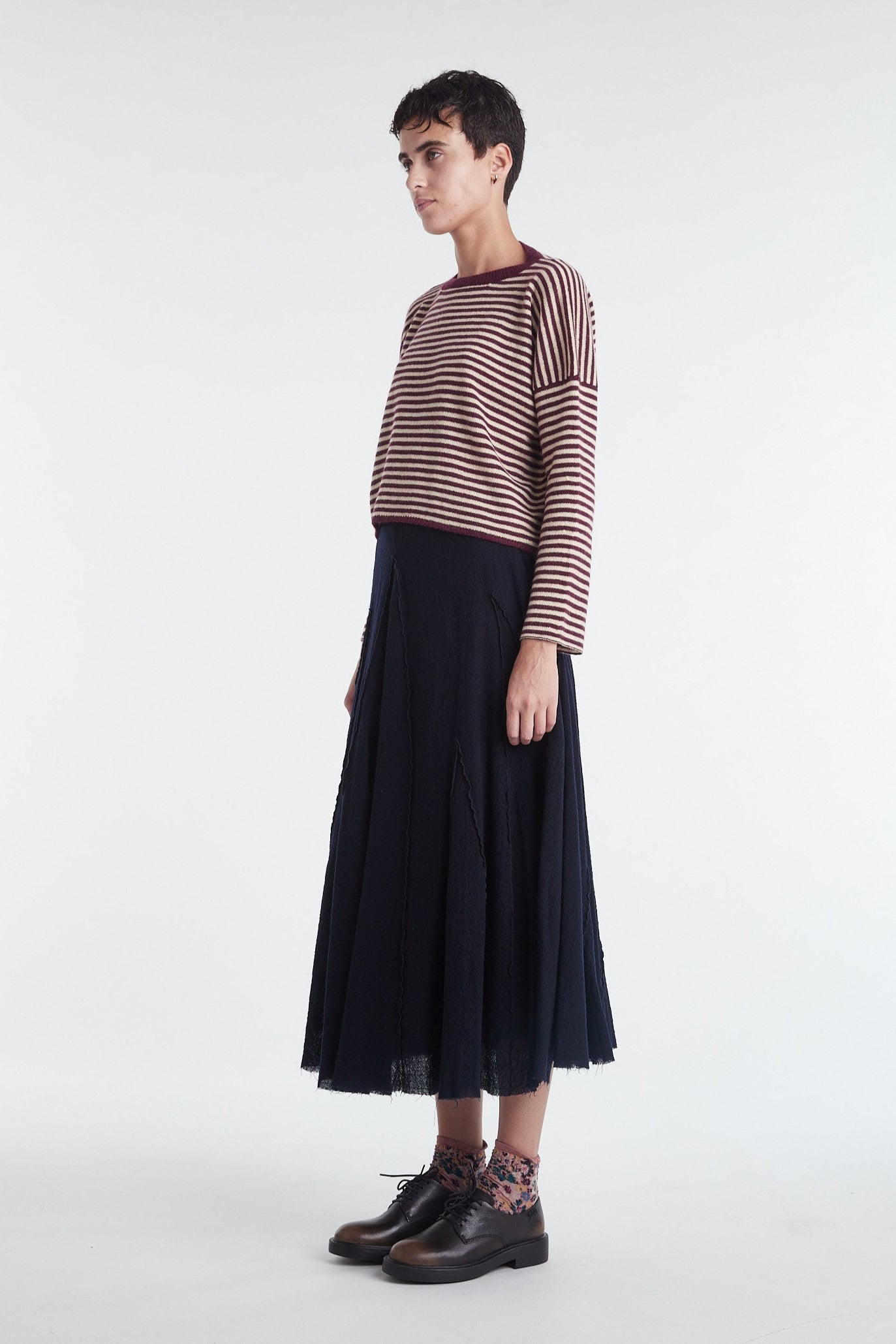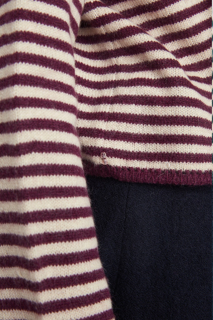 Maglia taglio a scatolina e manica larga in cashmere un filo a righe bicolor, color bordeaux e burro. Giromanica basso, piccolo ajour sul fondo del capo e polso rifinito a catenella. La manica è impreziosita da un leggero intreccio. Vestibilità morbida. Questo capo veste perfettamente ogni donna. Realizzato con cura da artigiani italiani. Tutte le nostre maglie presentano due piccoli cristalli ricamati a mano sul fianco sinistro come tratto distintivo.