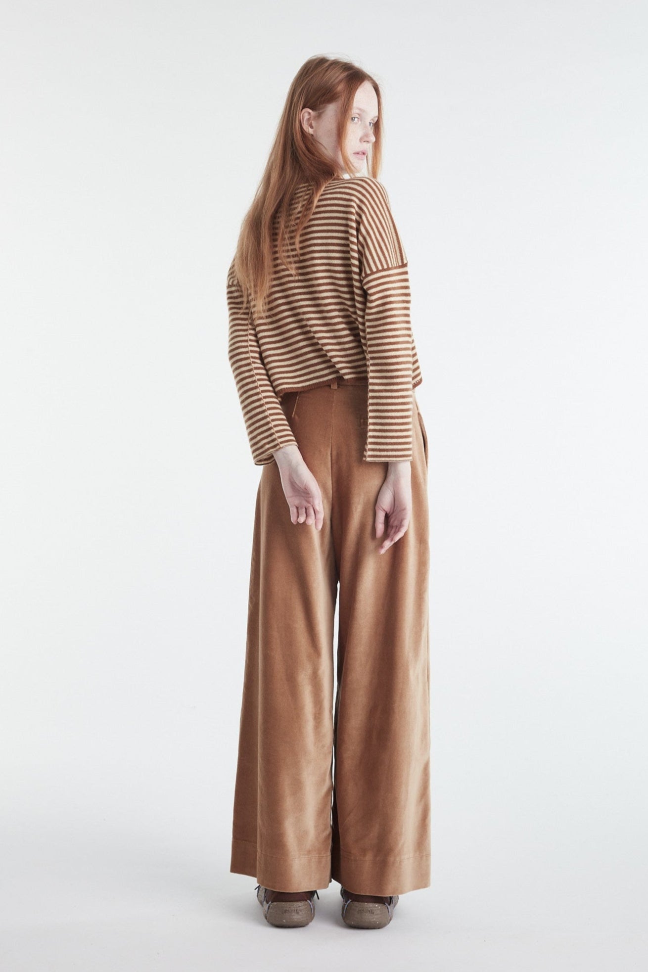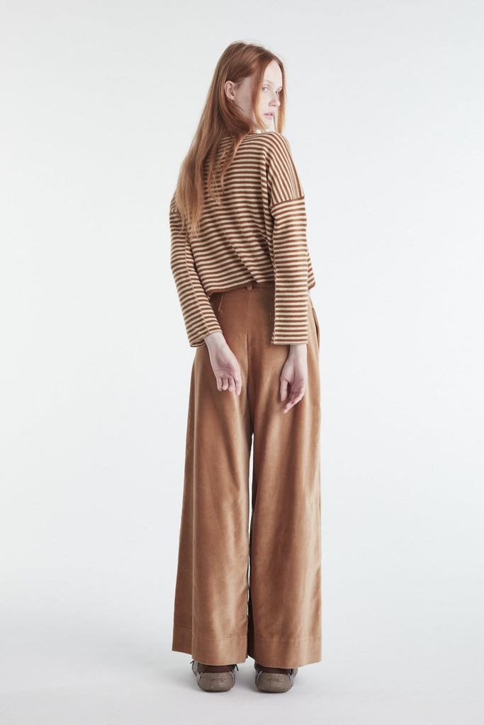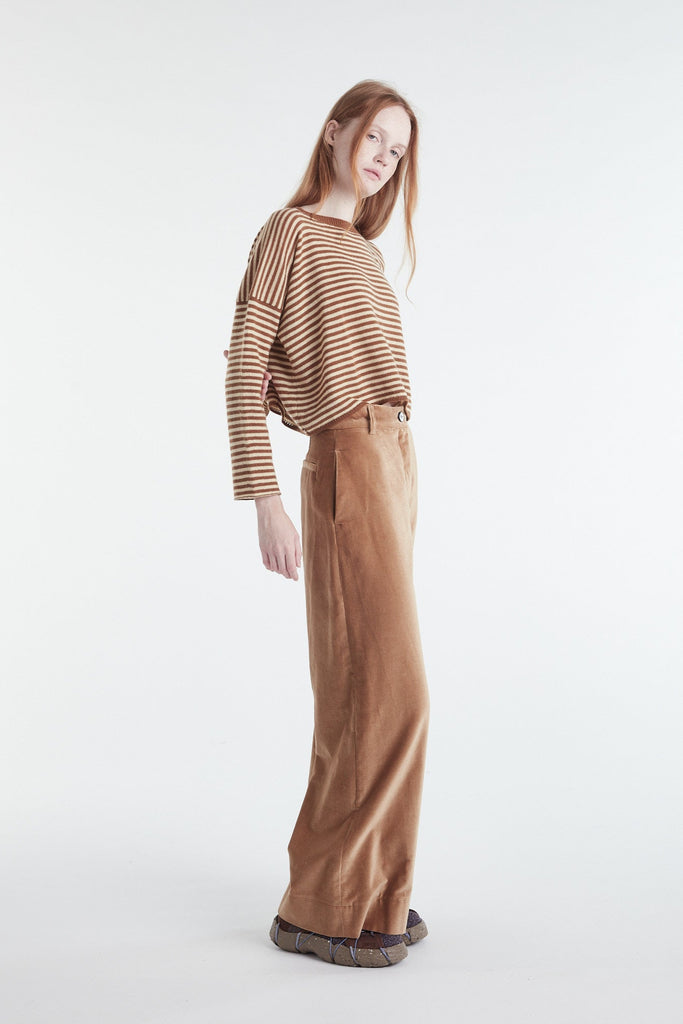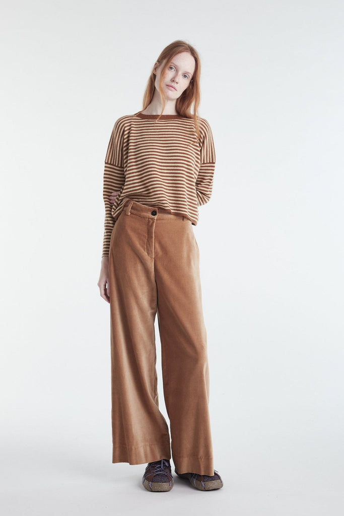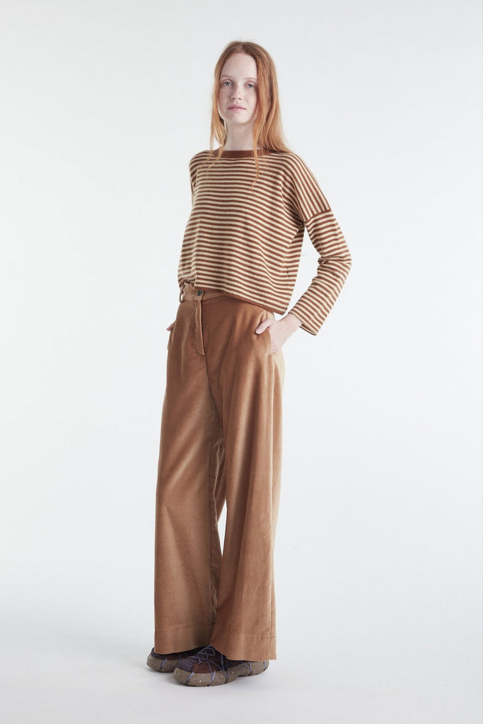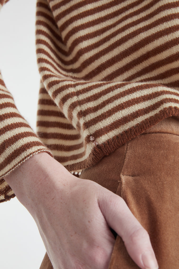 Maglia taglio a scatolina e manica larga in cashmere un filo a righe bicolor, color nocciola e burro. Giromanica basso, piccolo ajour sul fondo del capo e polso rifinito a catenella. La manica è impreziosita da un leggero intreccio. Vestibilità morbida. Questo capo veste perfettamente ogni donna. Realizzato con cura da artigiani italiani. Tutte le nostre maglie presentano due piccoli cristalli ricamati a mano sul fianco sinistro come tratto distintivo.
