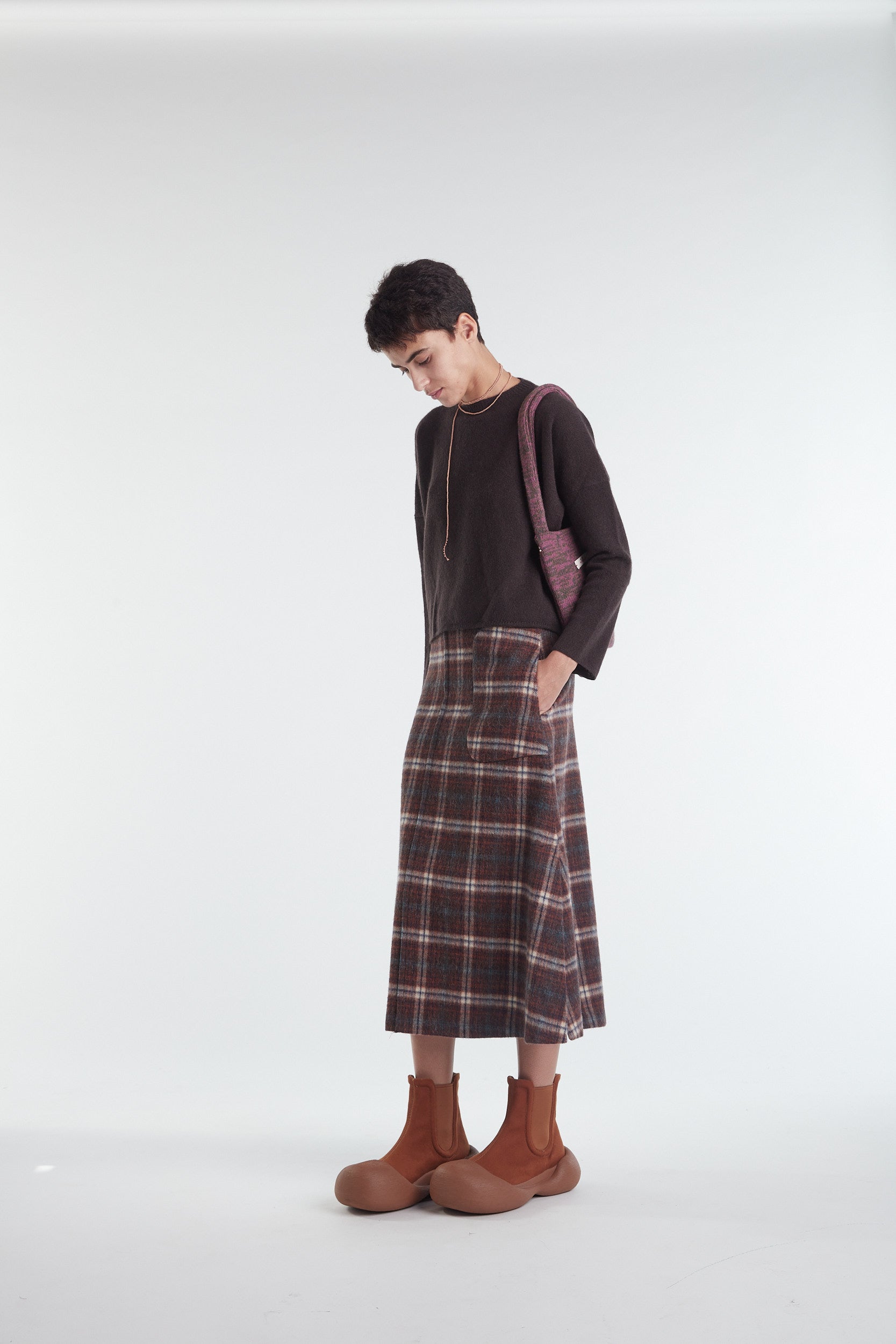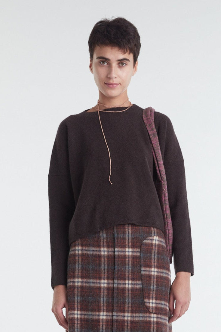Maglia taglio a scatolina e manica larga in cashmere un filo tinta unita, color marrone testa di moro. Giromanica basso, piccolo ajour sul fondo del capo e polso rifinito a catenella. Vestibilità morbida. Questo capo veste perfettamente ogni donna. Realizzato con cura da artigiani italiani. Tutte le nostre maglie presentano due piccoli cristalli ricamati a mano sul fianco sinistro come tratto distintivo.