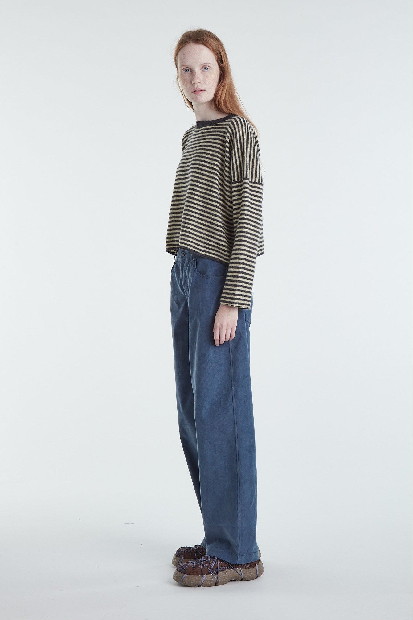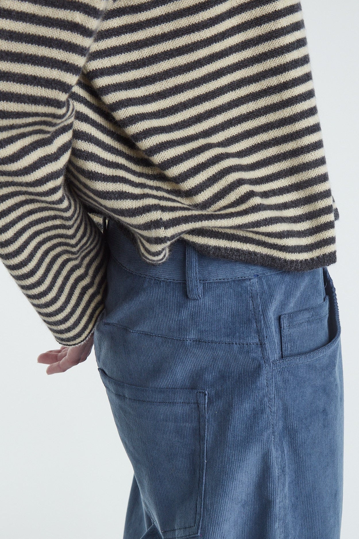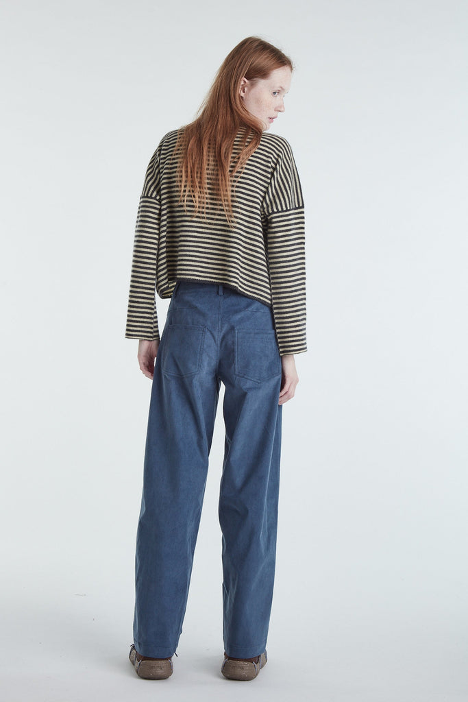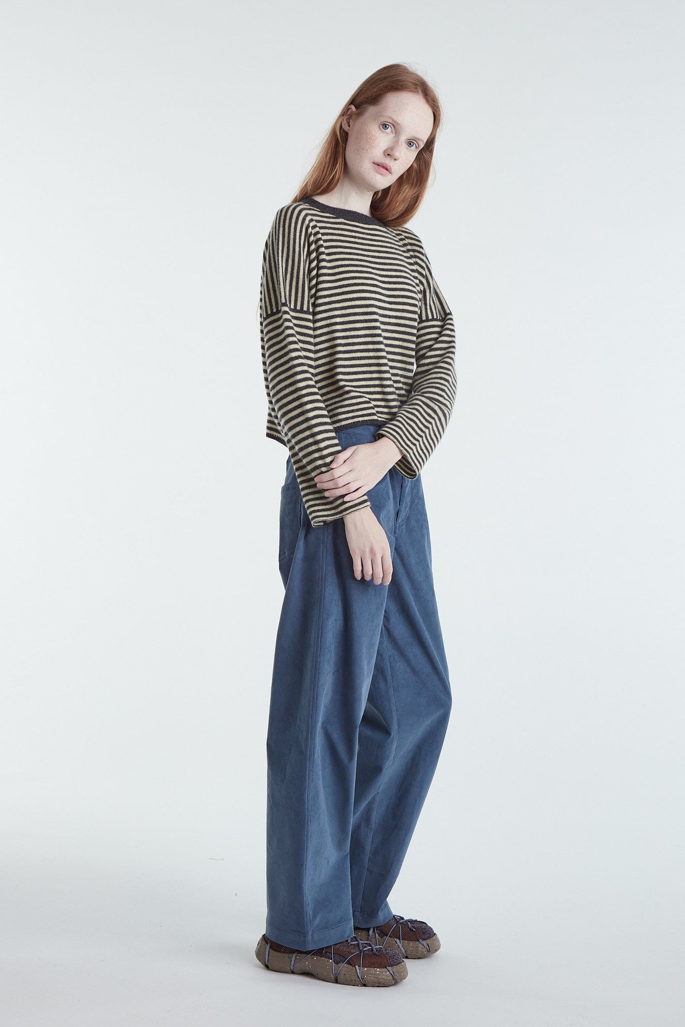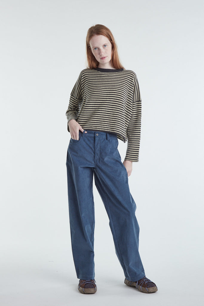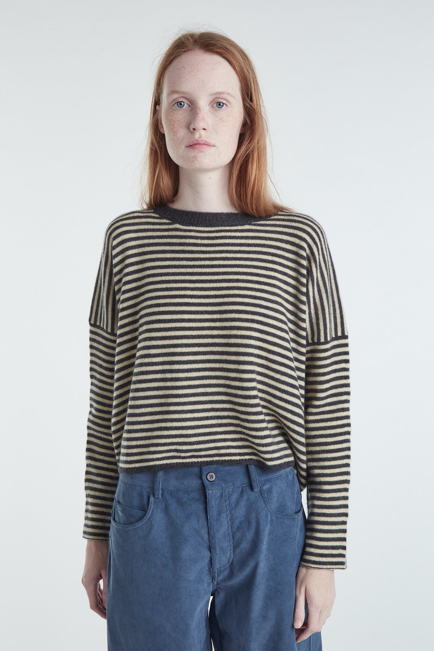 Maglia taglio a scatolina e manica larga in cashmere un filo a righe bicolor, color grigio antracite e burro. Giromanica basso, piccolo ajour sul fondo del capo e polso rifinito a catenella. La manica è impreziosita da un leggero intreccio. Vestibilità morbida. Questo capo veste perfettamente ogni donna. Realizzato con cura da artigiani italiani. Tutte le nostre maglie presentano due piccoli cristalli ricamati a mano sul fianco sinistro come tratto distintivo.