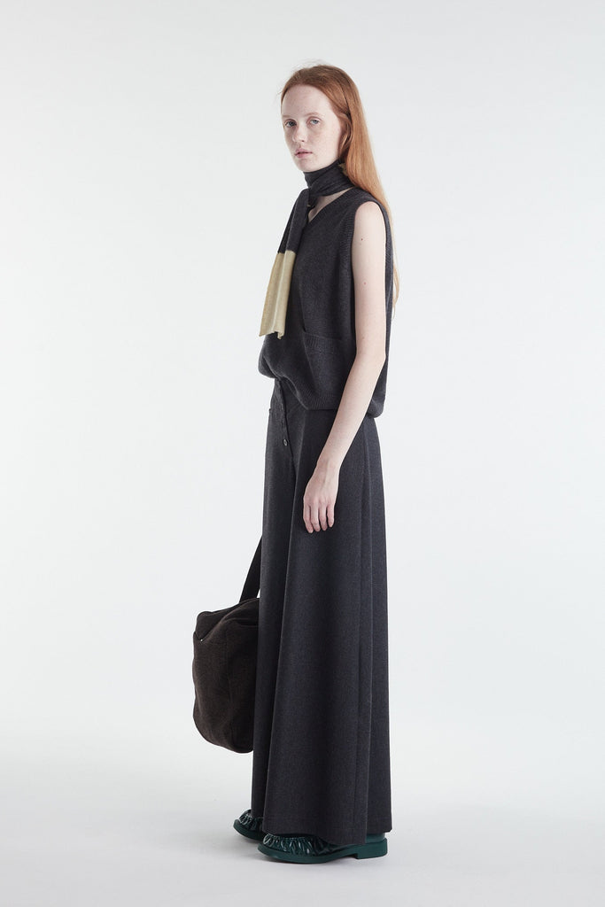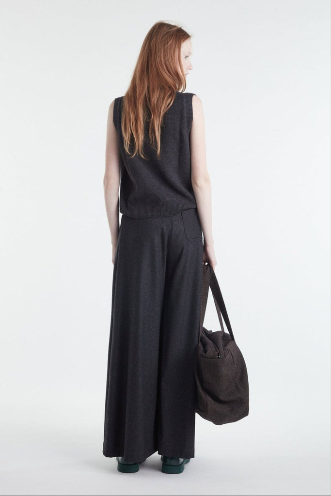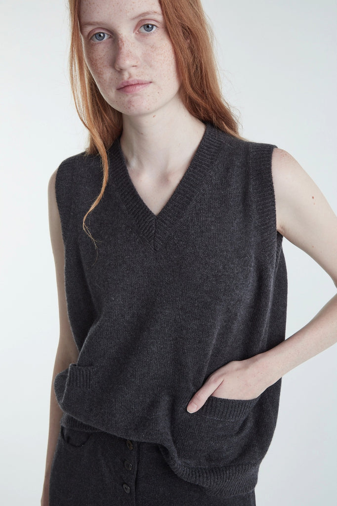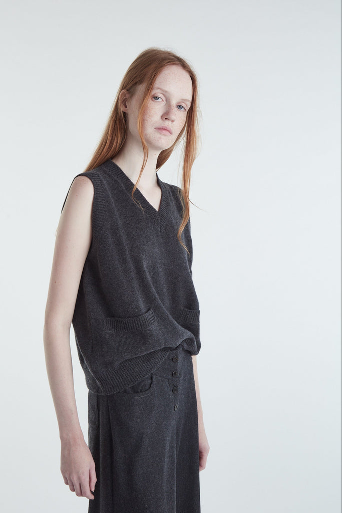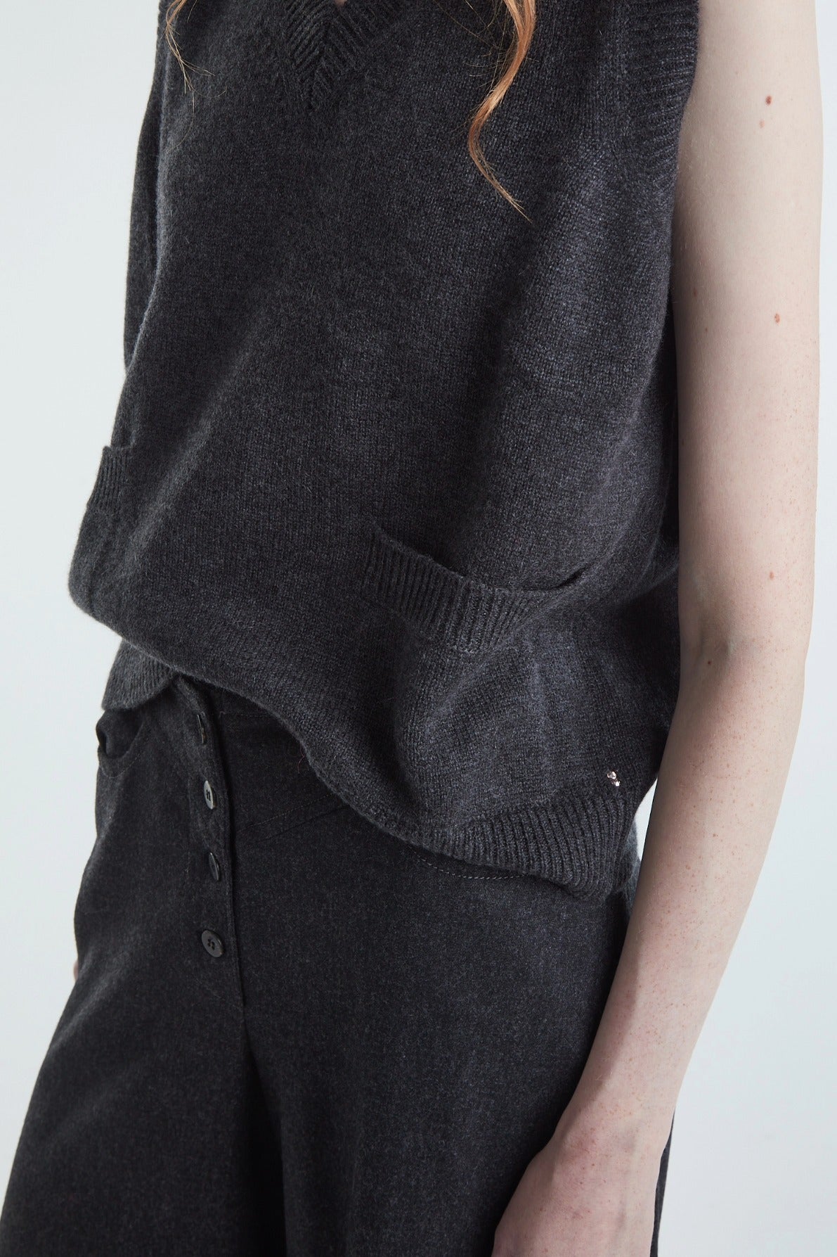 Gilet scollo a V con taschine in cashmere due fili tinta unita, color grigio antracite. Lavorazione rasato e coste sui bordi, tasche inserite e cucite a mano. La vestibilità del capo è morbida e avvolgente, con taglio leggermente a scatolina. Realizzato con cura da artigiani italiani. Tutte le nostre maglie presentano due piccoli cristalli ricamati a mano sul fianco sinistro come tratto distintivo.