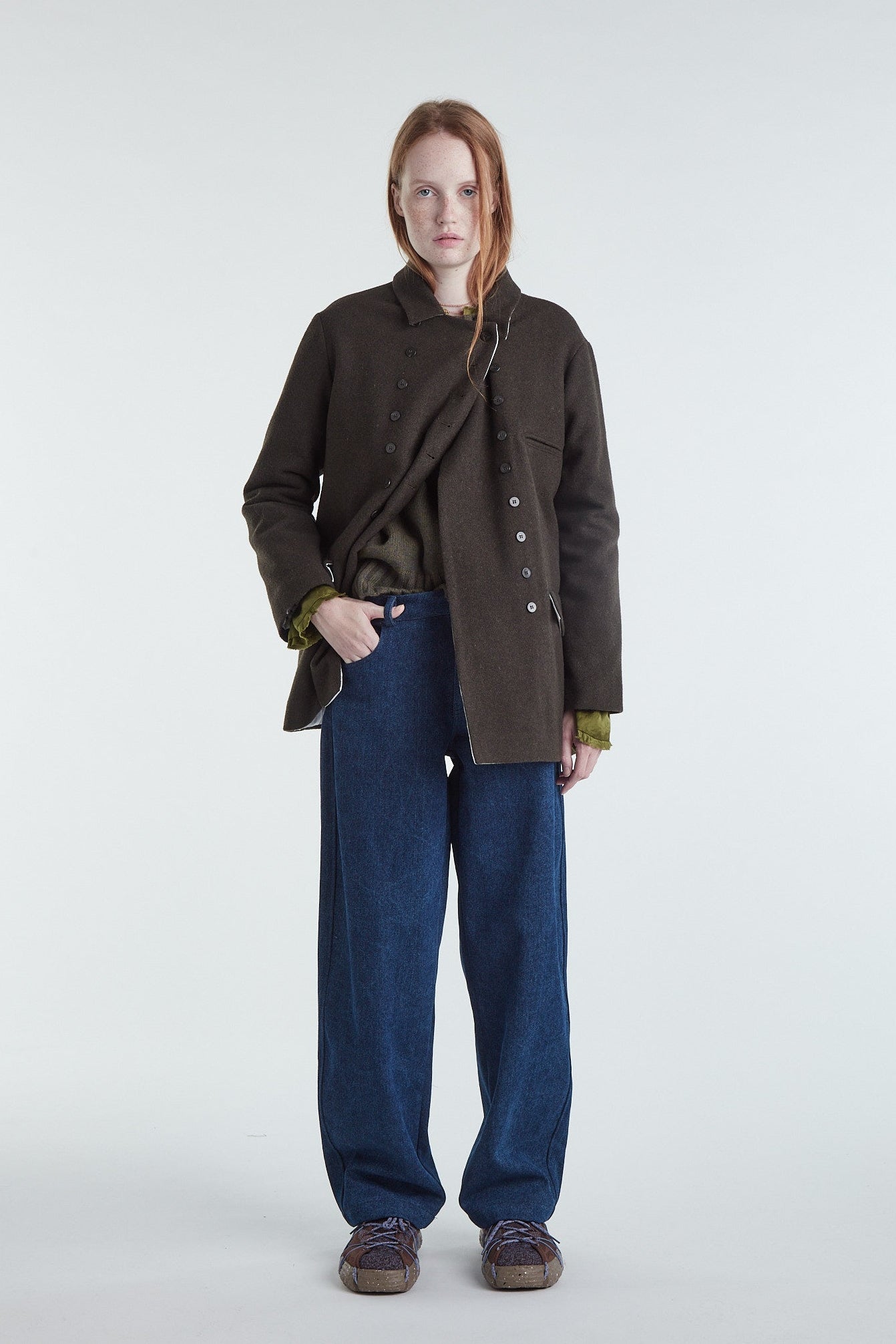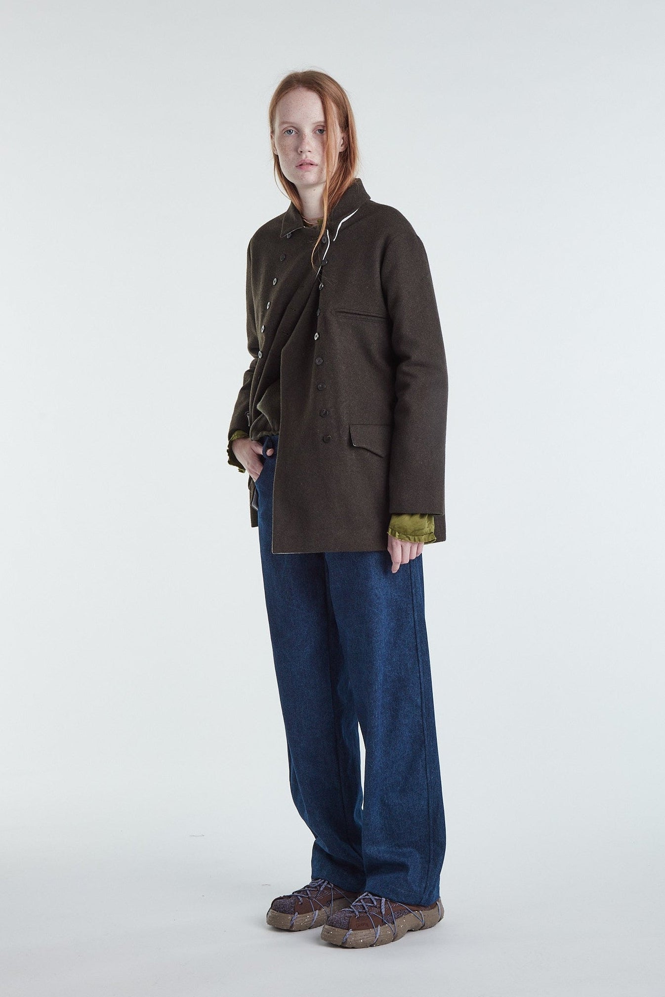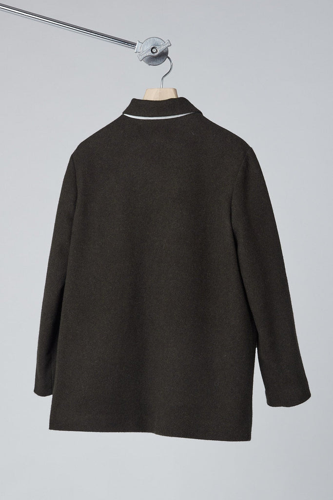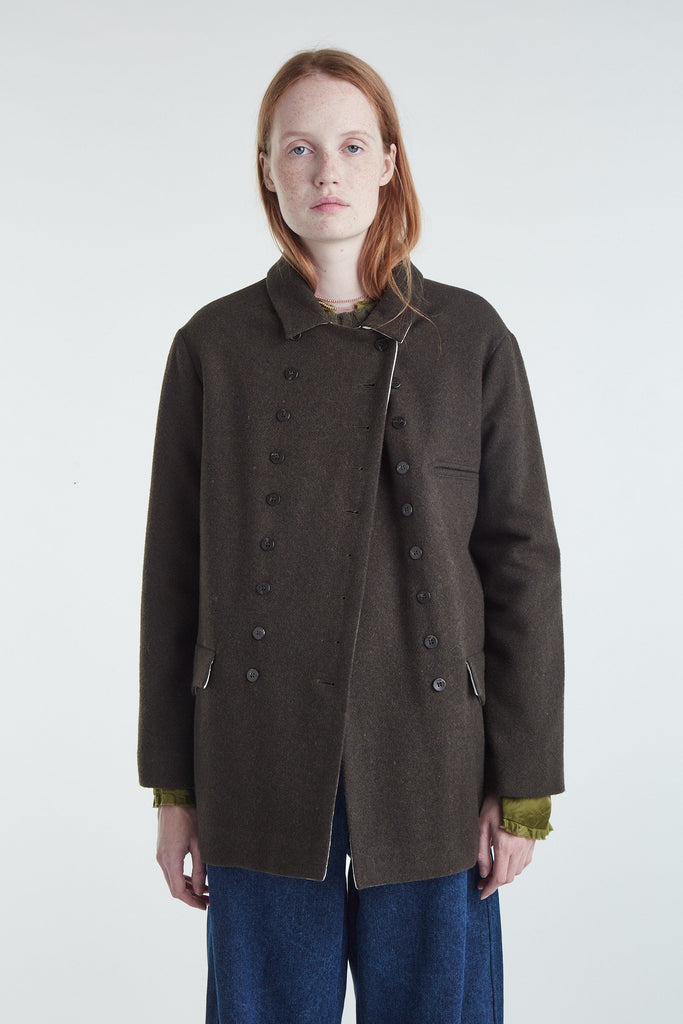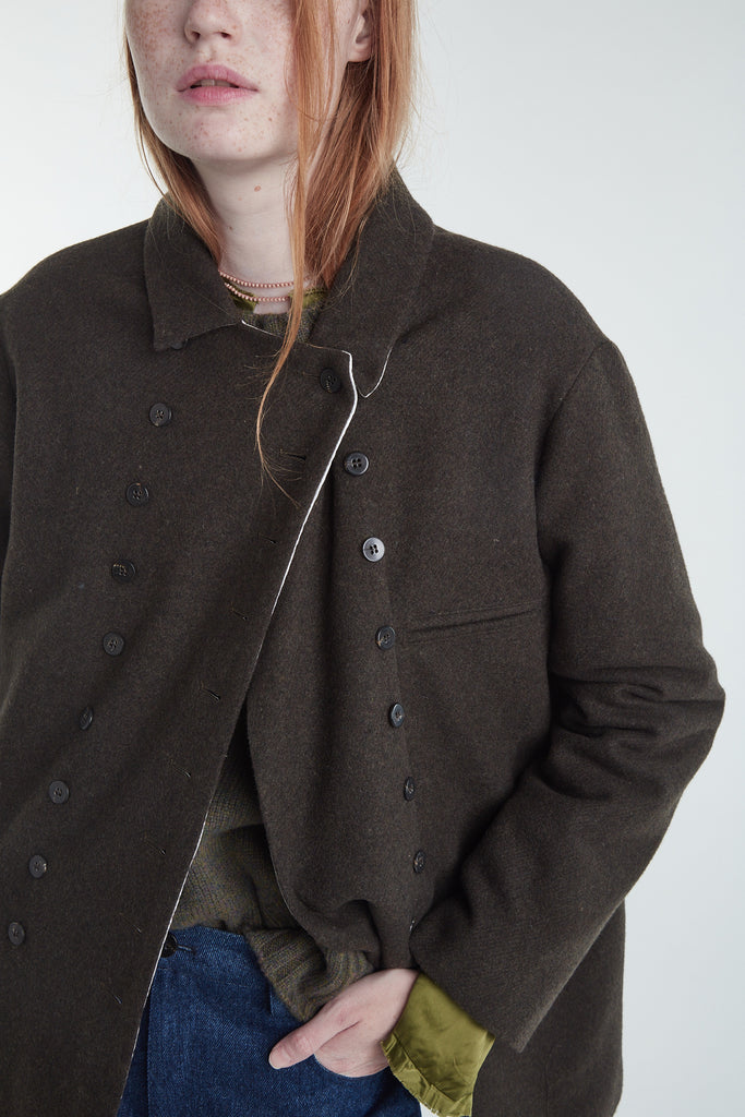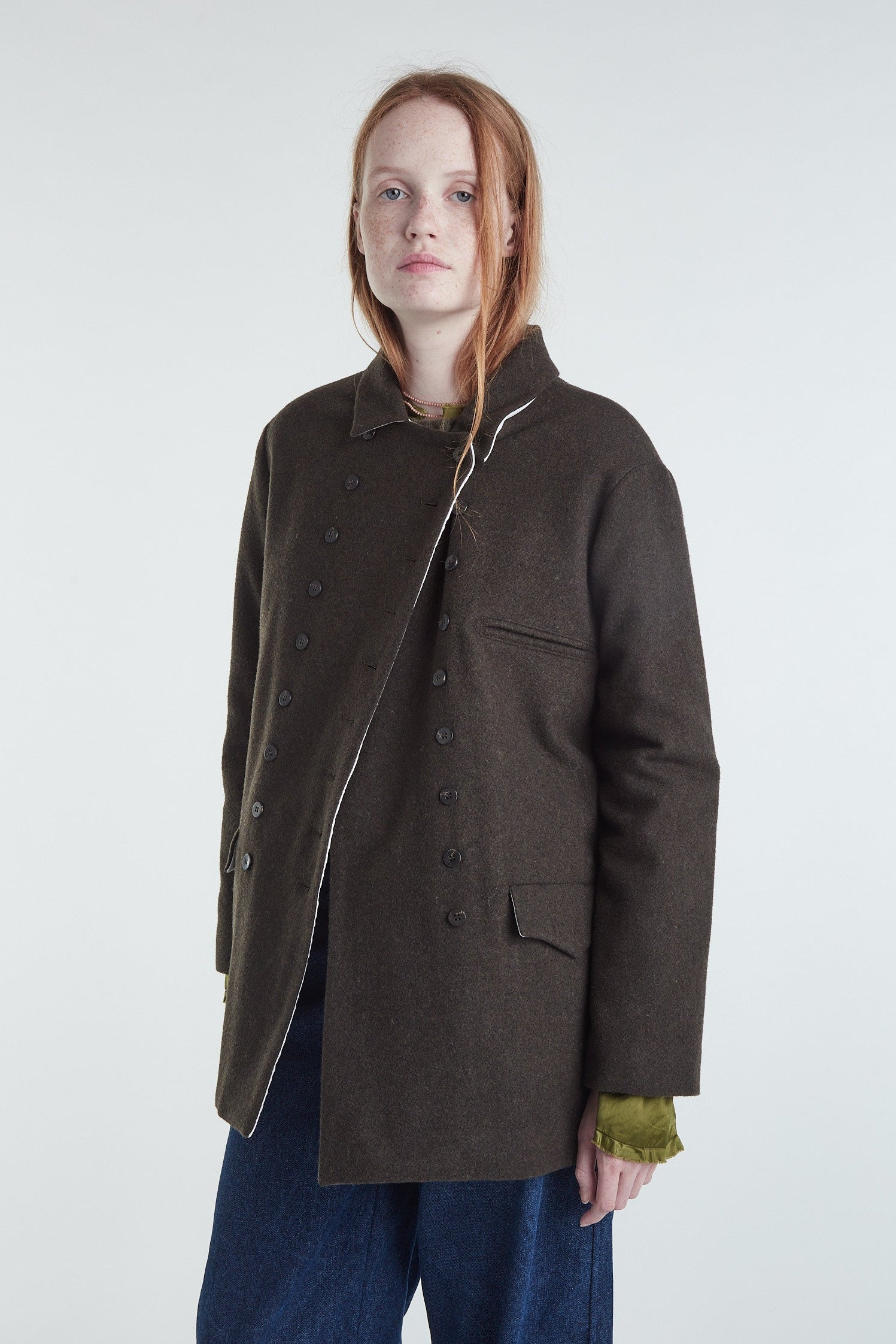 Giacca doppiopetto in panno di lana giapponese color khaki. Taglio a uovo oversize, spalla scesa, colletto piccolo a punta, diciotto bottoni centrali e uno sotto il collo, due tasche con patta a punta, una tasca a filetto con travette in alto a sinistra. Fodera corpo cucita a filo, imbottita con Thermore originale.