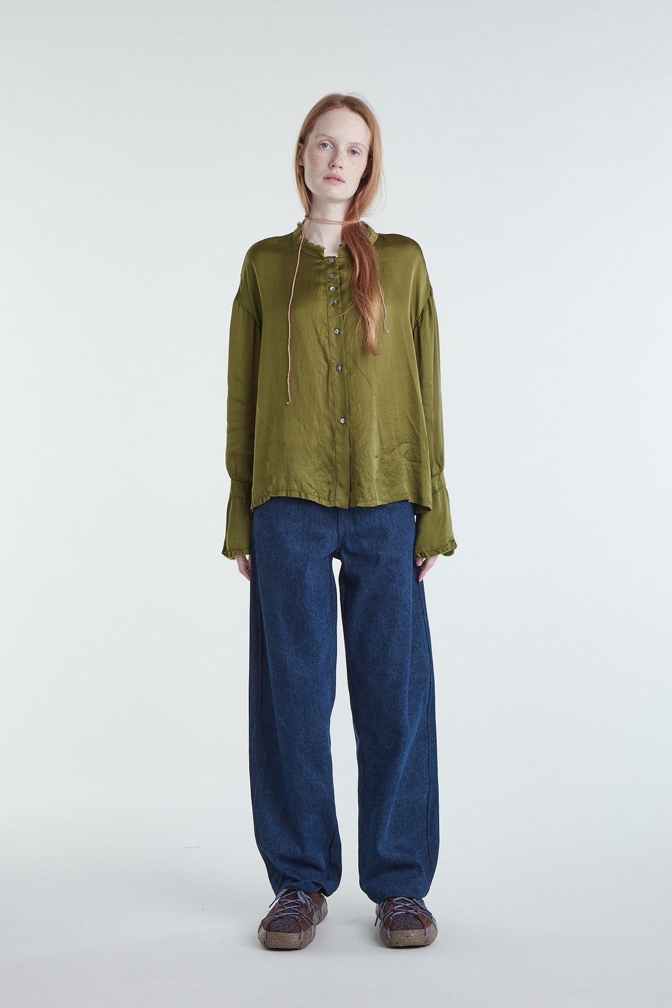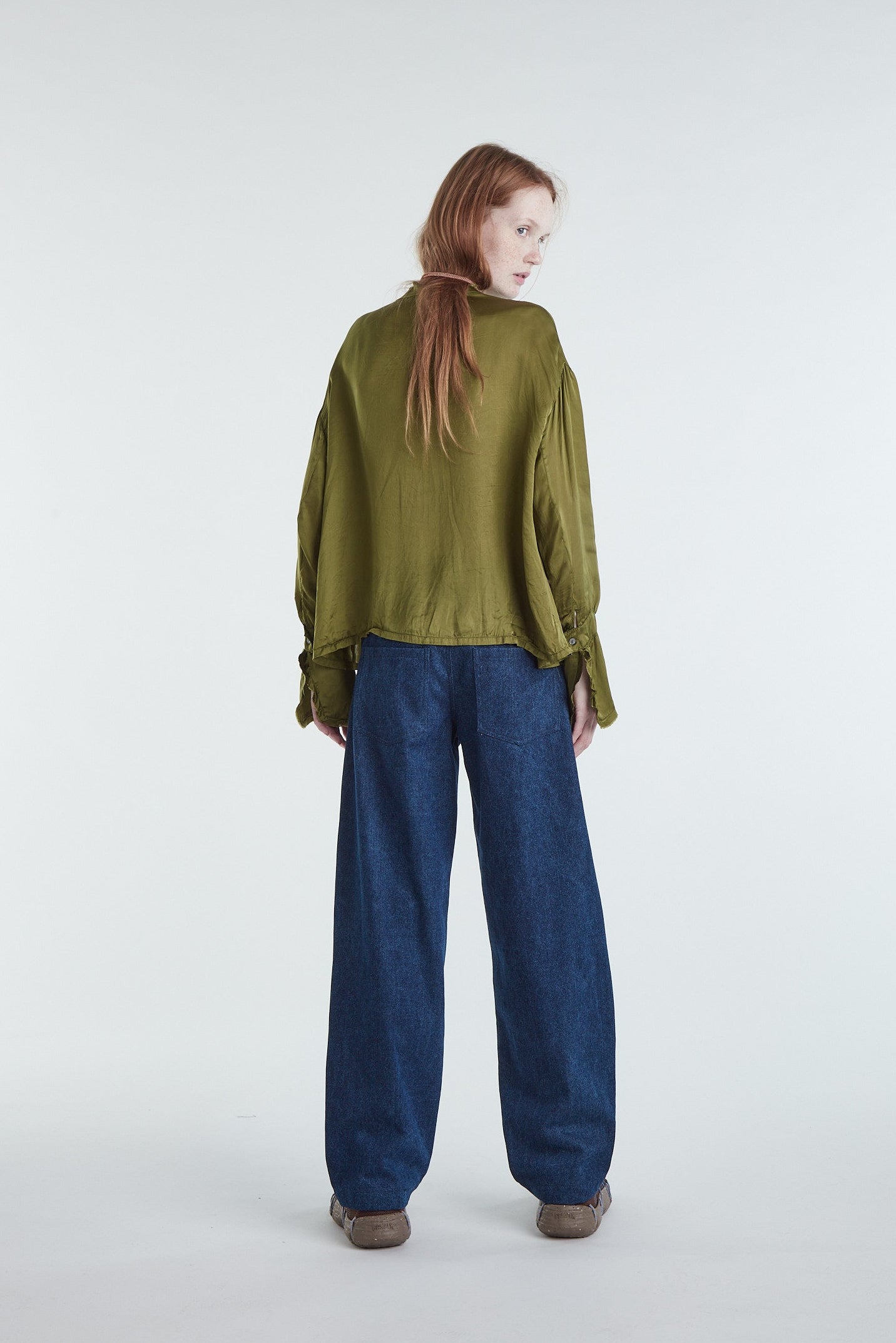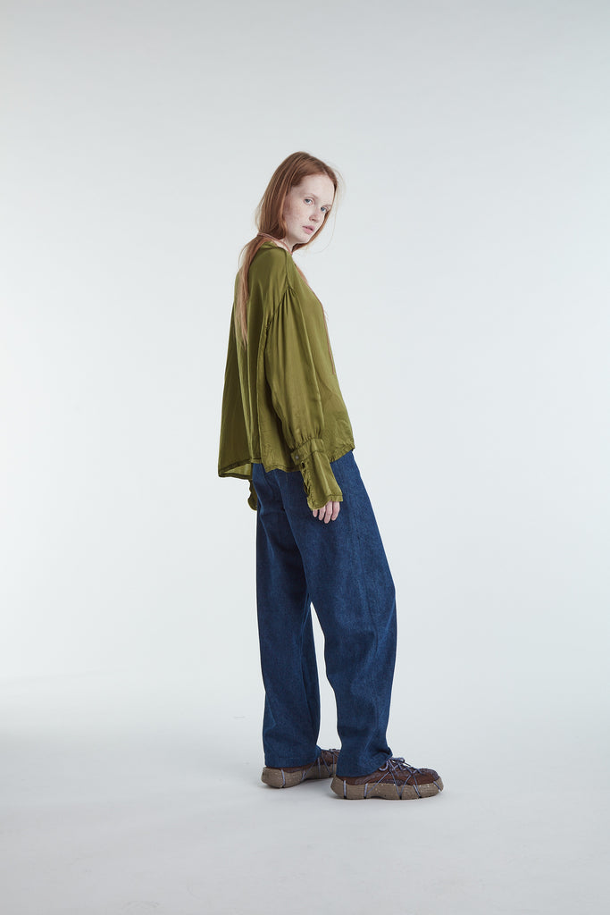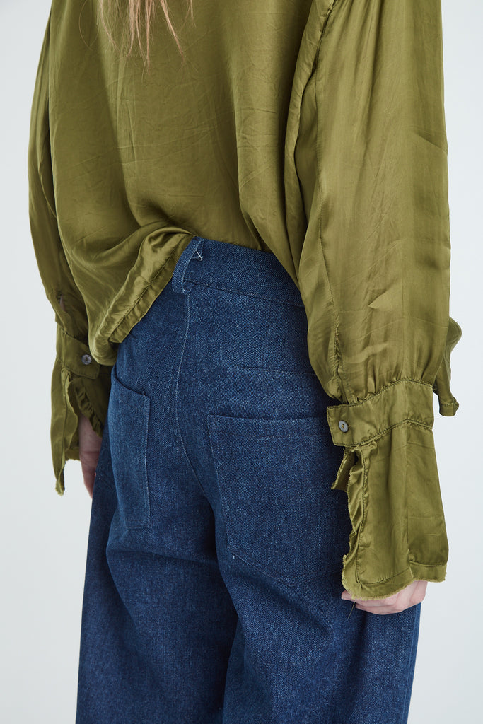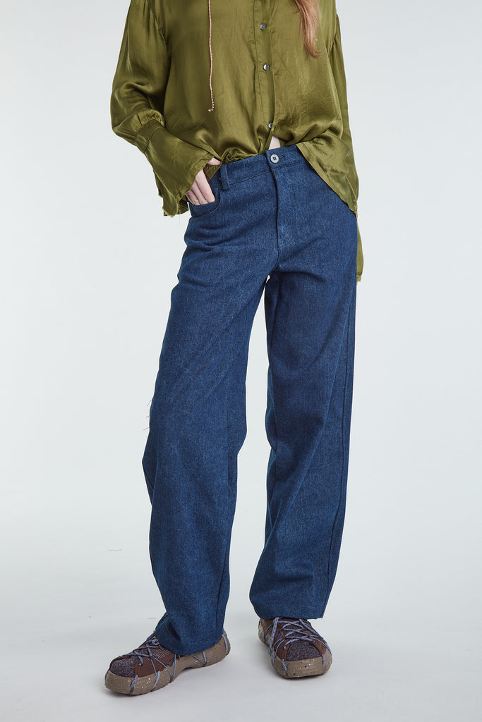 Pantalone cinque tasche a vita bassa, in morbido denim di cotone. Taglio gamba diritto e morbido, cinturino con passanti, cintura rifinita internamente con sbieco in cotone a quadretti. Chiusura centrale con zip e bottone, tasche posteriori basse e a punta, cuciture impunturate a contrasto che conferiscono carattere al capo.