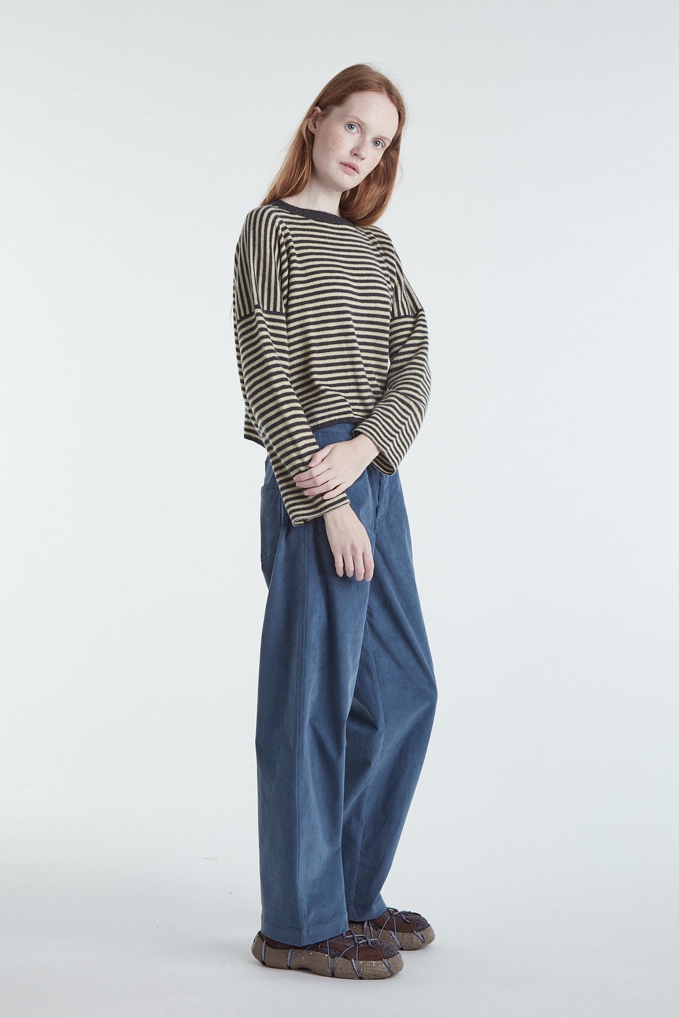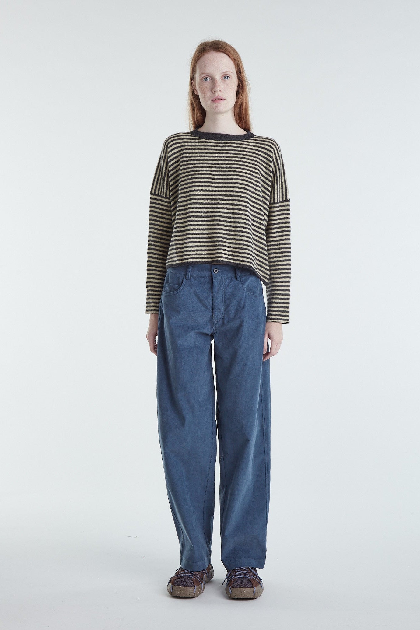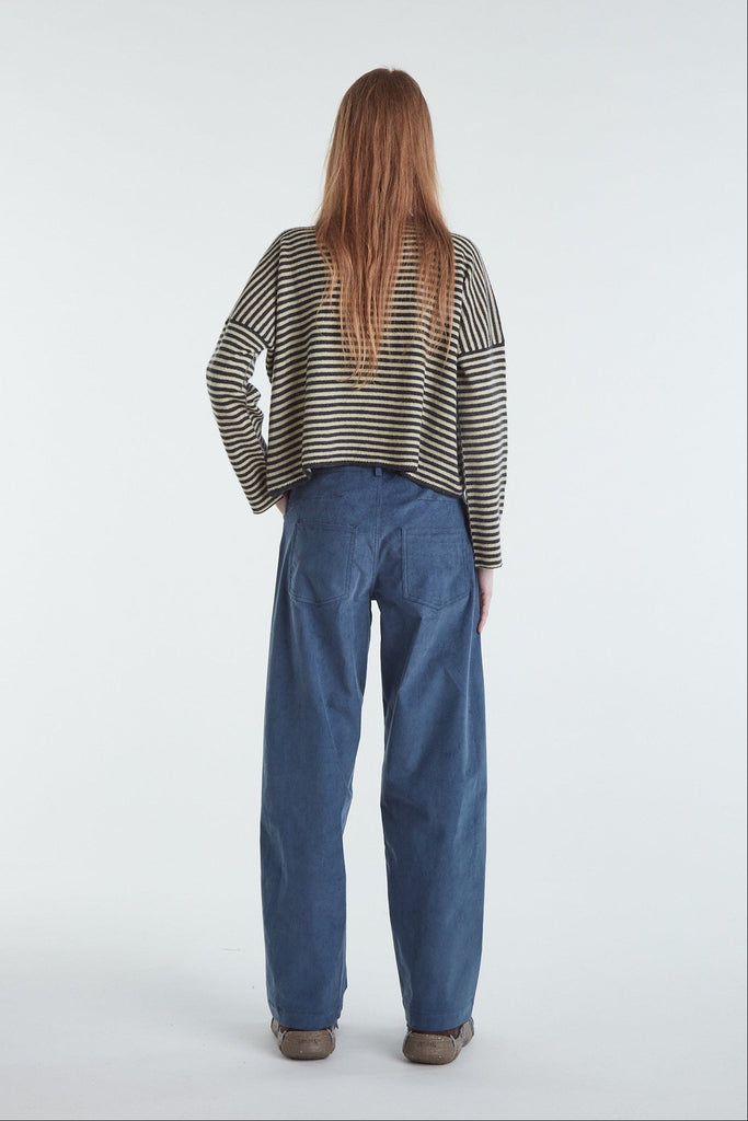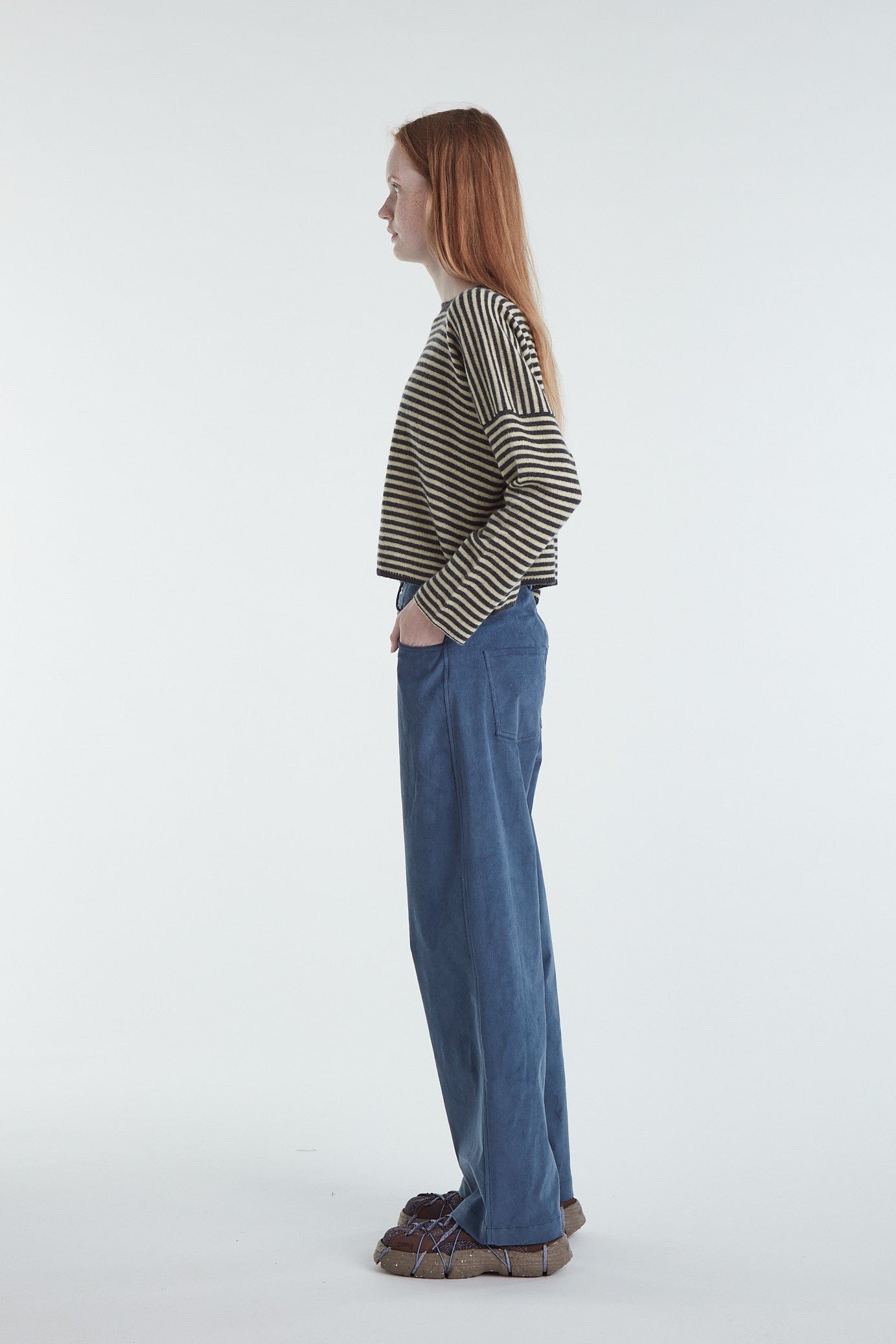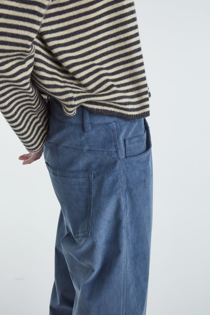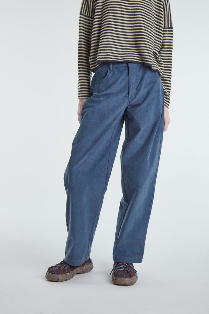 Pantalone cinque tasche a vita bassa, in morbido velluto di cotone a costine tremila righe color avio. Taglio gamba diritto e morbido, cintura con passanti rifinita internamente con sbieco in cotone a quadretti, chiusura centrale con zip e bottone, tasche posteriori basse e a punta, cuciture impunturate che conferiscono carattere al capo.