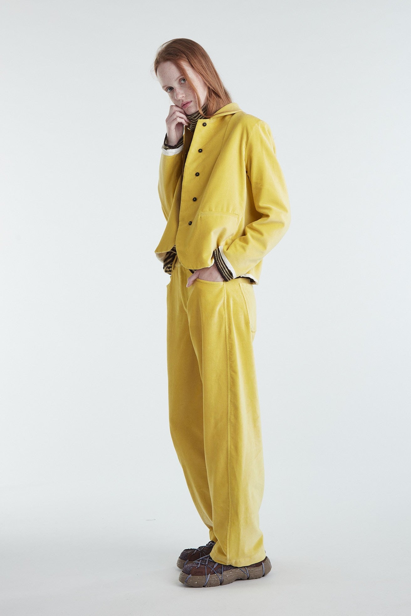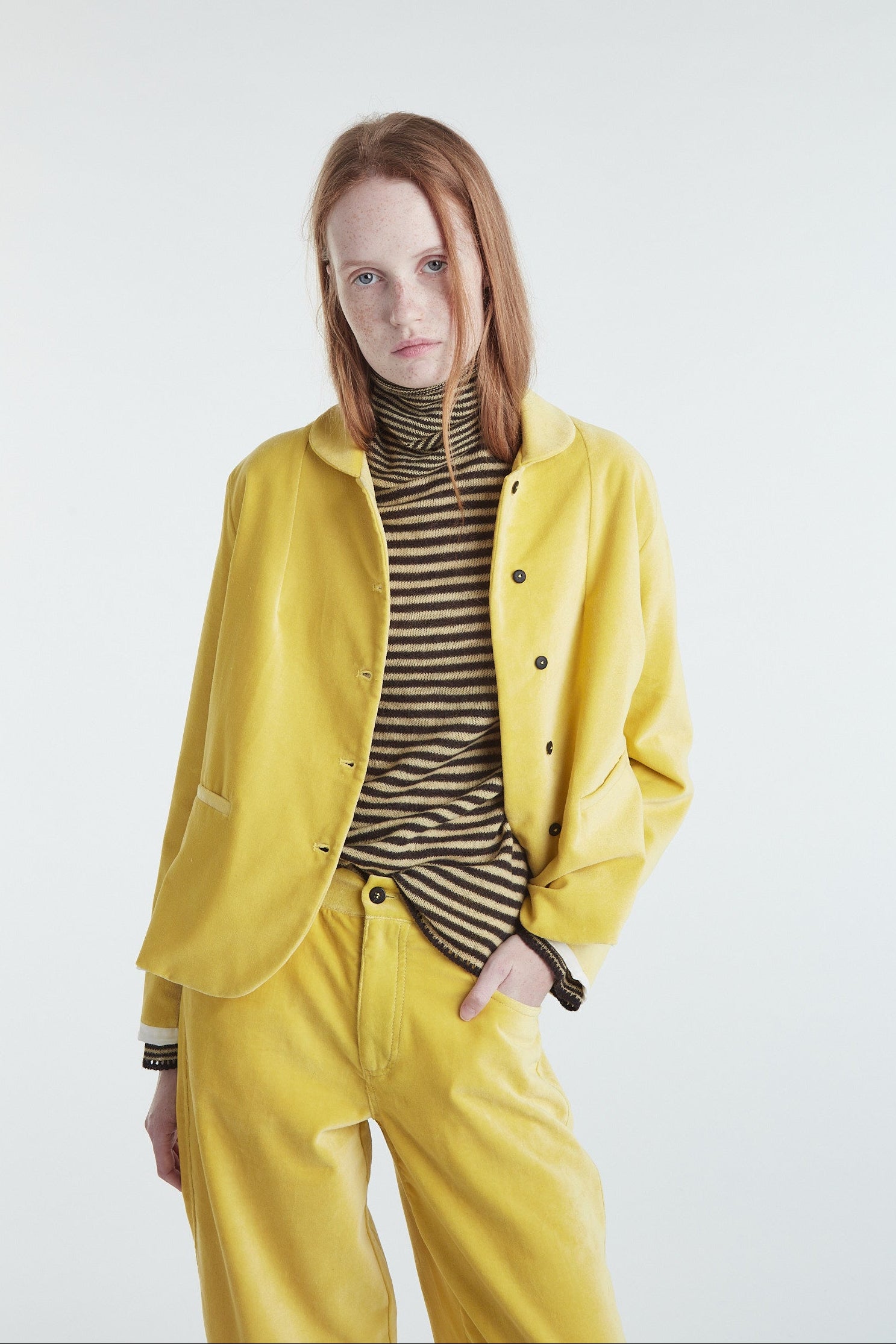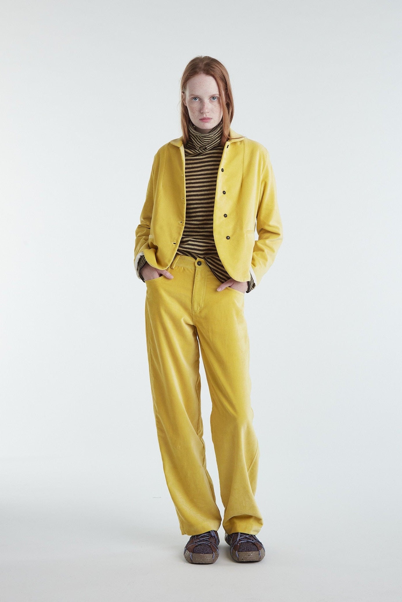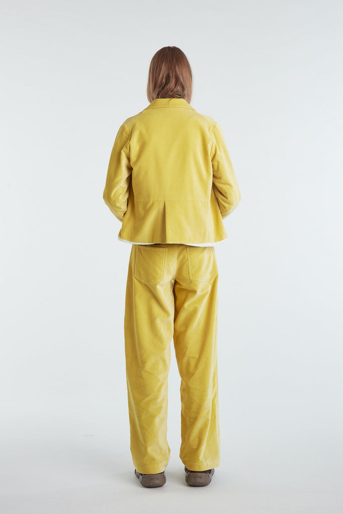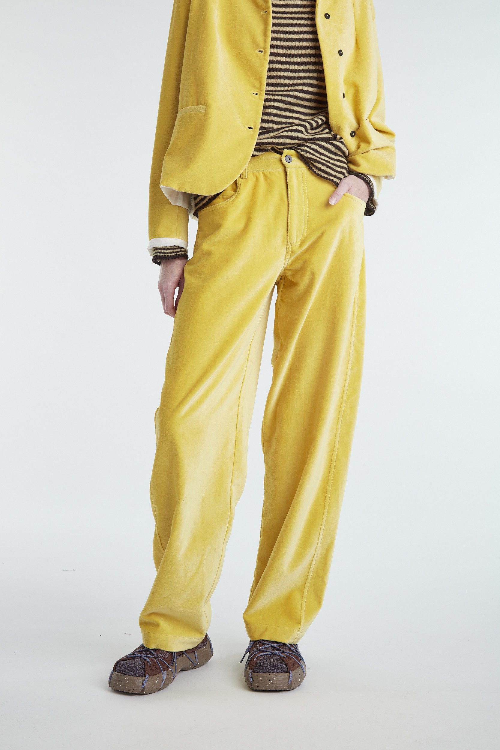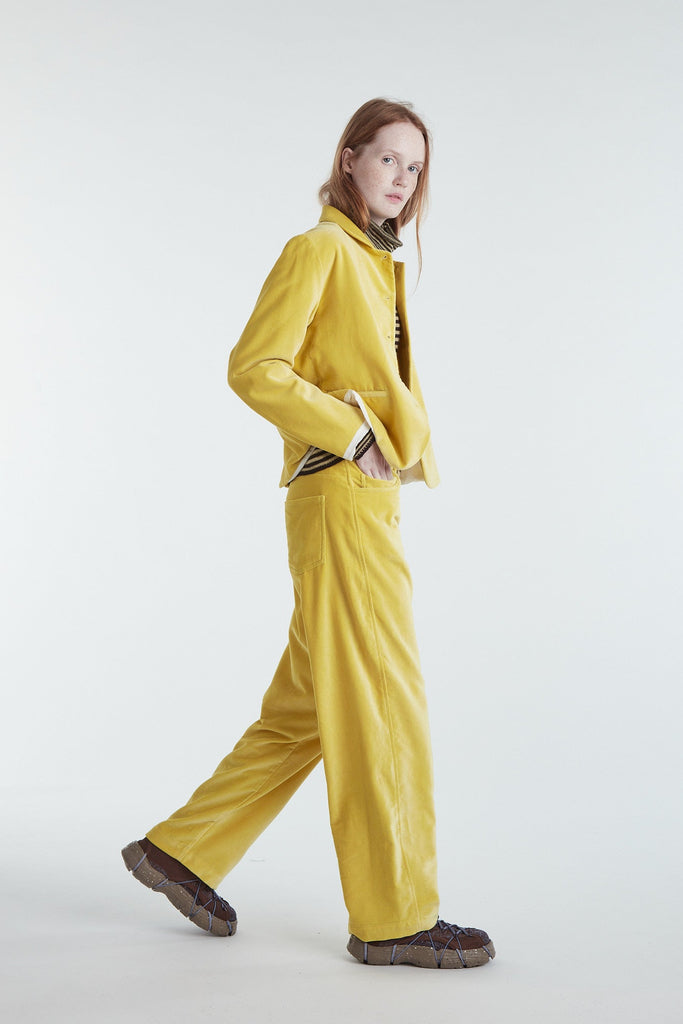 Pantalone cinque tasche a vita bassa, in morbido velluto di cotone leggermente elasticizzato color giallo mais. Taglio gamba diritto e morbido, cinturino con passanti, cintura rifinita internamente con sbieco in cotone a quadretti, chiusura centrale con zip e bottone, tasche posteriori basse e a punta, cuciture impunturate (a contrasto per denim) che conferiscono carattere al capo.
