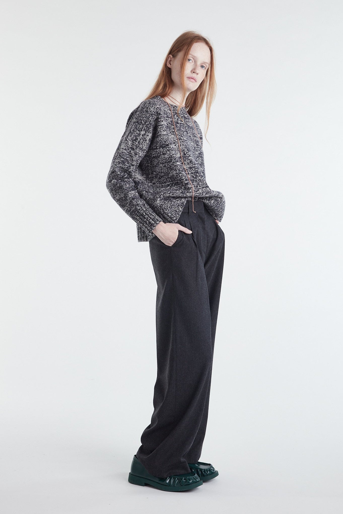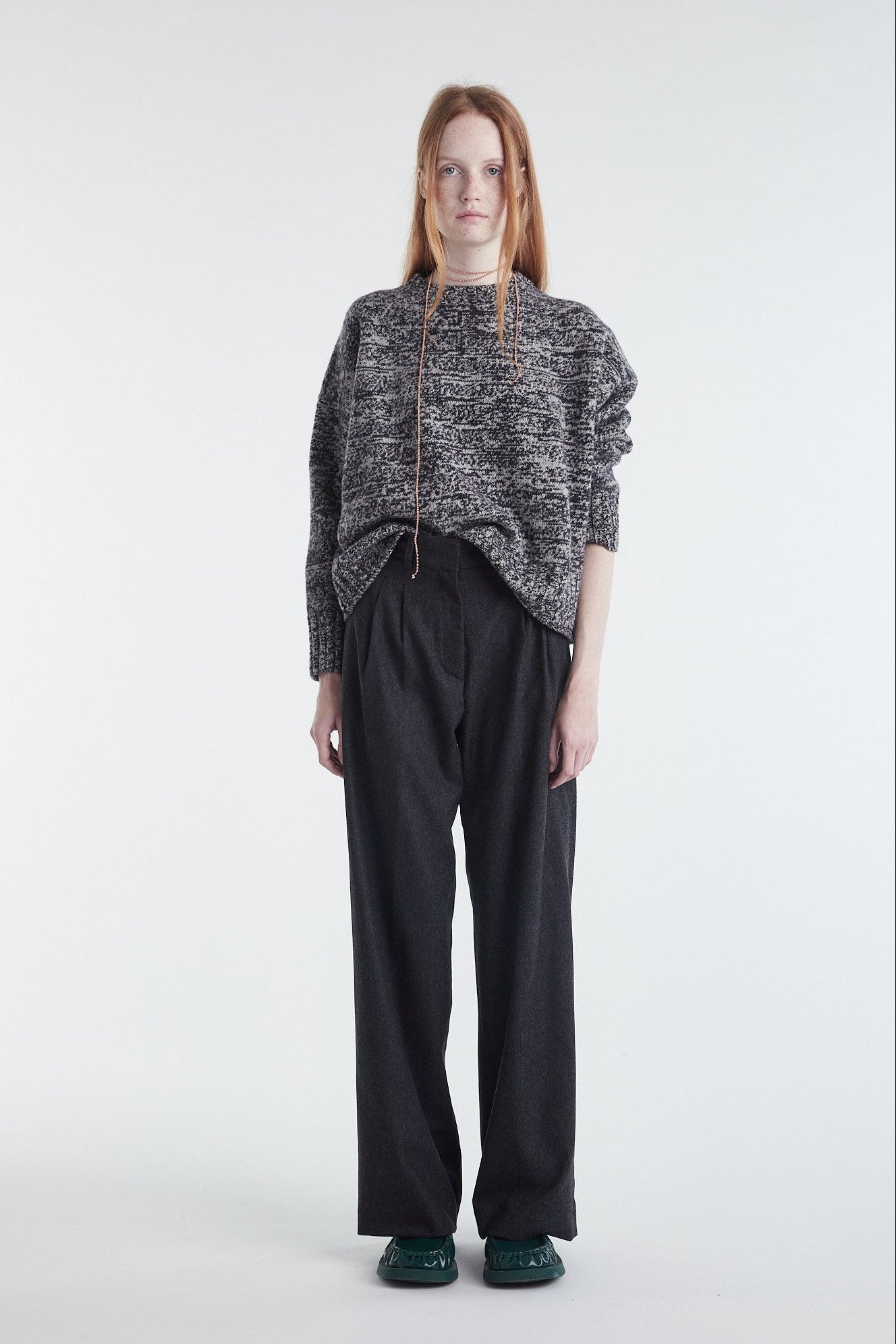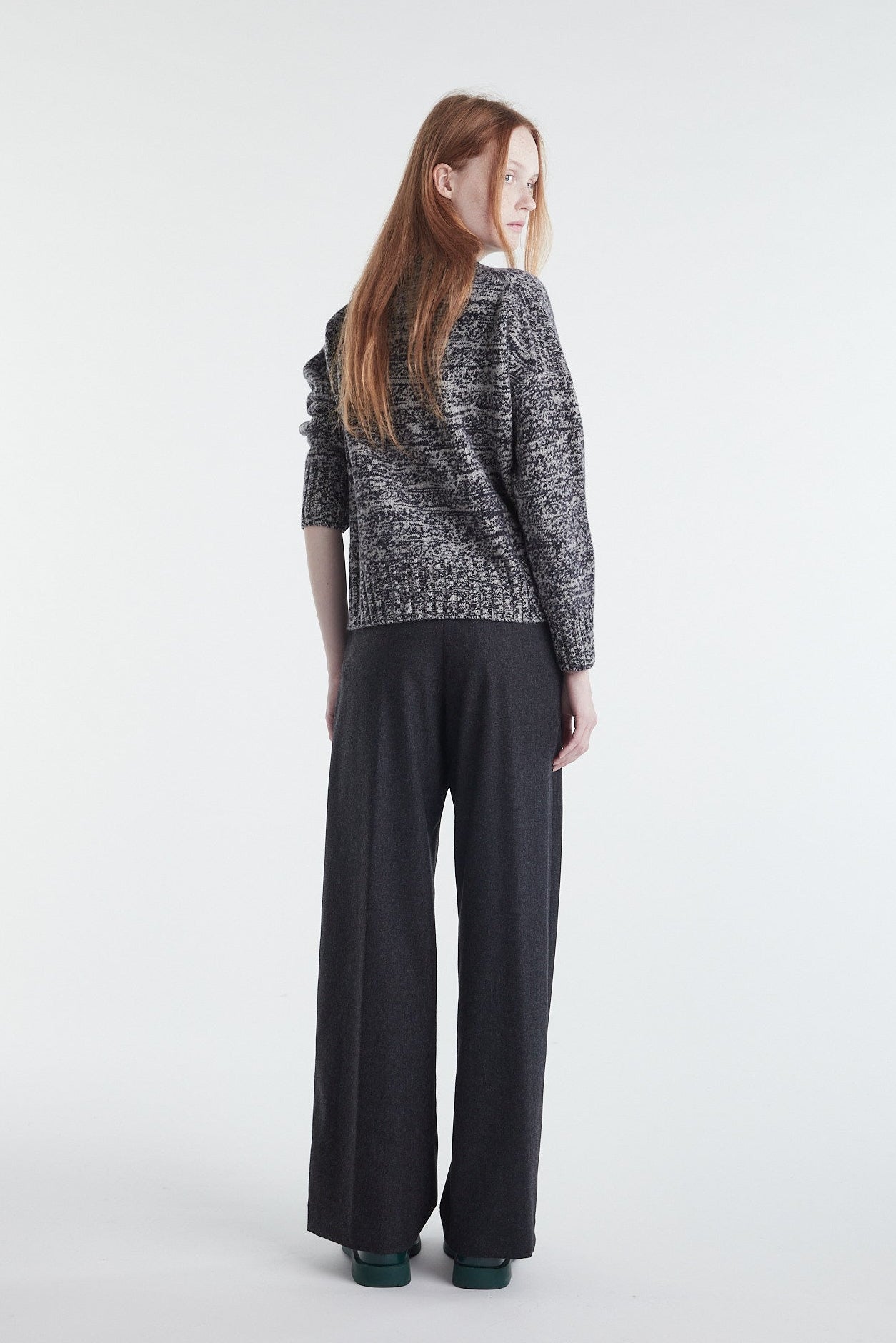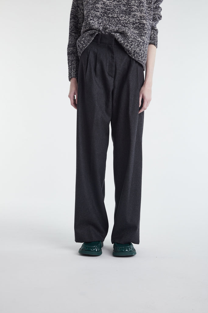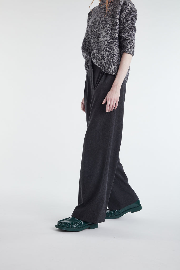 Pantalone a vita alta taglio maschile, in flanella di lana misto viscosa color grigio. Taglio gamba svasato con orlo alto sul fondo, cintura con passanti rifinita internamente in tessuto, due piccole pinces sul davanti, chiusura centrale con zip e gancino interno, cuciture interne rifinite con sbieco di cotone a quadretti, tasche laterali all’americana, tasca posteriore a filetto.