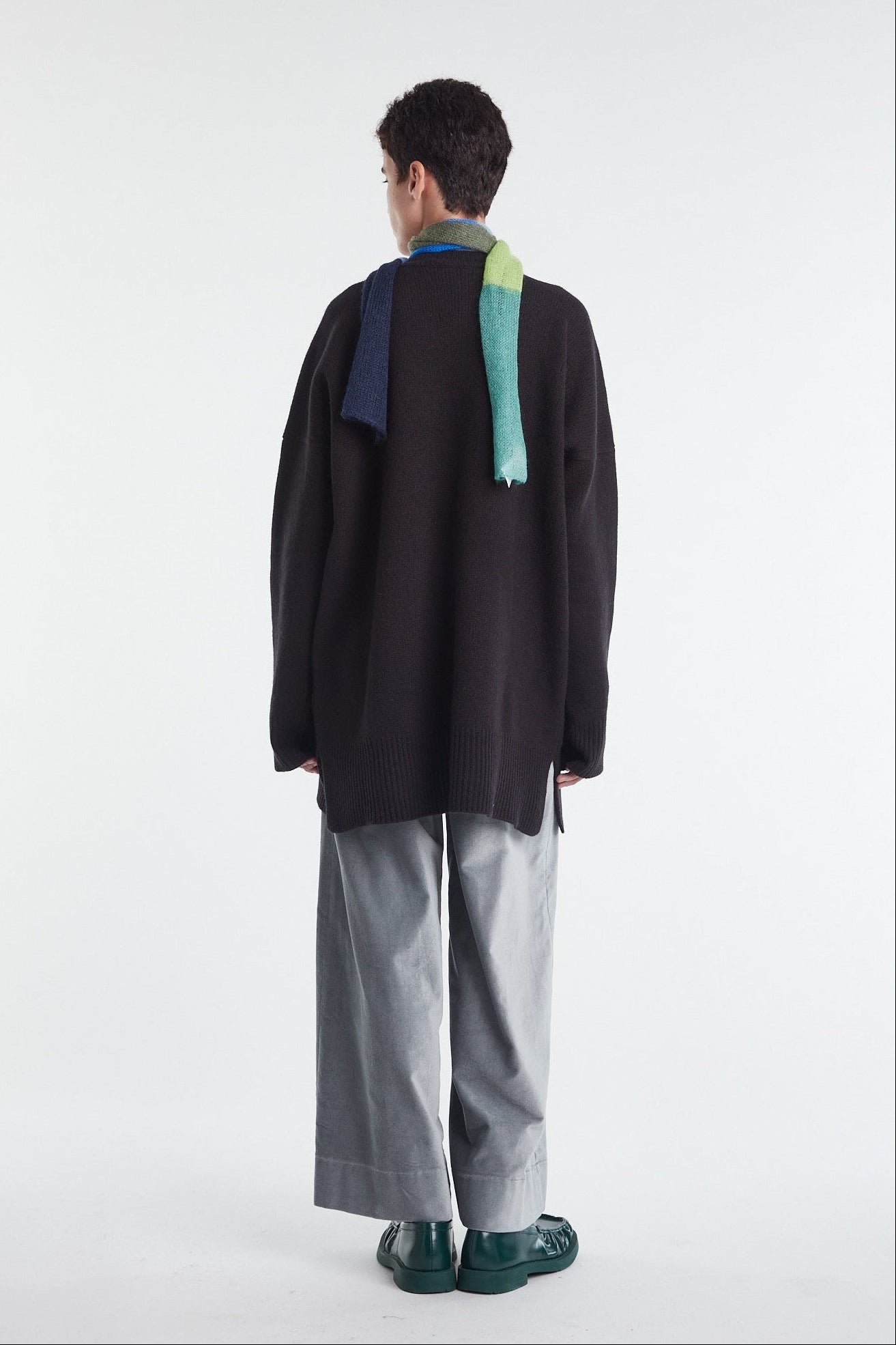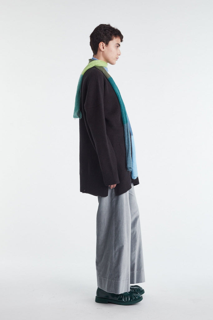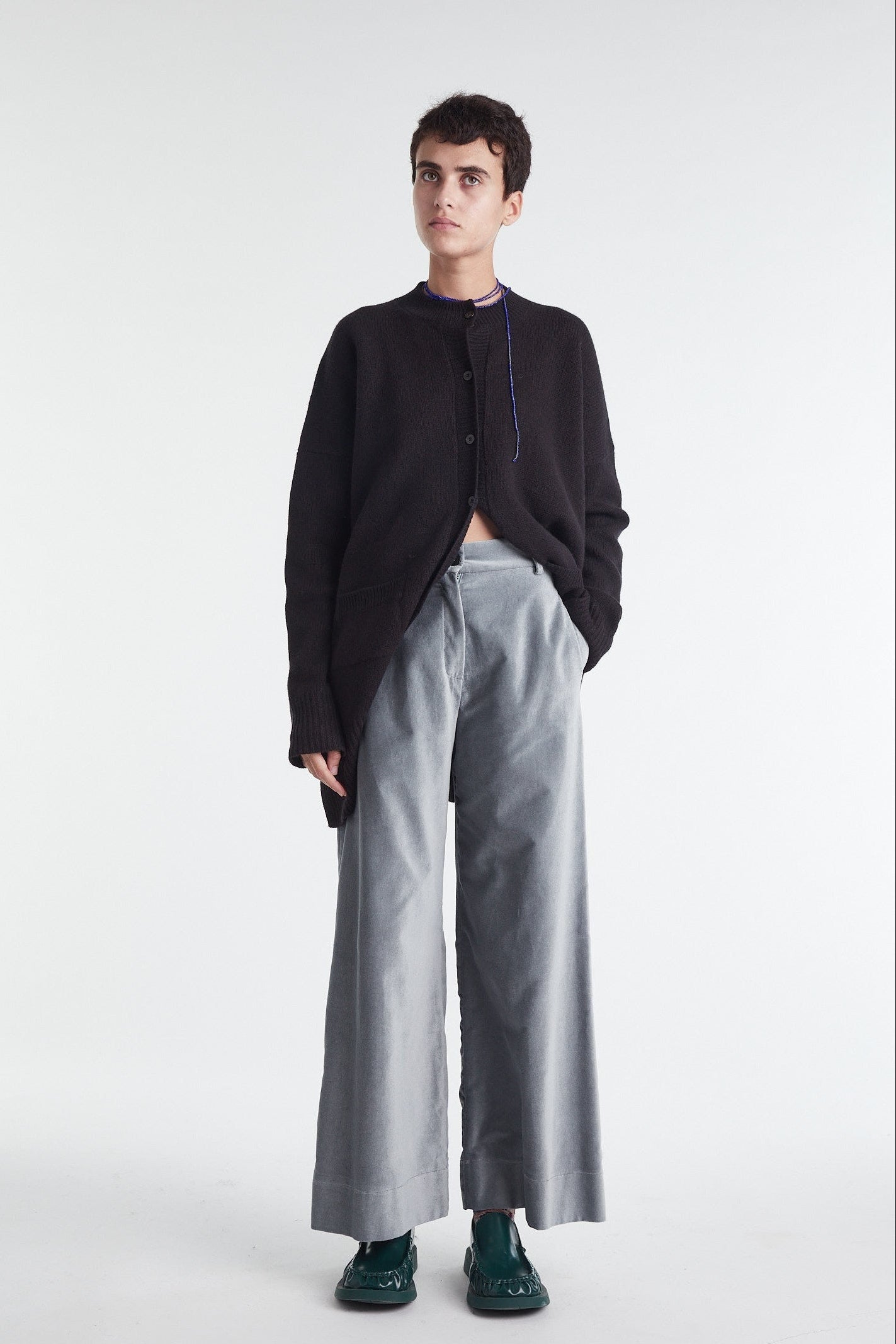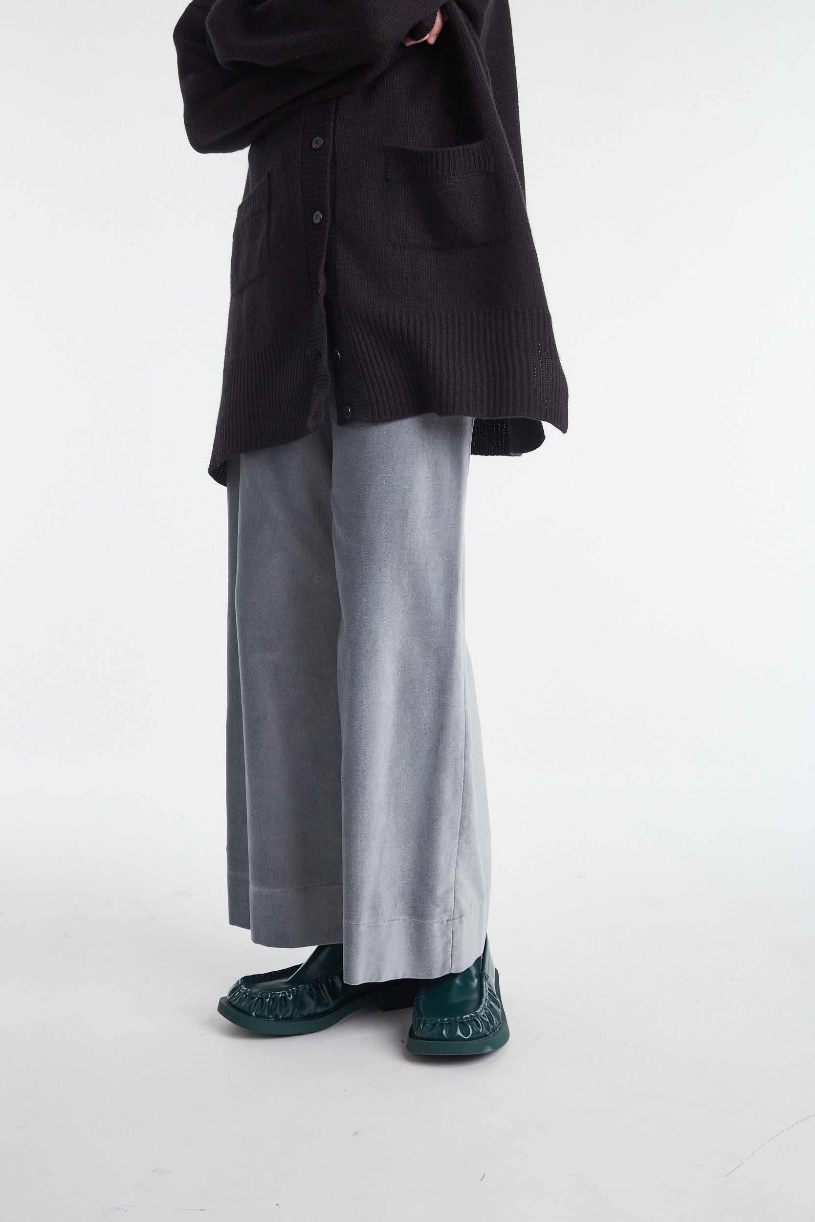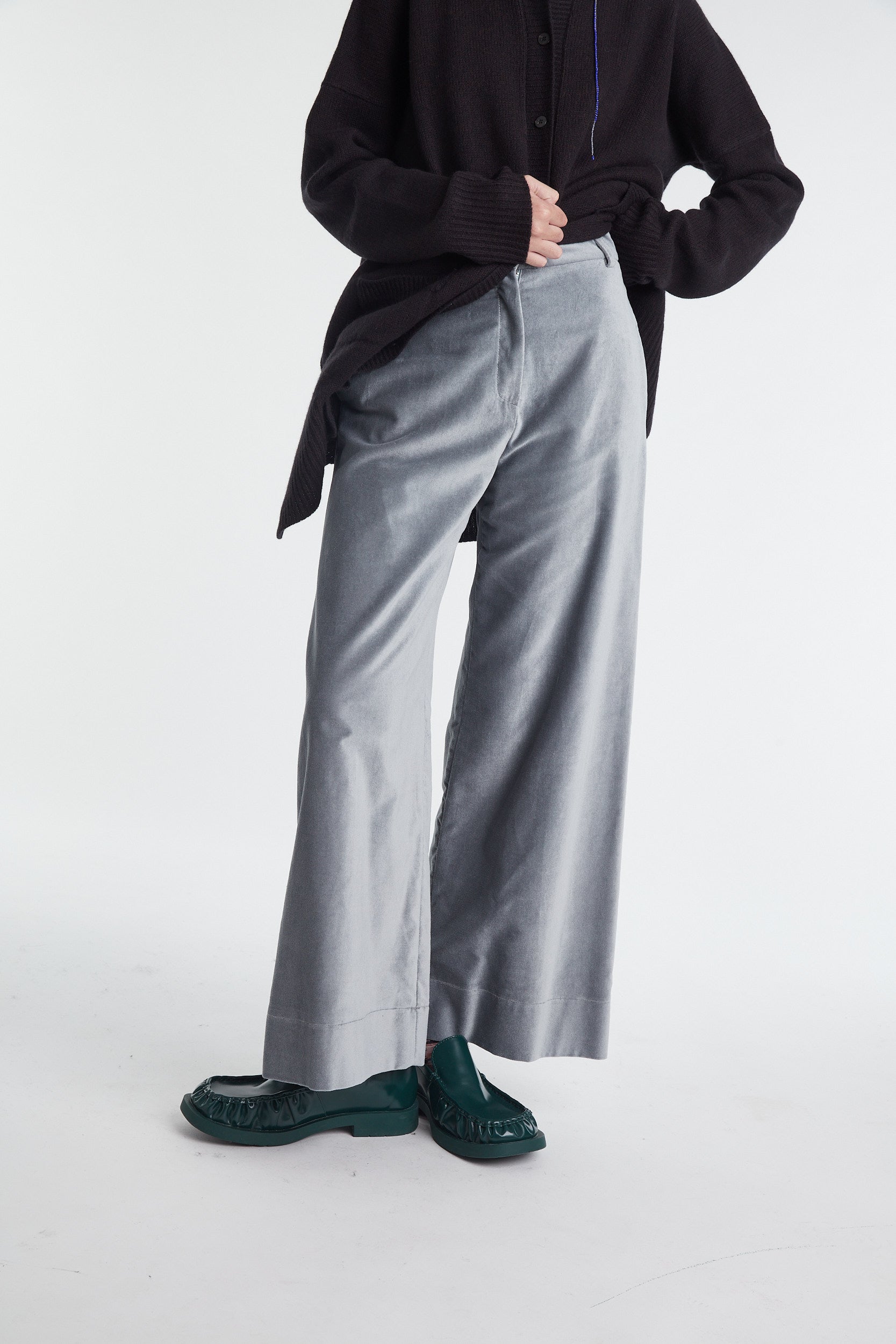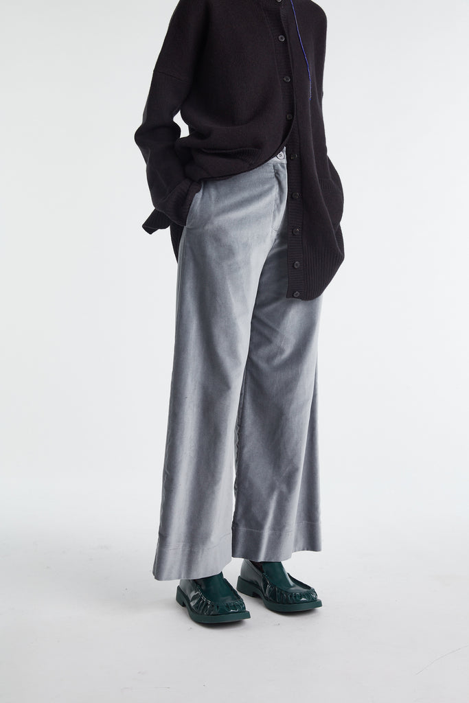 Pantalone svasato a vita alta, in morbido velluto di cotone leggermente elasticizzato color grigio quarzo. Taglio gamba leggermente a trapezio con orlo alto sul fondo, chiusura centrale con zip interna e bottone centrale sul cinturino, cintura rifinita internamente con sbieco in cotone a quadretti, passanti in vita, tasche laterali cucite nel fianco.