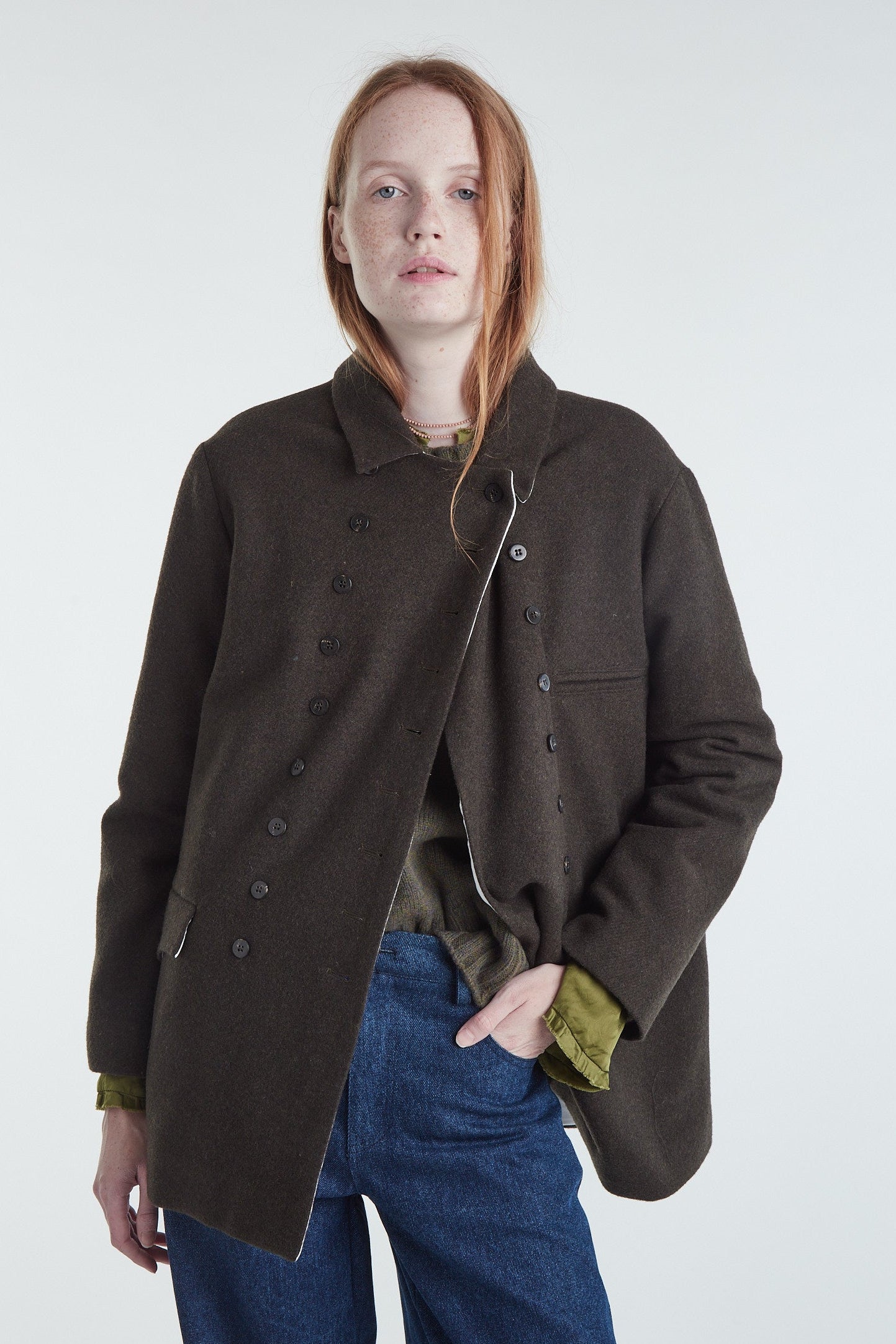 Double-breasted jacket in crumpled and embossed wool and cotton gauze with metallic fiber, sand color: oversized egg cut, dropped shoulder, small pointed collar, 18 central buttons and 1 under the collar, 2 pockets with pointed flaps, 1 welt pocket with bar tacks on the top left. Cotton body lining sewn with thread, cotton blend sleeve lining, padded with original Thermore.