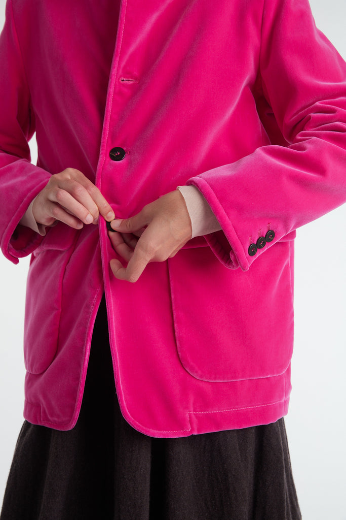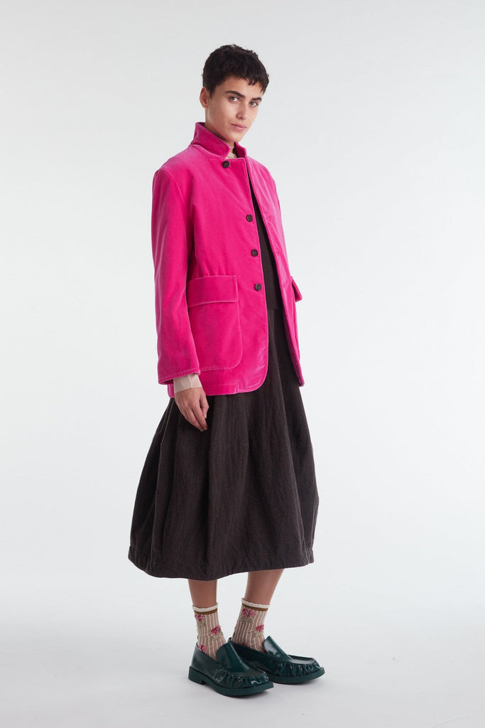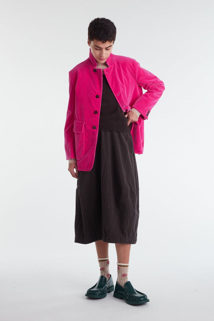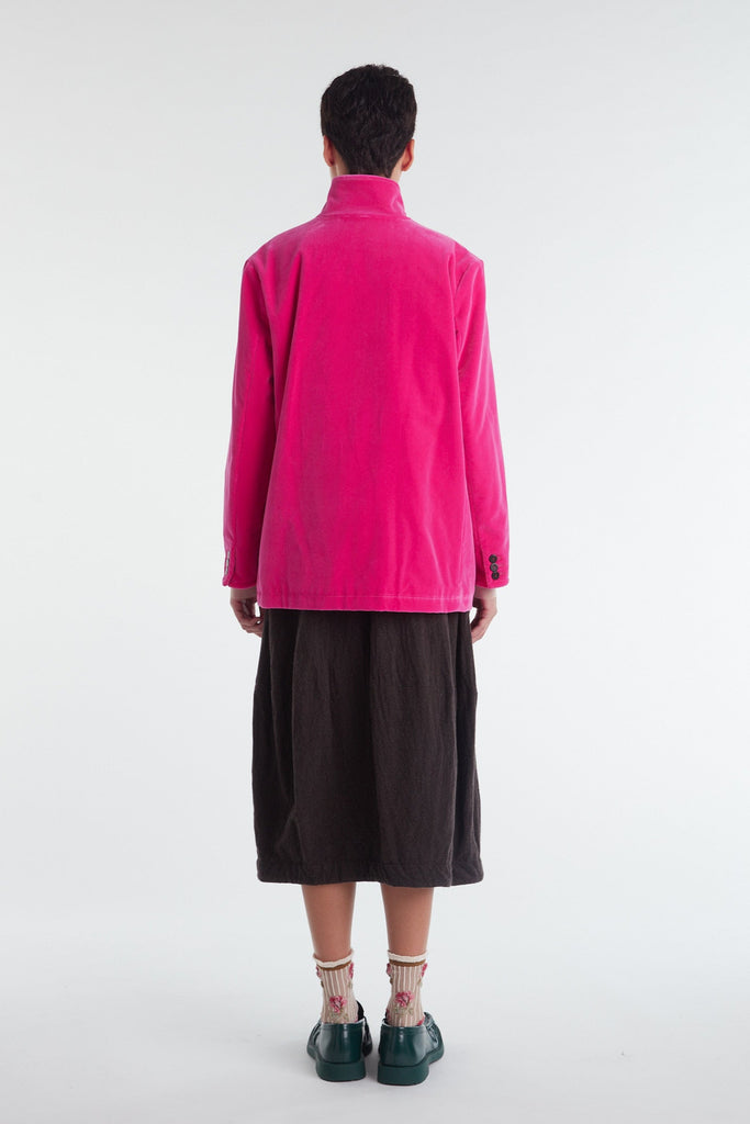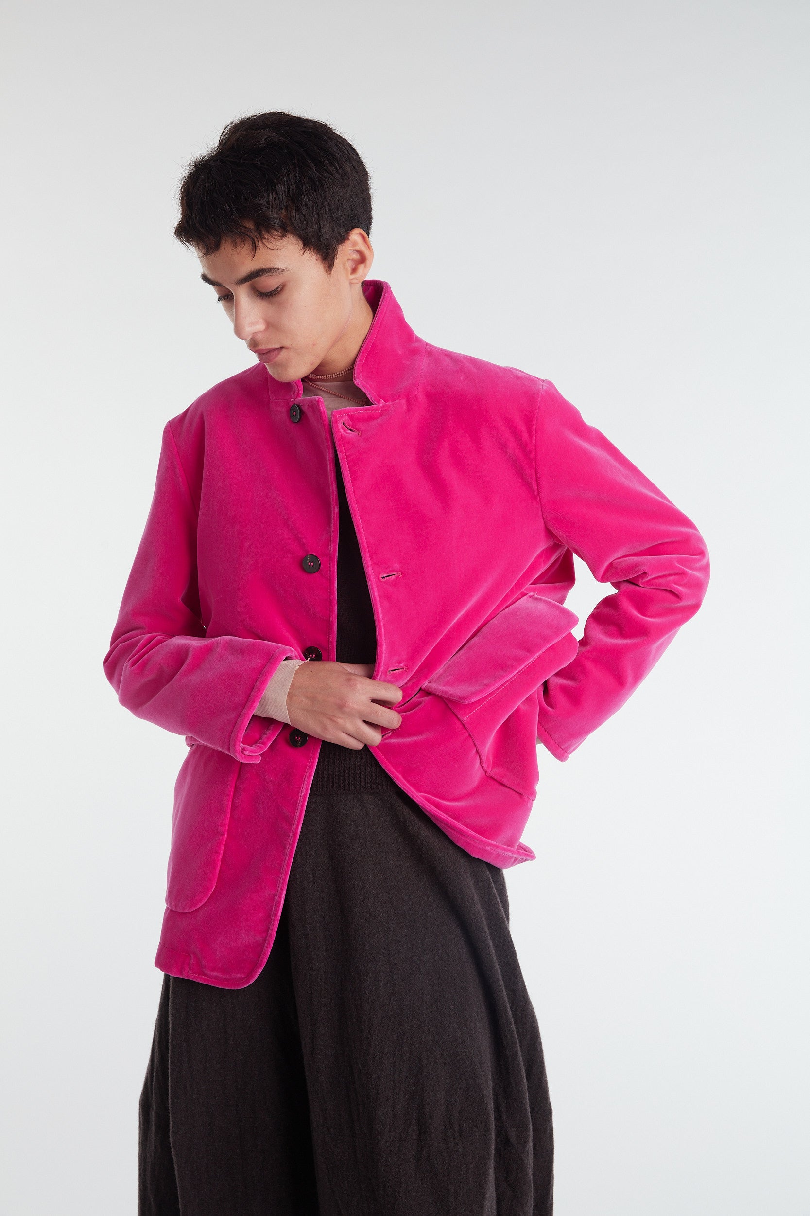 Straight-cut jacket with oversized fit in dry cotton drill, garment-dyed in biscuit color: dropped shoulder, high mandarin collar, central masculine fastening with four buttons, the first of which is diagonal, two large patch pockets and with flap, cuff with vent and three small buttons, rounded front hem. Unlined and finished internally with cotton bias.