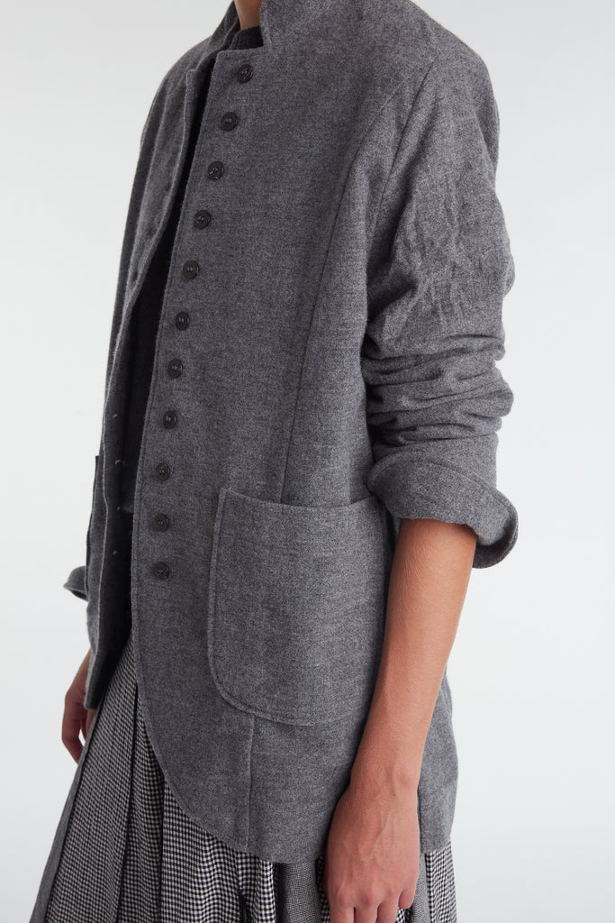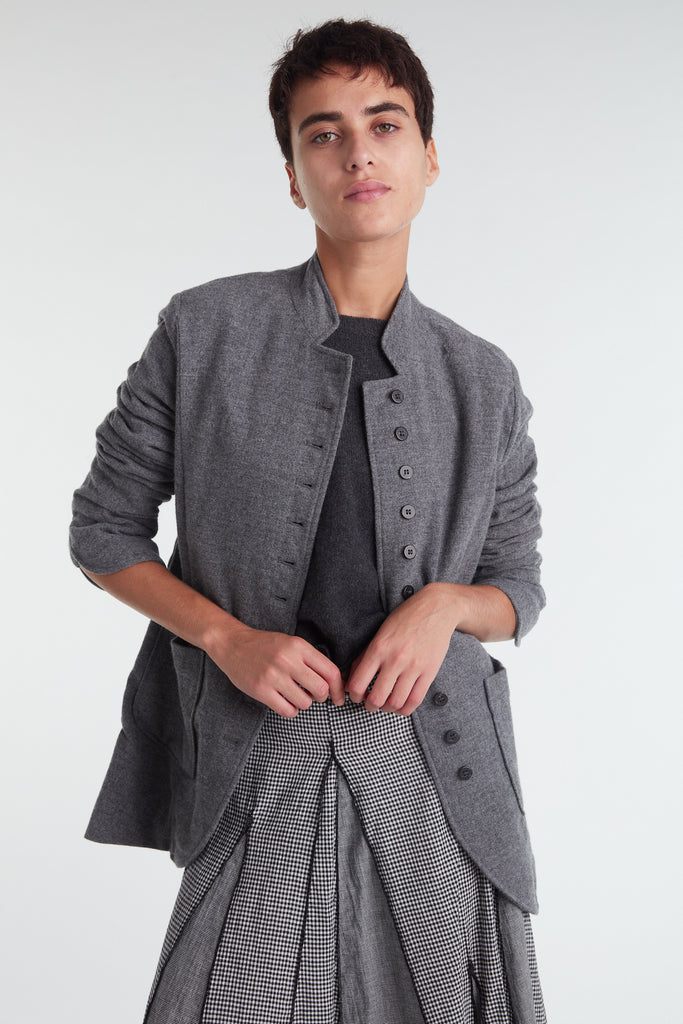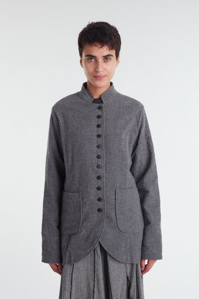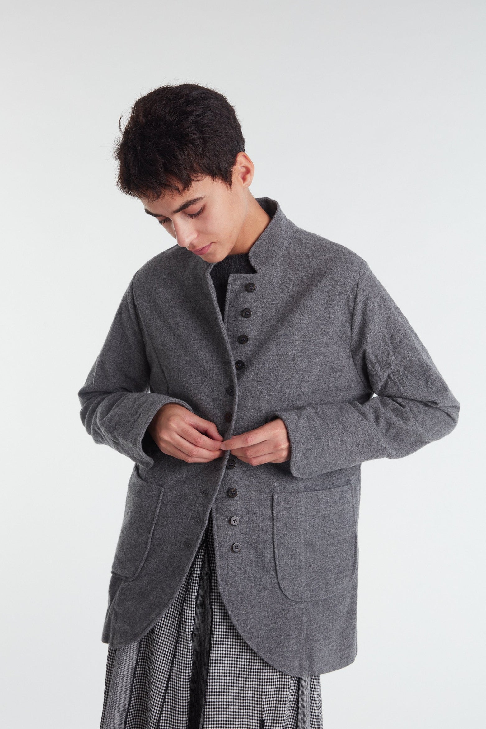 Manteau coupe évasée en velours lisse rouille orangé à broderies florales : petit col pointu, manche kimono, poches passepoilées diagonales à bord haut, fermeture centrale par 10 petits boutons en nacre, plus un petit bouton avec boutonnière lâche en coton sous le col. Doublé en mélange de coton et rembourré avec Thermore original.